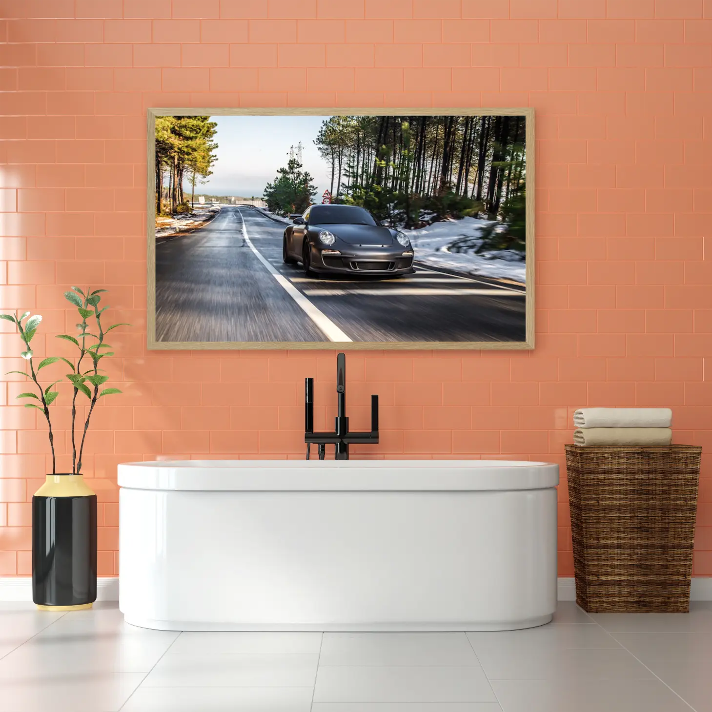 تجسد هذه اللوحة الفنية مشهدًا ساحرًا يجمع بين جمال الطبيعة وروعة السرعة. تظهر سيارة رياضية أنيقة تتنقل بسلاسة على طريق محاط بالأشجار الخضراء، مما يضفي إحساسًا بالحركة والحيوية. تعكس الألوان الزاهية والظلال المتناغمة جوًا من الإثارة والتشويق، مما يجعلها قطعة فنية مثالية تضفي لمسة من الأناقة على أي مساحة. إن هذا العمل الفني لا يقتصر فقط على كونه مجرد ديكور جداري، بل هو تعبير عن نمط حياة متجدد ومليء بالطاقة.