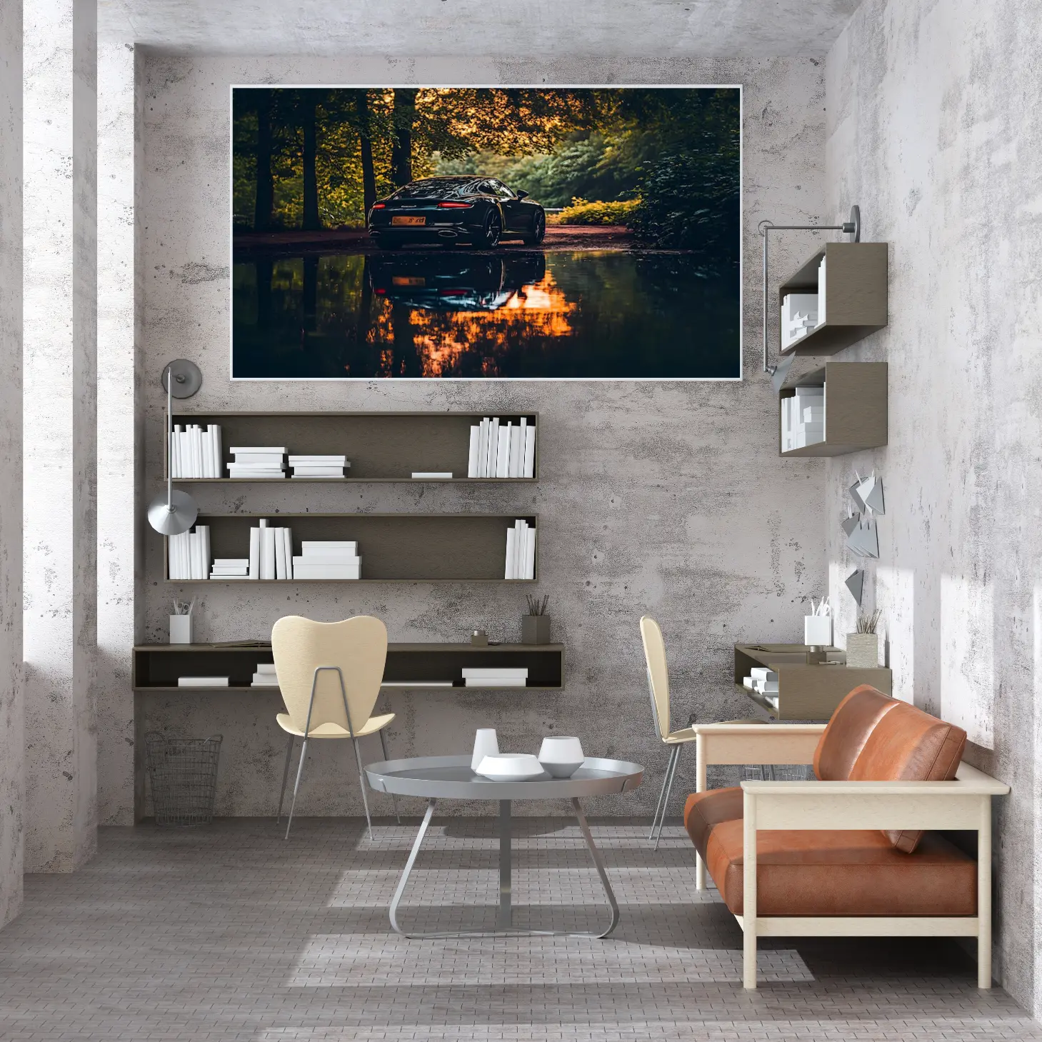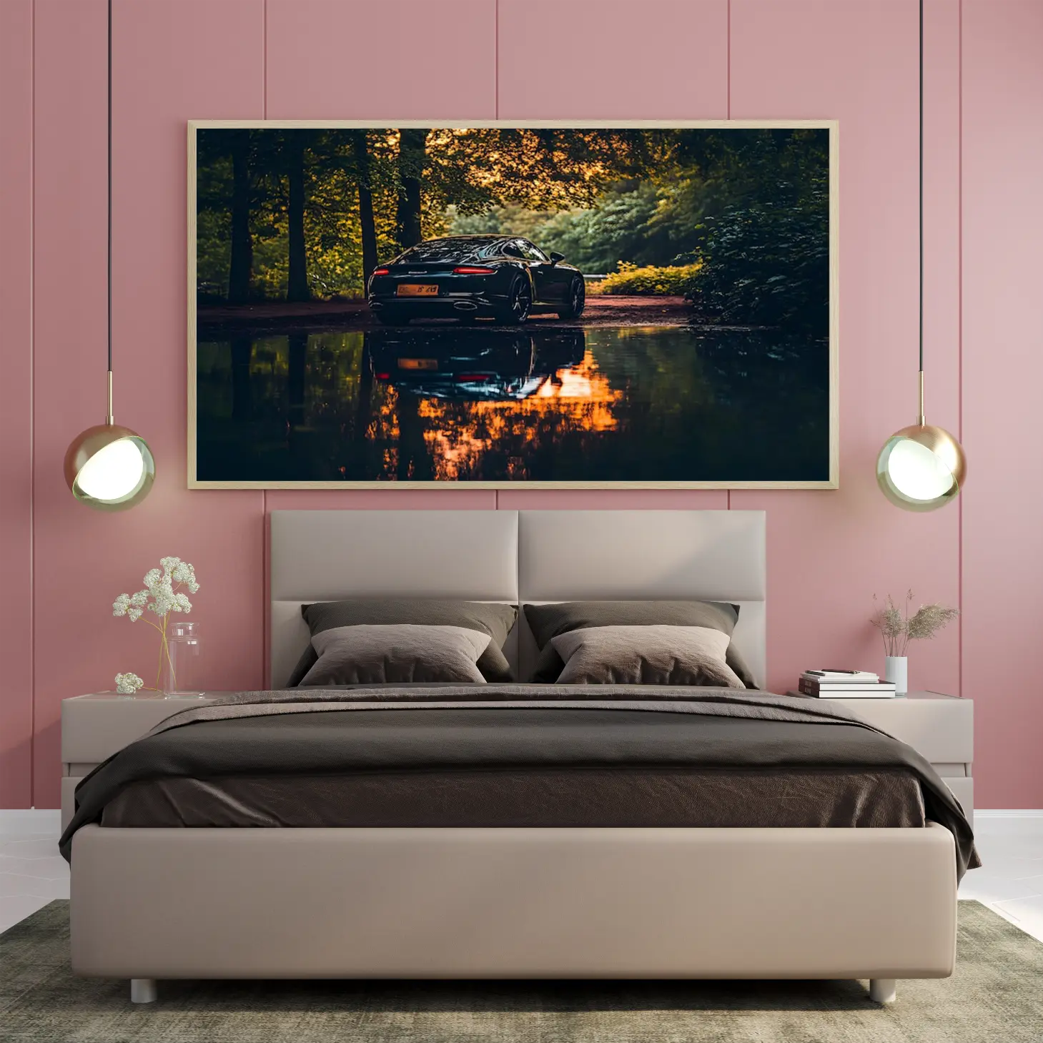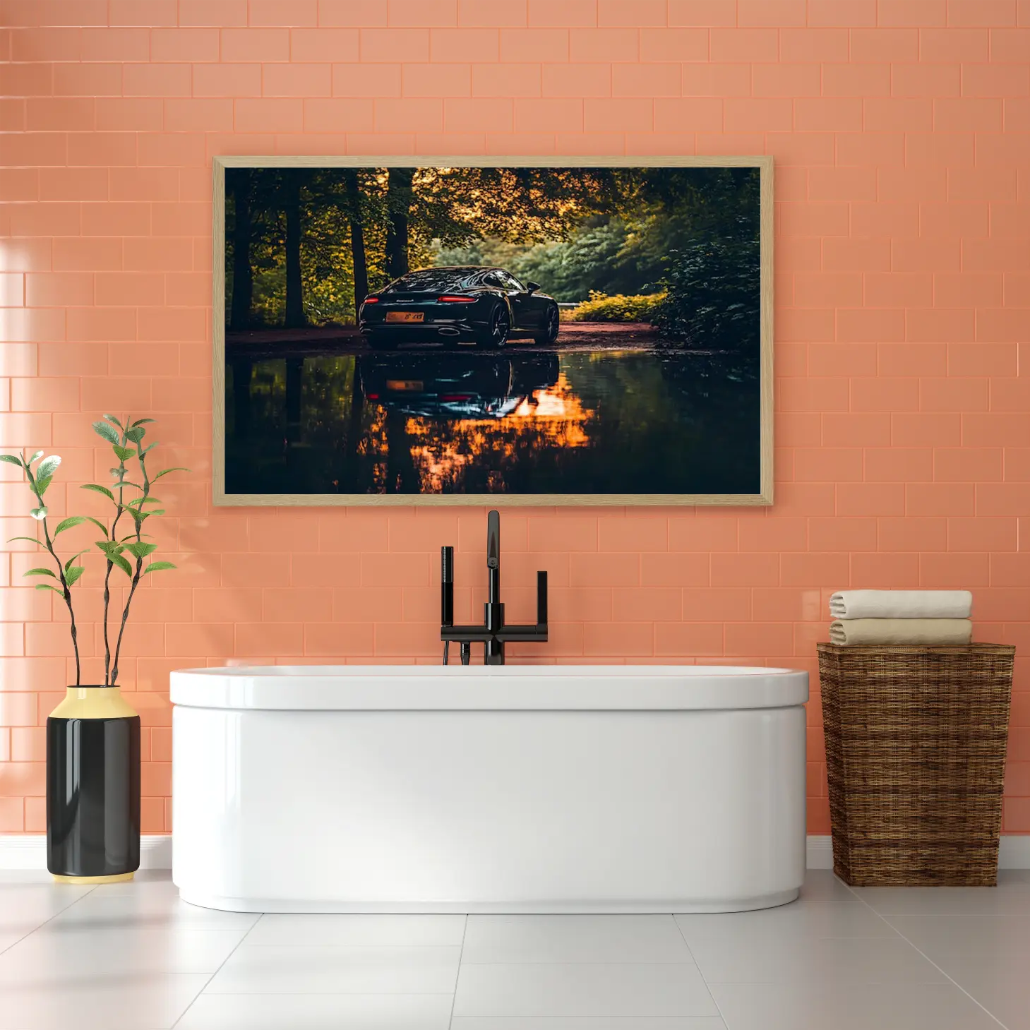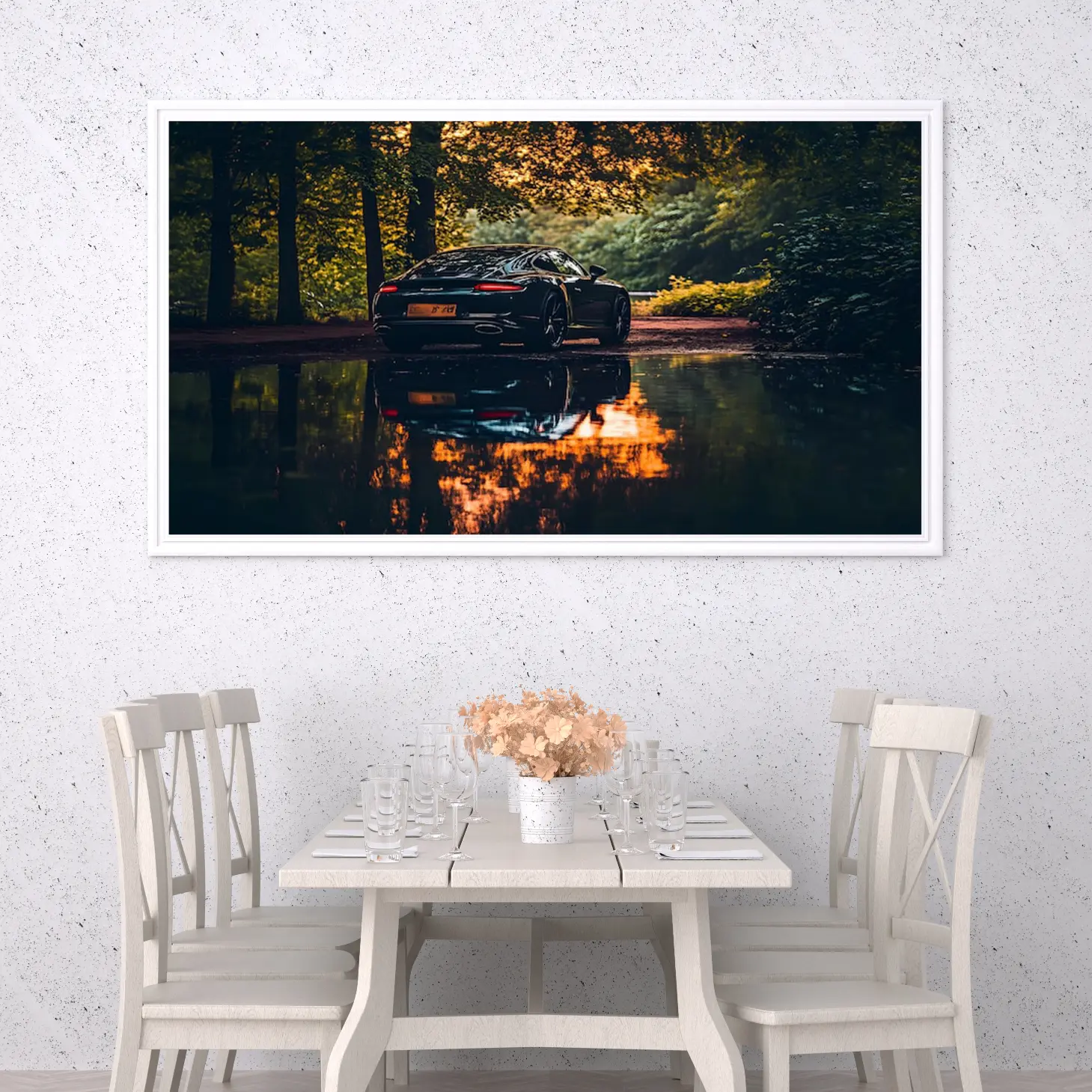 تجسد هذه اللوحة الفنية لحظة ساحرة، حيث تتألق سيارة فاخرة بلونها الأسود اللامع وسط طبيعة خلابة. تنعكس الألوان الدافئة لأشعة الشمس في بركة الماء القريبة، مما يخلق تباينًا رائعًا مع ظلال الأشجار المحيطة. هذا المشهد لا يضفي جمالًا بصريًا فحسب، بل يبعث أيضًا شعورًا بالهدوء والرفاهية، مما يجعله خيارًا مثاليًا لإضفاء لمسة من الأناقة على أي مساحة.