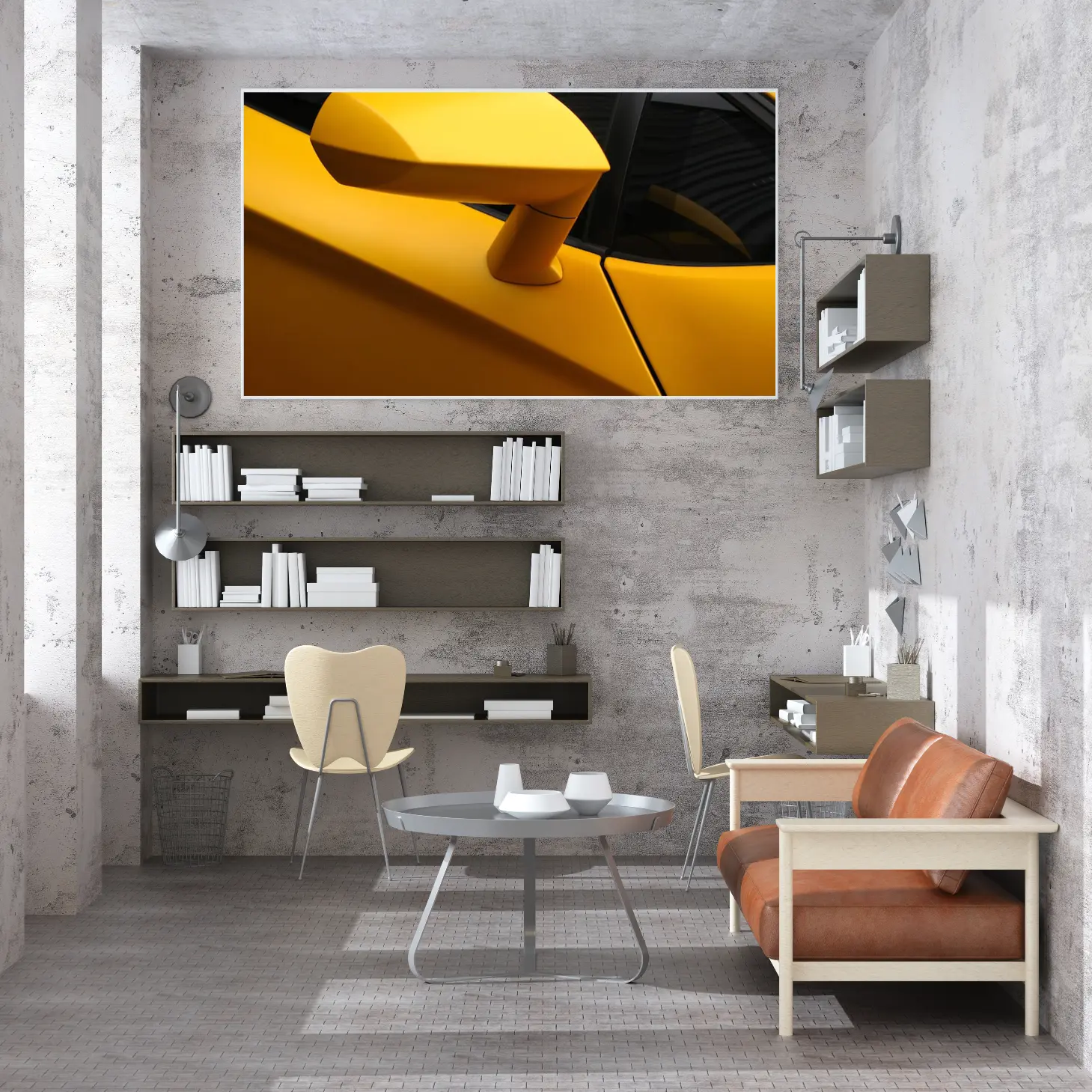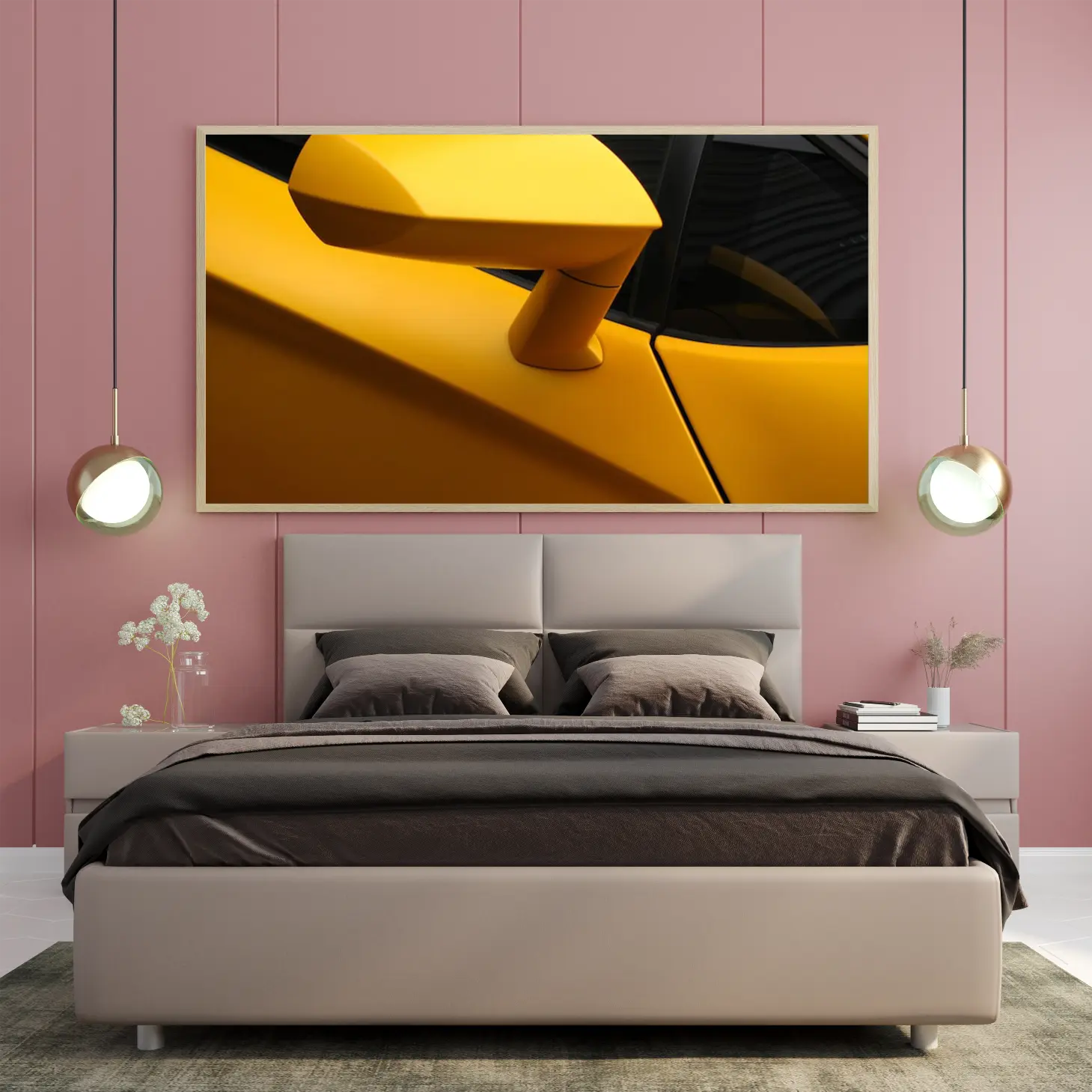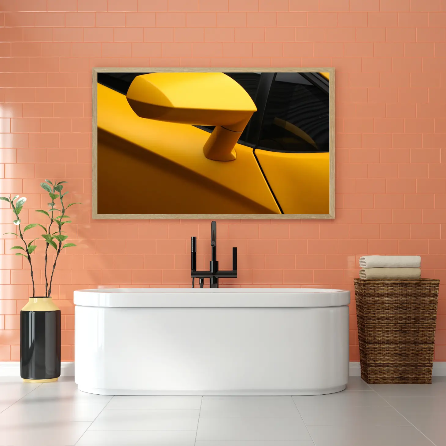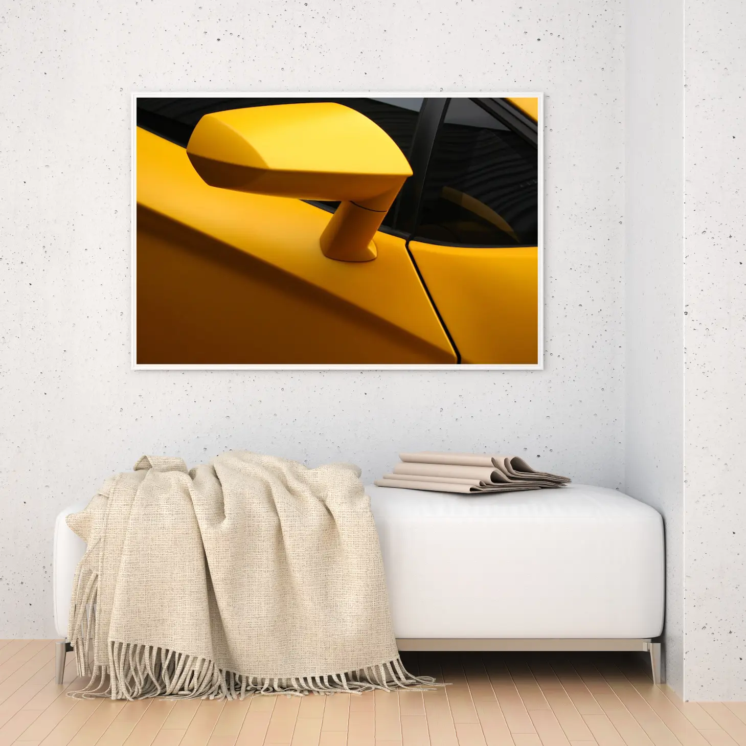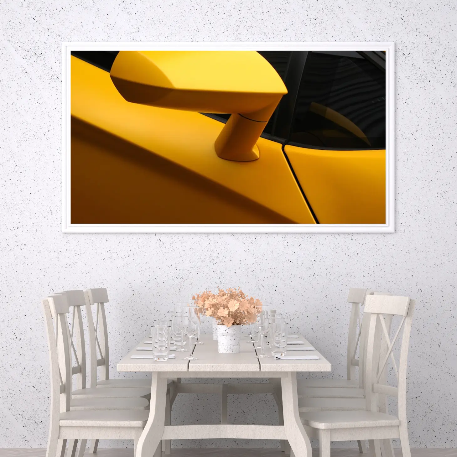 تجسد هذه اللوحة الفنية جماليات التصميم العصري من خلال تصوير دقيق لجزء من سيارة رياضية بلون أصفر زاهي، مما يضفي إحساسًا بالحيوية والطاقة على أي مساحة تُعرض فيها. يبرز الشكل الانسيابي والتفاصيل الدقيقة، مما يجعلها قطعة فنية مثالية تضفي لمسة من الفخامة والحداثة على الديكور المنزلي أو المكتبي. إن وجود هذه اللوحة في المكان يخلق أجواءً من الإثارة والتشويق، مما يجعلها خيارًا مثاليًا لعشاق السيارات والفن على حد سواء.