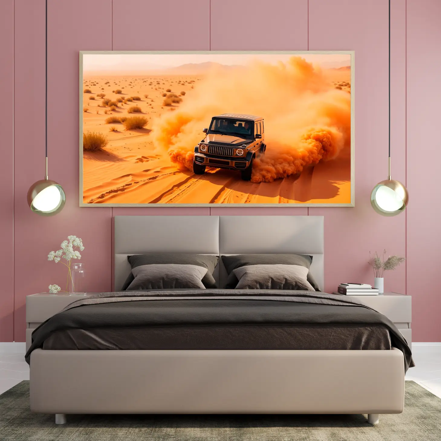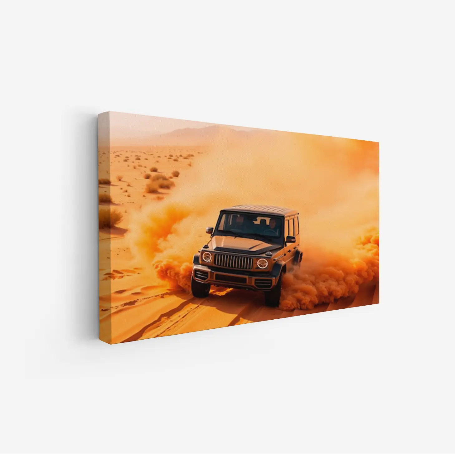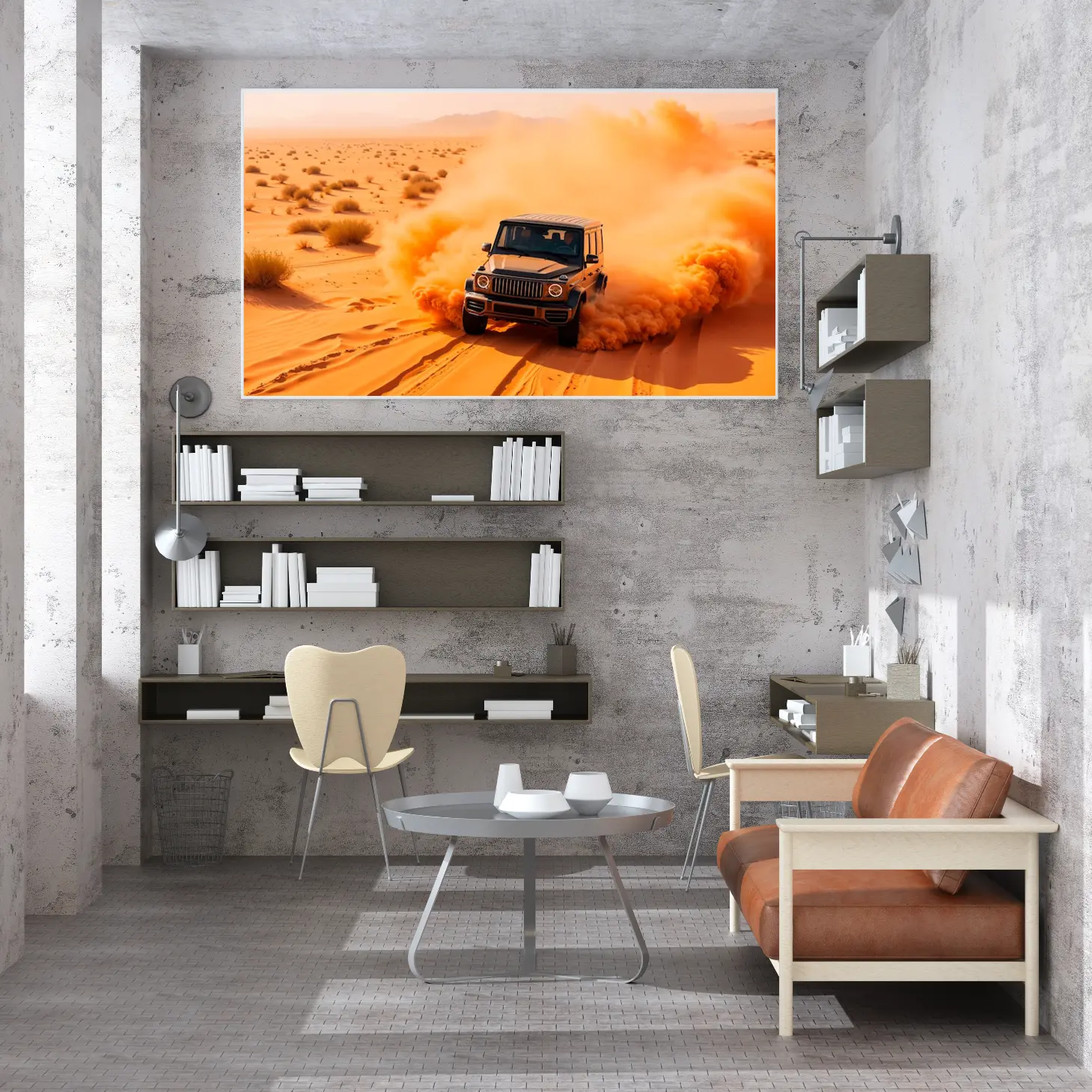 تتجلى في هذه اللوحة مشهدٌ رائع يجسد قوة المغامرة وروح الحرية في الصحراء. السيارة تتقدم بخطى واثقة وسط سحب الغبار الذهبي، مما يضفي شعورًا بالحركة والديناميكية. الألوان الدافئة تخلق أجواءً مثيرة، حيث تندمج ظلال البرتقالي مع رمال الصحراء، مما يعكس جمال الطبيعة وقوة الآلة في آن واحد. هذه القطعة الفنية ليست مجرد ديكور جداري، بل هي تعبير عن نمط حياة يفضل المغامرة والانطلاق.