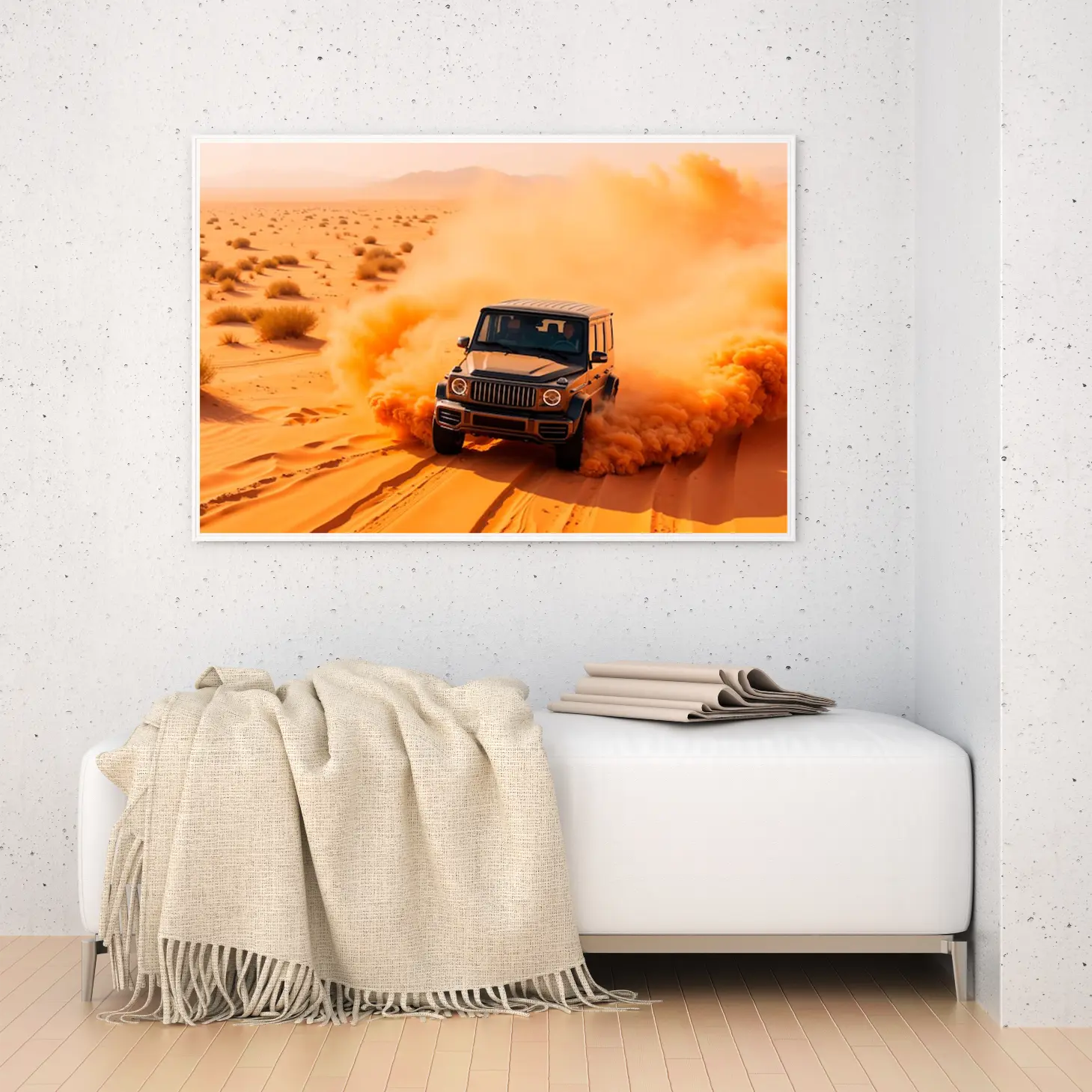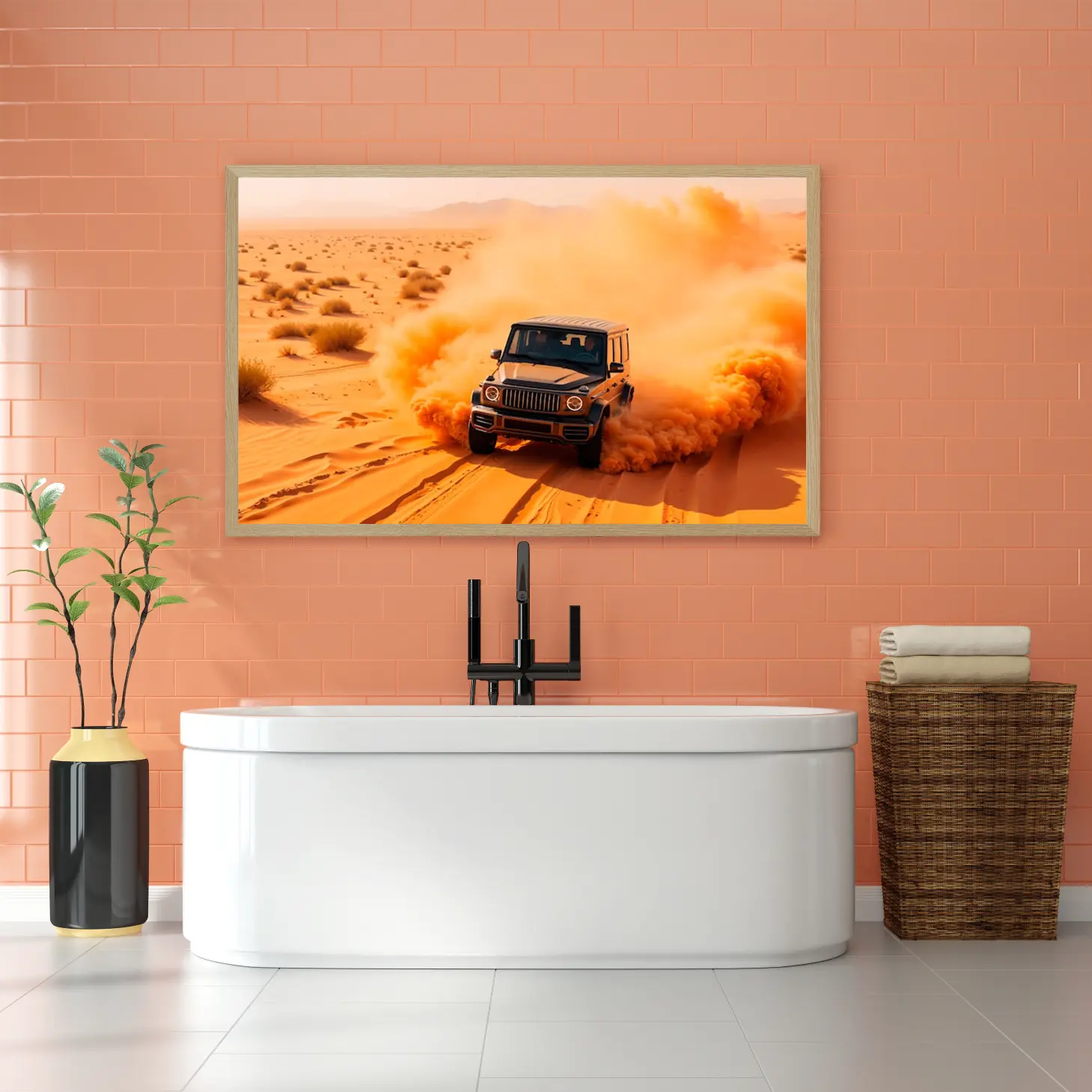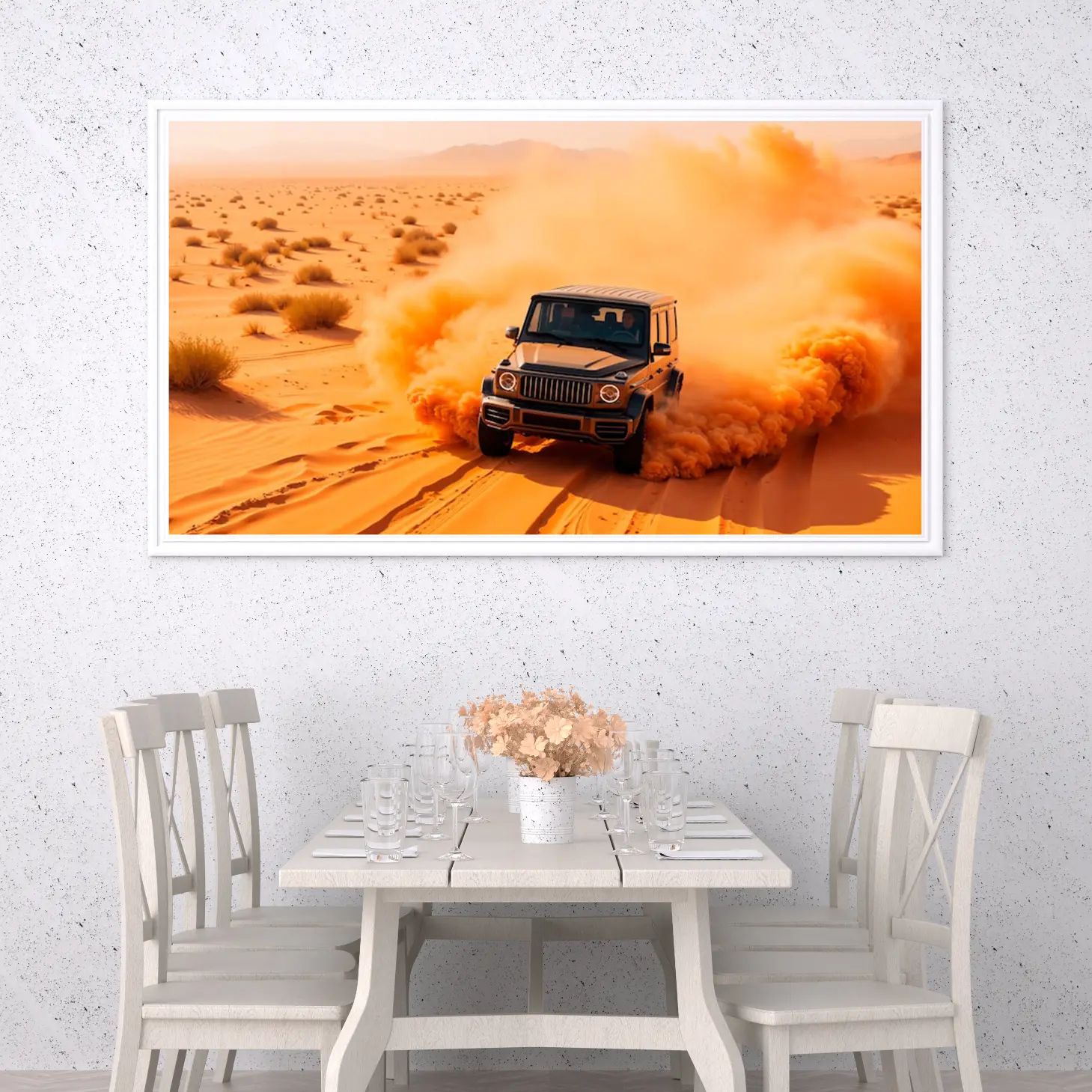 تتجلى في هذه اللوحة مشهدٌ رائع يجسد قوة المغامرة وروح الحرية في الصحراء. السيارة تتقدم بخطى واثقة وسط سحب الغبار الذهبي، مما يضفي شعورًا بالحركة والديناميكية. الألوان الدافئة تخلق أجواءً مثيرة، حيث تندمج ظلال البرتقالي مع رمال الصحراء، مما يعكس جمال الطبيعة وقوة الآلة في آن واحد. هذه القطعة الفنية ليست مجرد ديكور جداري، بل هي تعبير عن نمط حياة يفضل المغامرة والانطلاق.