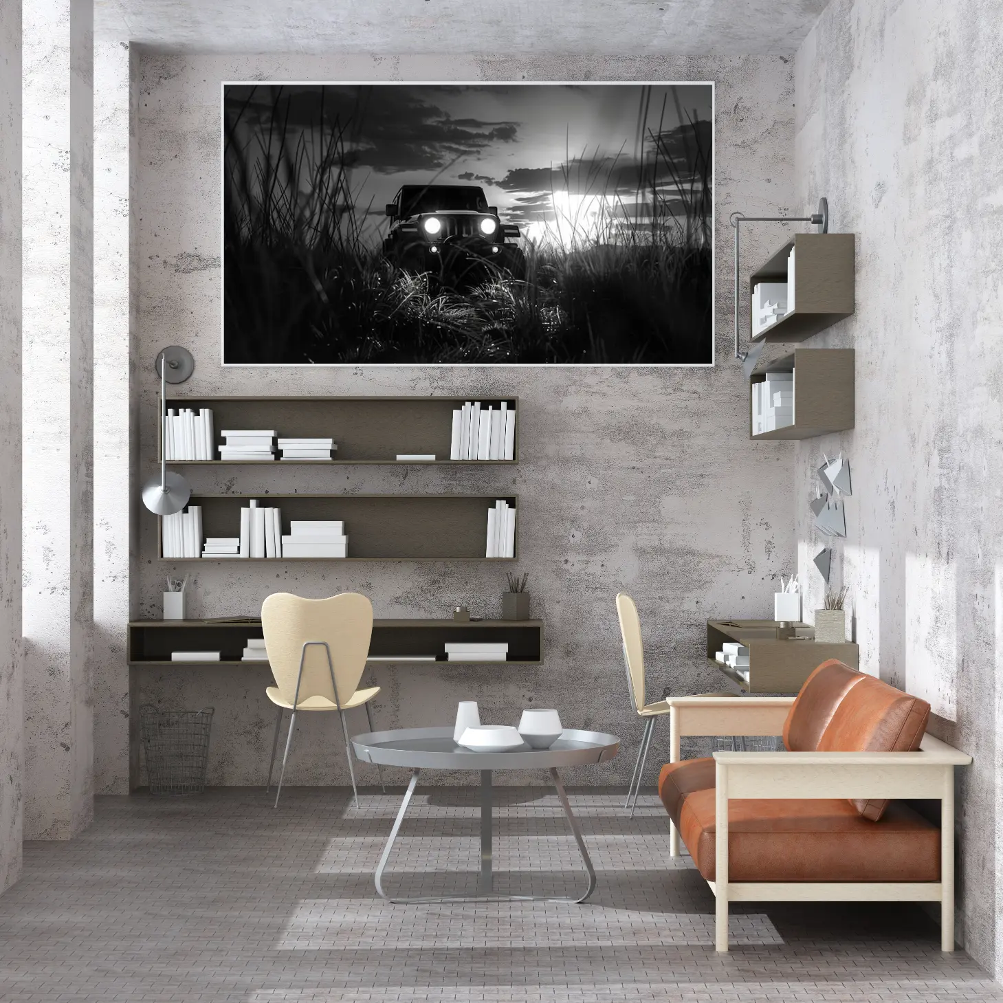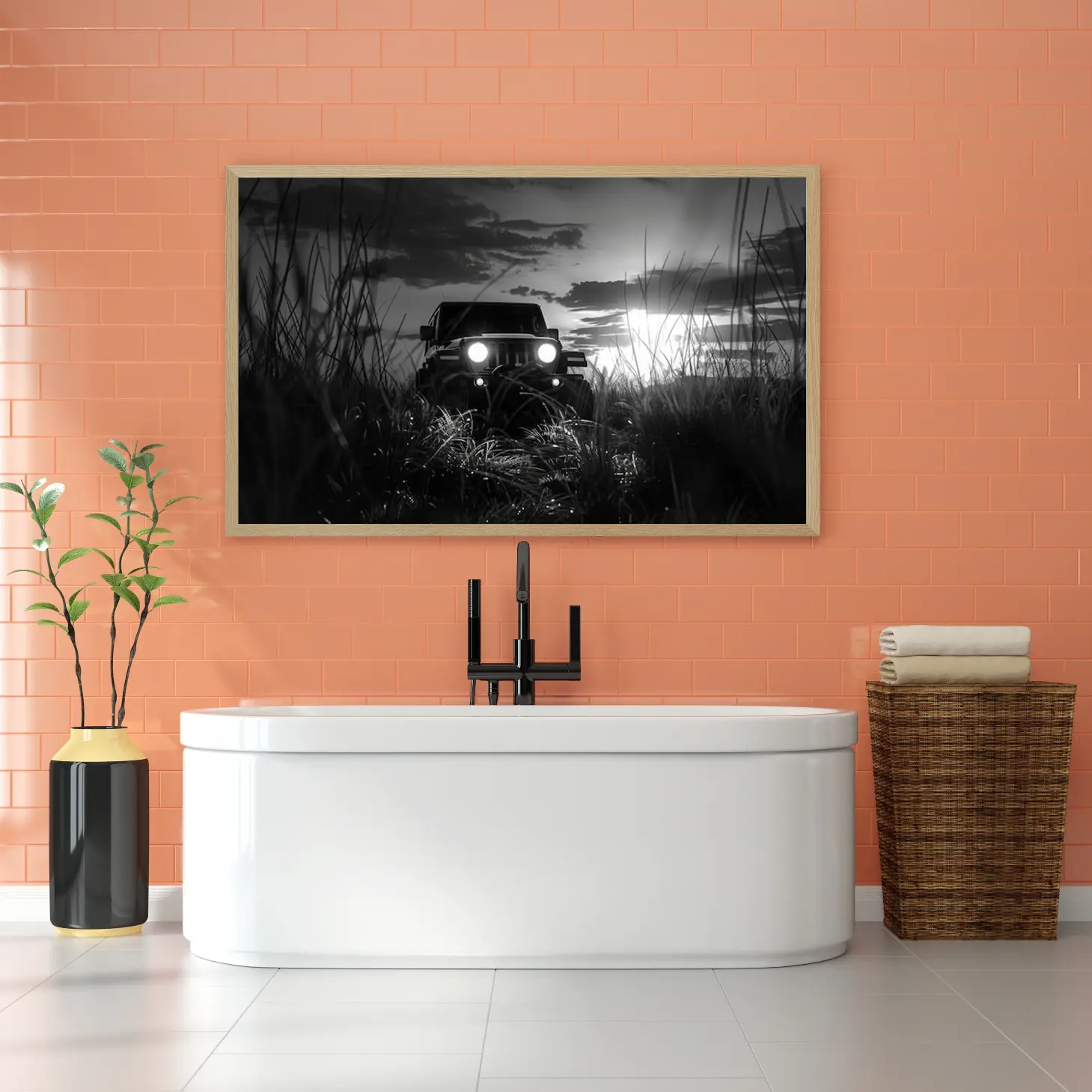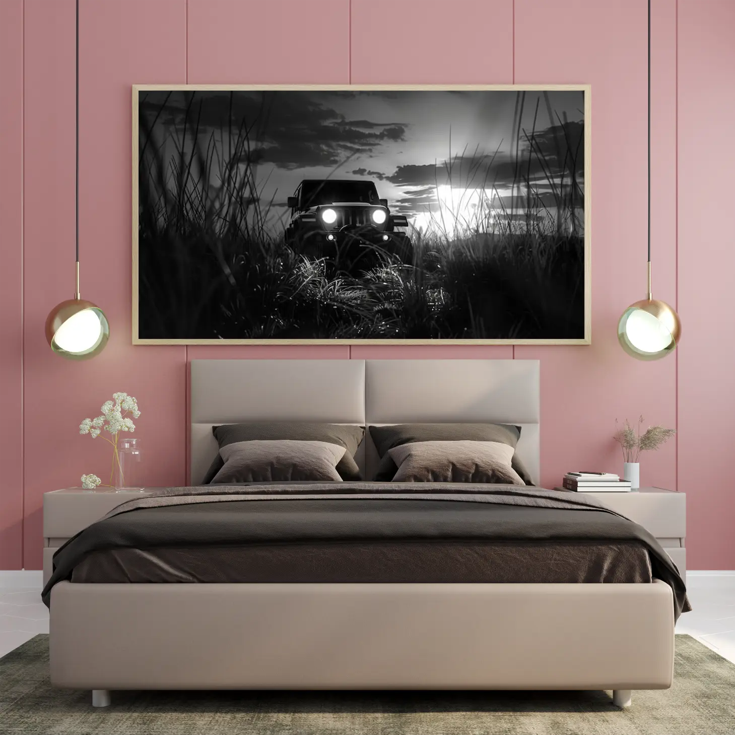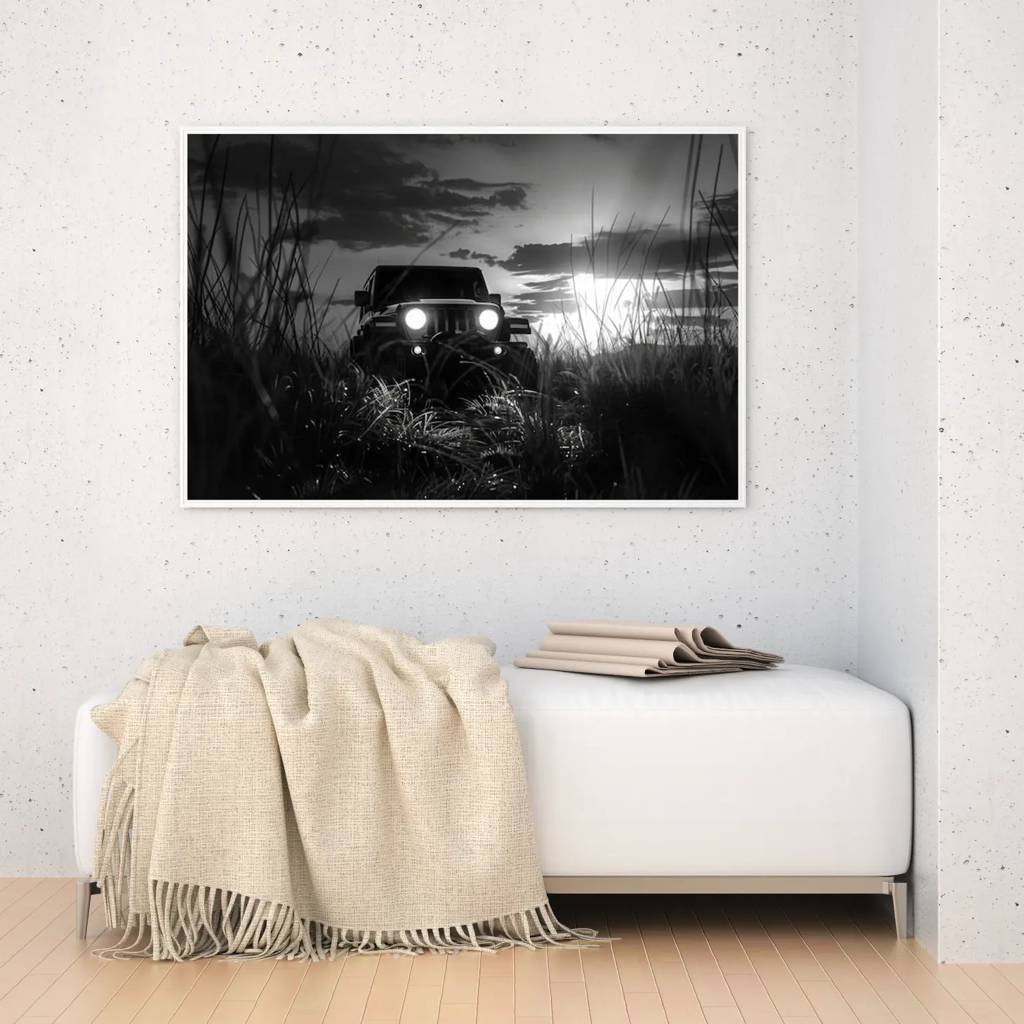 تتجلى في هذه اللوحة الفنية مشهدٌ ساحر يجسد لحظة مثيرة من الحياة البرية، حيث يبرز فيها مركبة قوية تتحدى الطبيعة. تتناغم الألوان الأحادية مع تفاصيل العشب المحيط، مما يخلق إحساسًا بالهدوء والتشويق في آن واحد. تعكس الأضواء الساطعة من المصابيح الأمامية للمركبة قوة الشخصية والمغامرة، مما يجعلها قطعة فنية تضيف لمسة من الإثارة إلى أي مساحة.