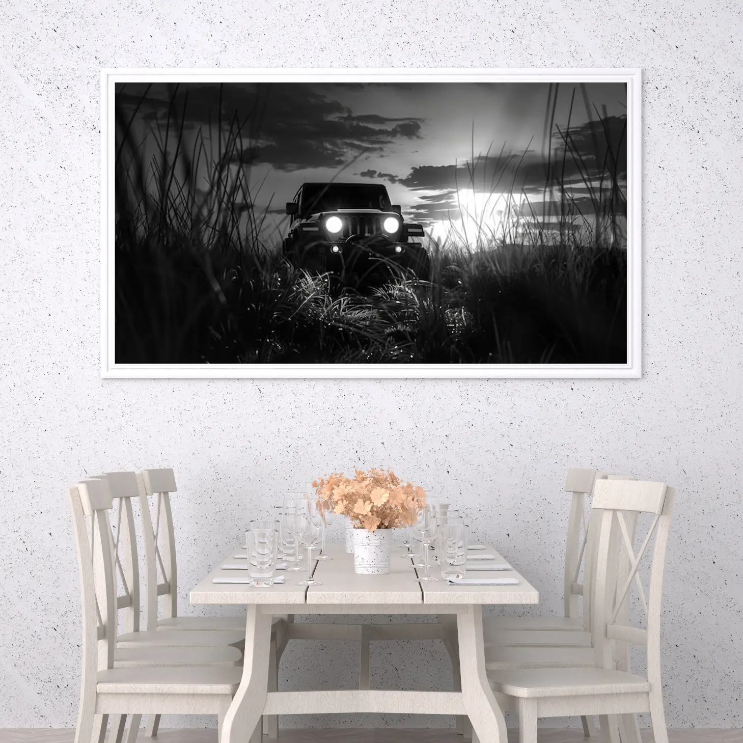 استمتع بجمال هذه اللوحة الفنية التي تلتقط لحظة ساحرة من الطبيعة، حيث يبرز الضوء الخافت لسيارة في أفق غامض بين الأعشاب. بتصميمها الأنيق، تعد هذه اللوحة خيارًا مثاليًا لإضفاء لمسة من الفخامة على أي مساحة، مع توفرها بمقاسات متعددة وإطارات متنوعة تناسب ذوقك. إنها هدية تعبر عن الذوق الرفيع، مثالية للمناسبات الخاصة التي تترك أثرًا لا يُنسى.