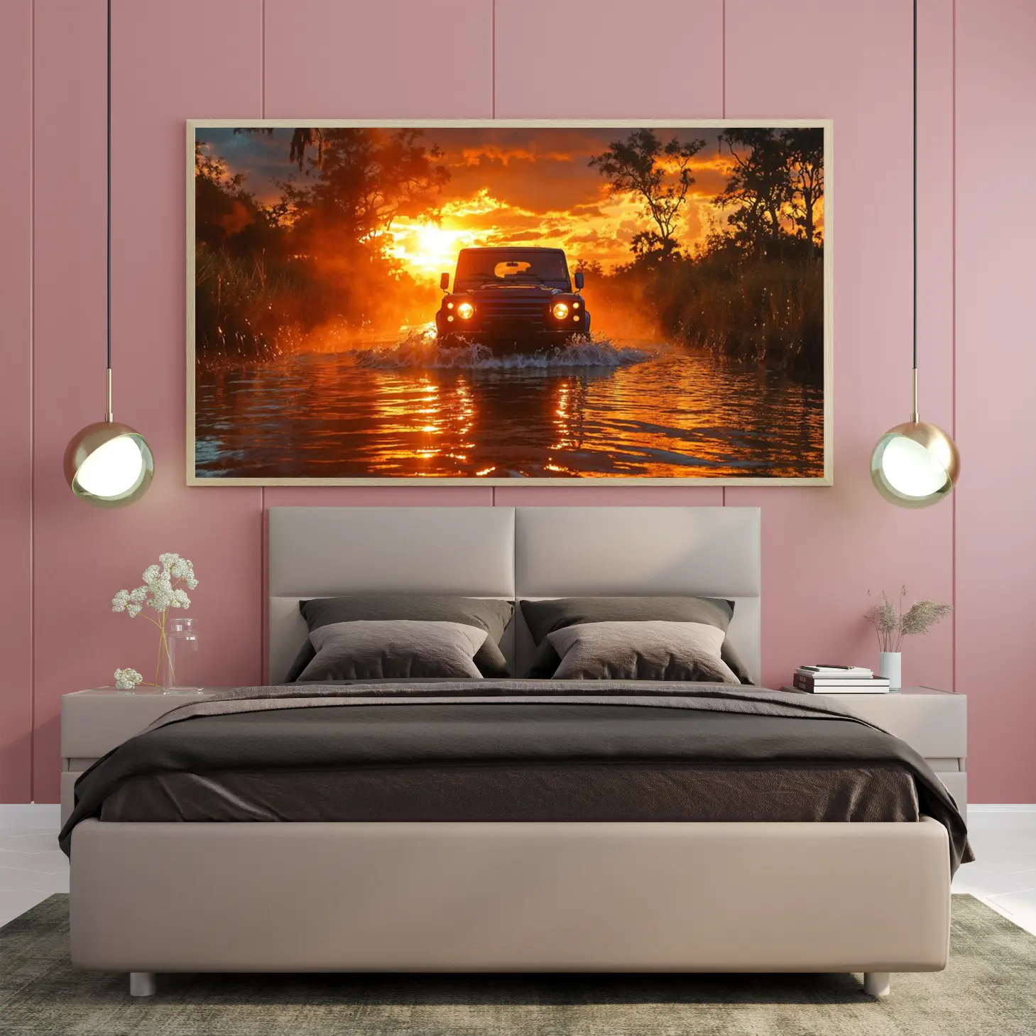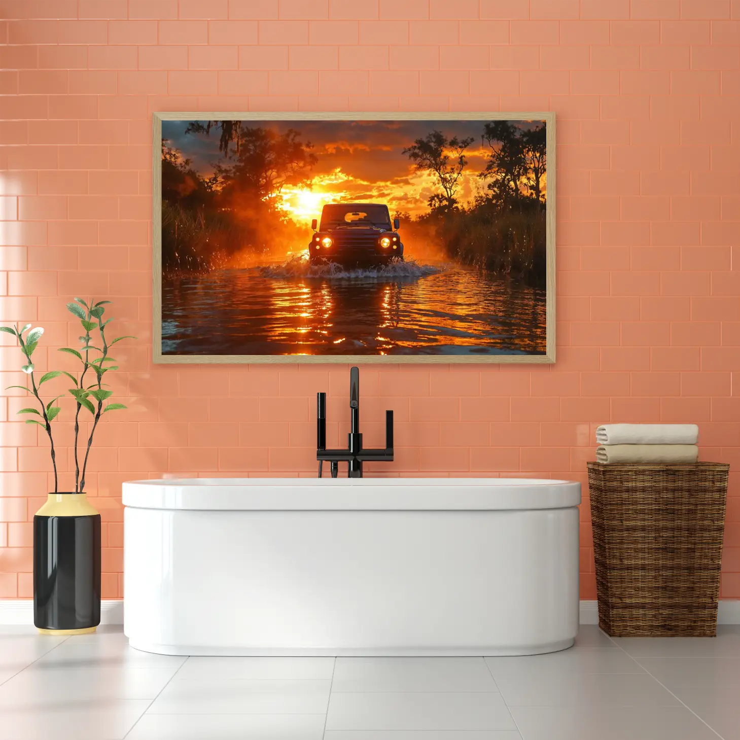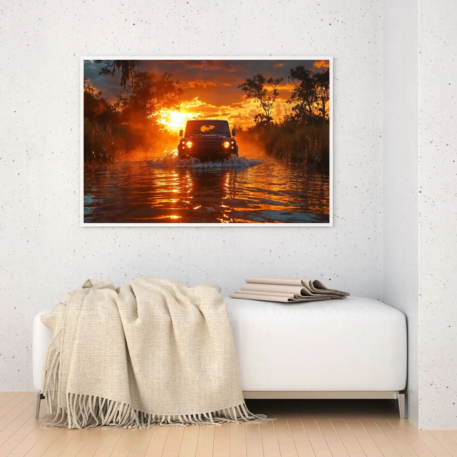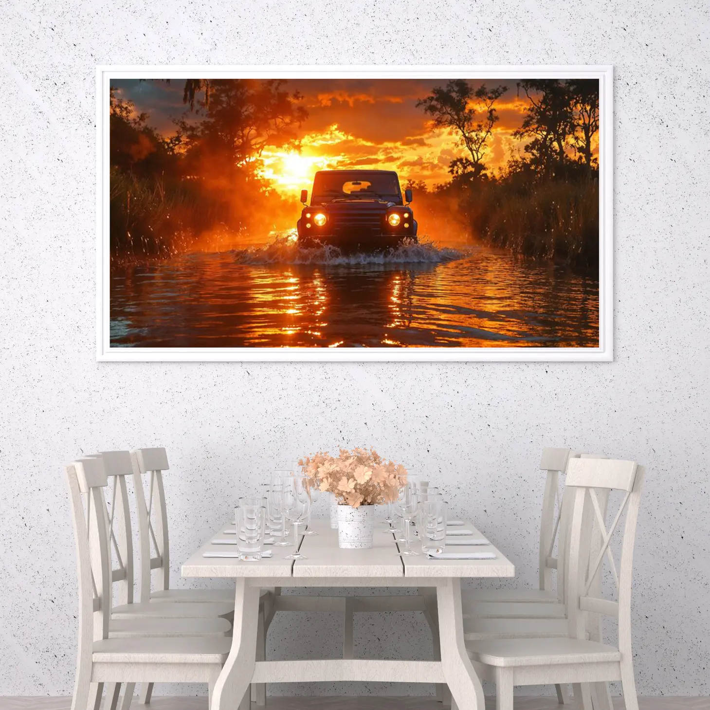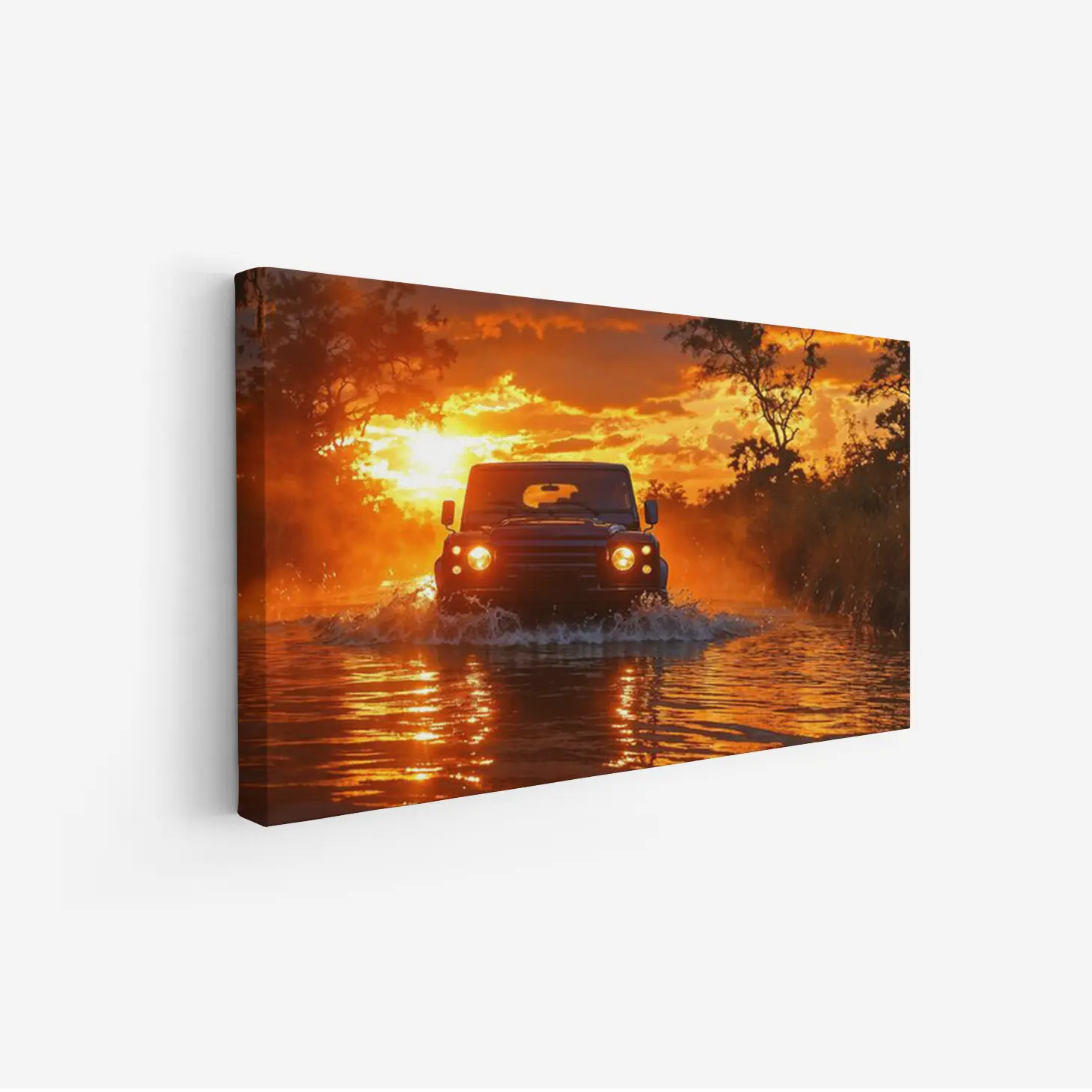تجسد هذه اللوحة لحظة ساحرة من الطبيعة، حيث تتداخل ألوان الغروب المذهلة مع مشهد مثير لسيارة تتحدى المياه. تنبعث من الخلفية أشعة الشمس الذهبية، مما يضفي على الأجواء شعورًا بالحرية والمغامرة. تعكس هذه الصورة روح الحياة البرية، مما يجعلها إضافة مثالية لأي مساحة، حيث تخلق جوًا من الحيوية والتشويق.