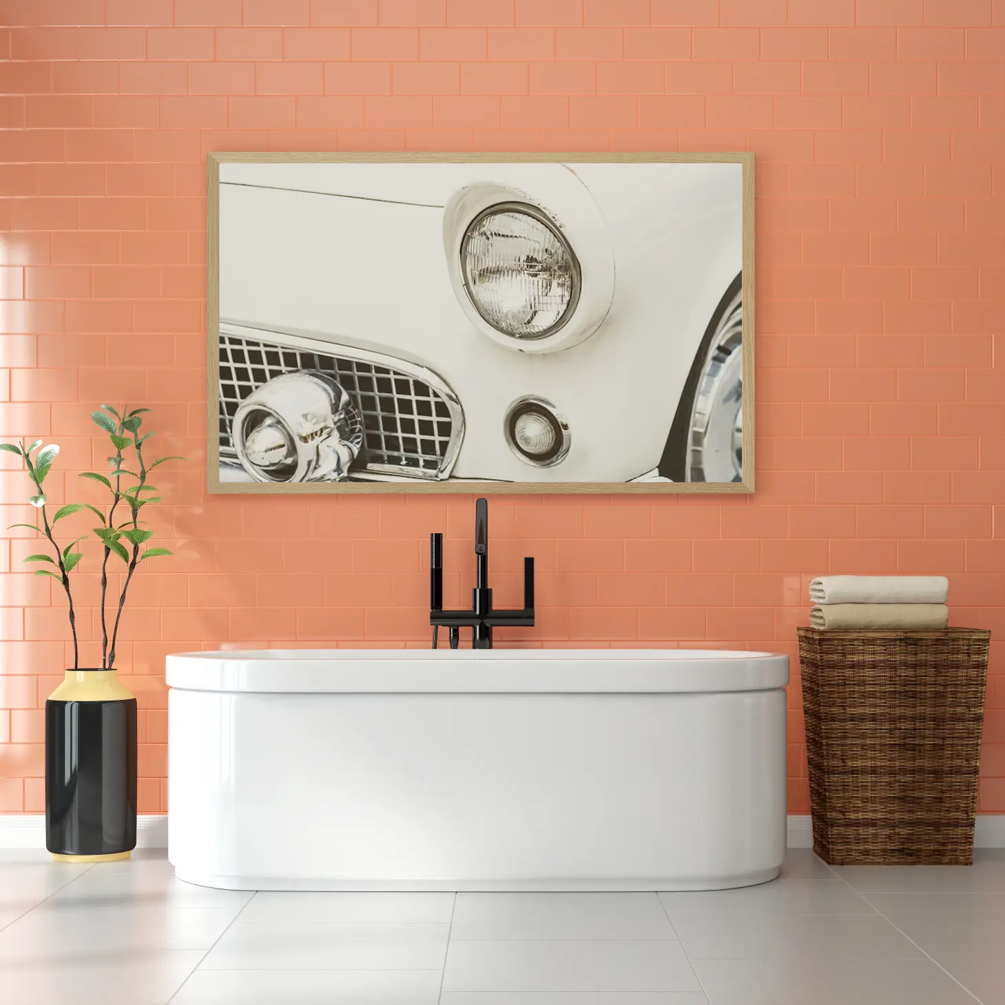 تتجلى في هذه اللوحة الفنية لمسة من الأناقة الكلاسيكية، حيث يبرز شكل السيارة القديمة بشكل مميز، مما يضفي على المكان إحساسًا بالحنين إلى الماضي وجماليات الزمن الجميل. إن التفاصيل الدقيقة في التصميم، من المصابيح اللامعة إلى الشبكة الأمامية، تخلق جوًا من الفخامة والرقي، مما يجعلها قطعة فنية مثالية تضفي لمسة من التميز على أي مساحة.