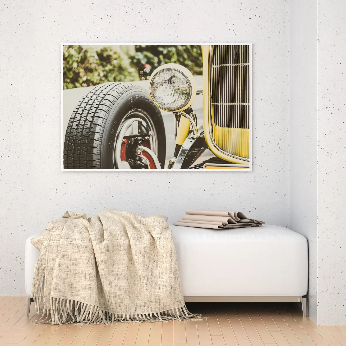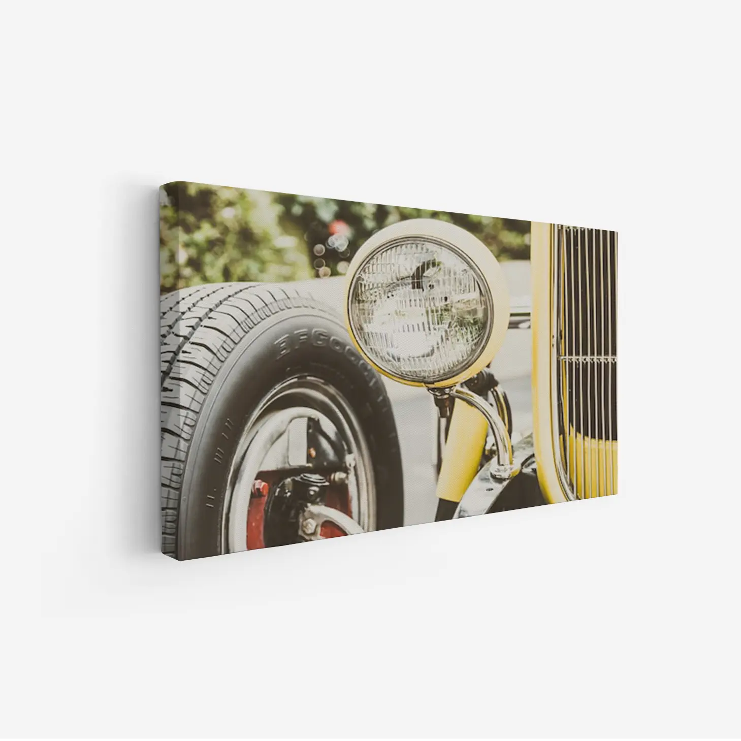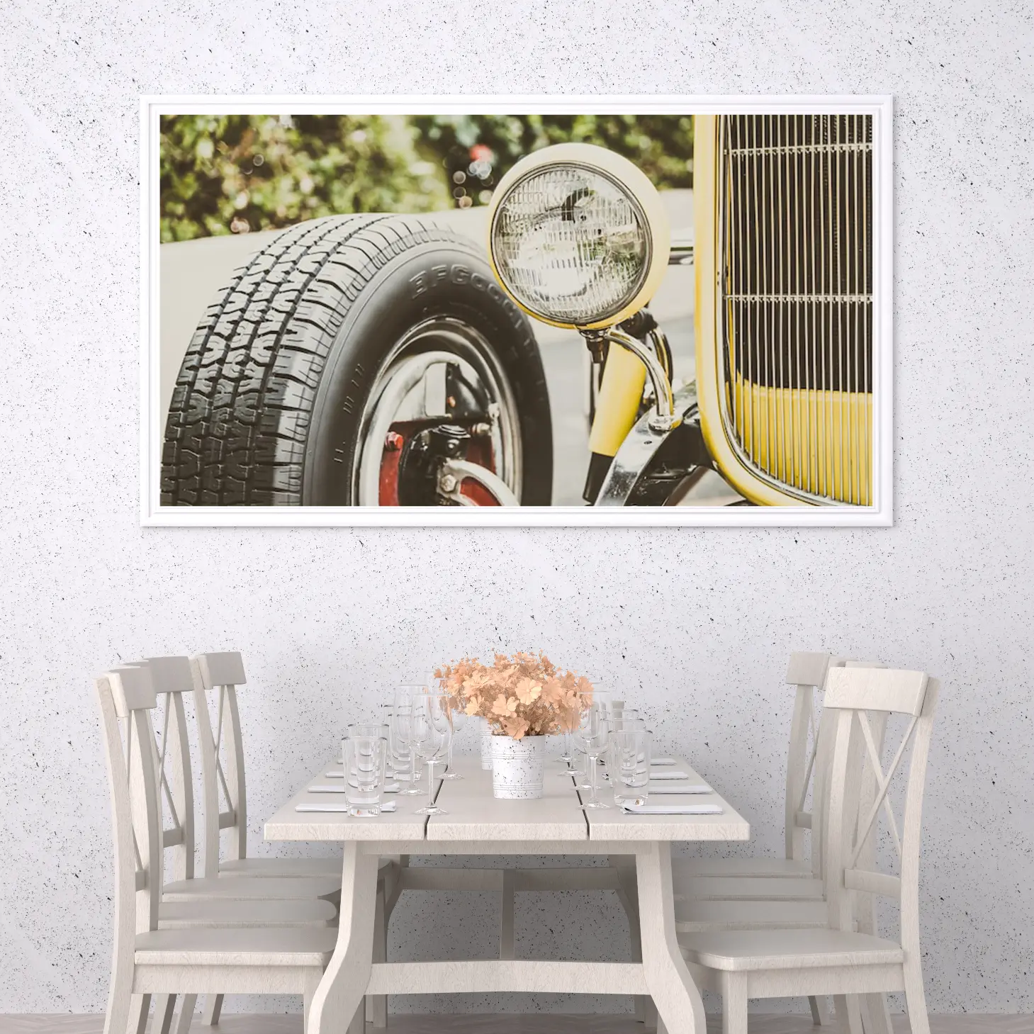 تجسد هذه اللوحة الفنية لحظة من الزمن، حيث تلتقي الأناقة الكلاسيكية مع روح المغامرة. يظهر في المشهد جزء من سيارة كلاسيكية، مع تفاصيل دقيقة تعكس جمال التصميم الهندسي. الألوان الدافئة، مثل الأصفر اللامع، تضفي حيوية على المكان، مما يجعلها خيارًا مثاليًا لإضفاء لمسة من الرقي على أي مساحة. إن تأثير هذه القطعة الفنية يمتد إلى خلق أجواء مريحة وجذابة، مما يجعلها نقطة محورية في أي ديكور منزلي.