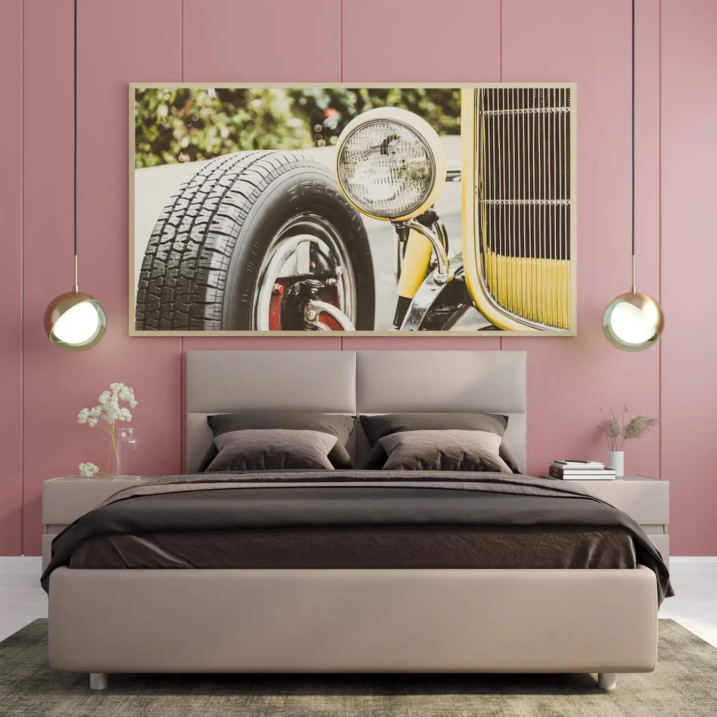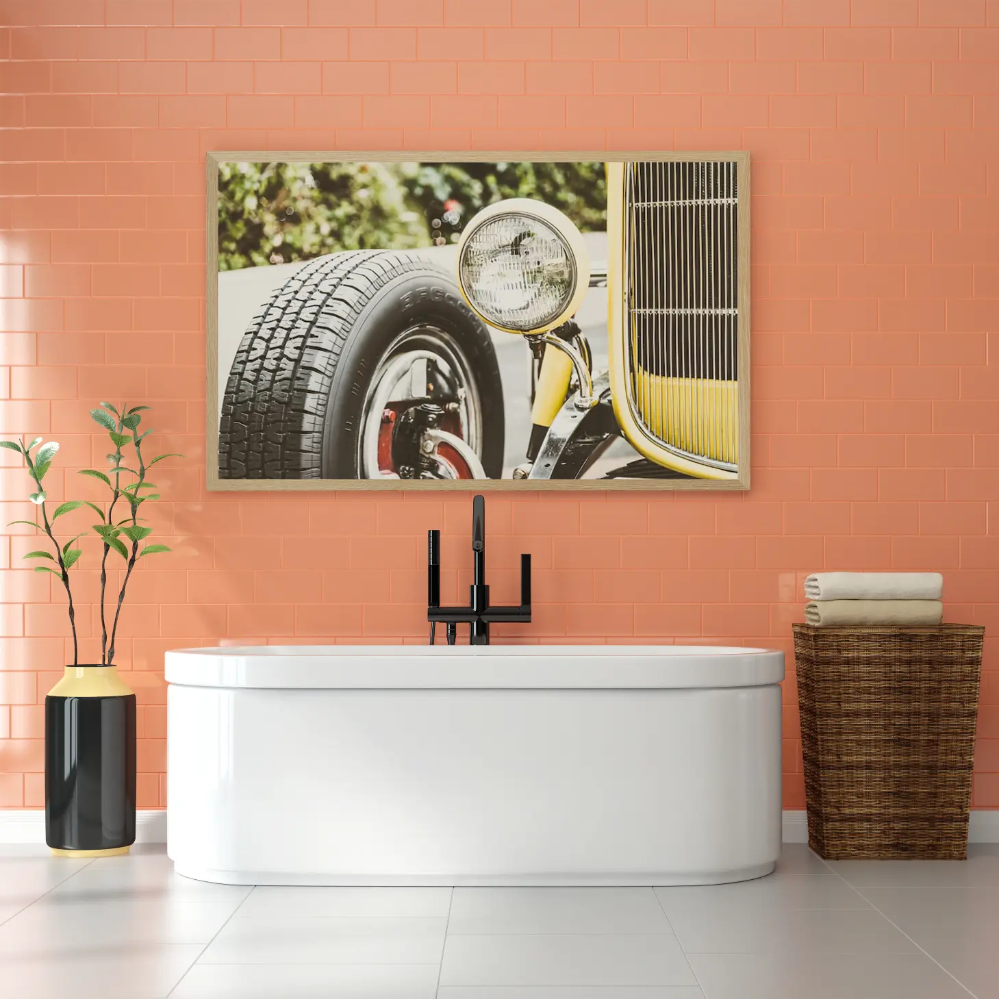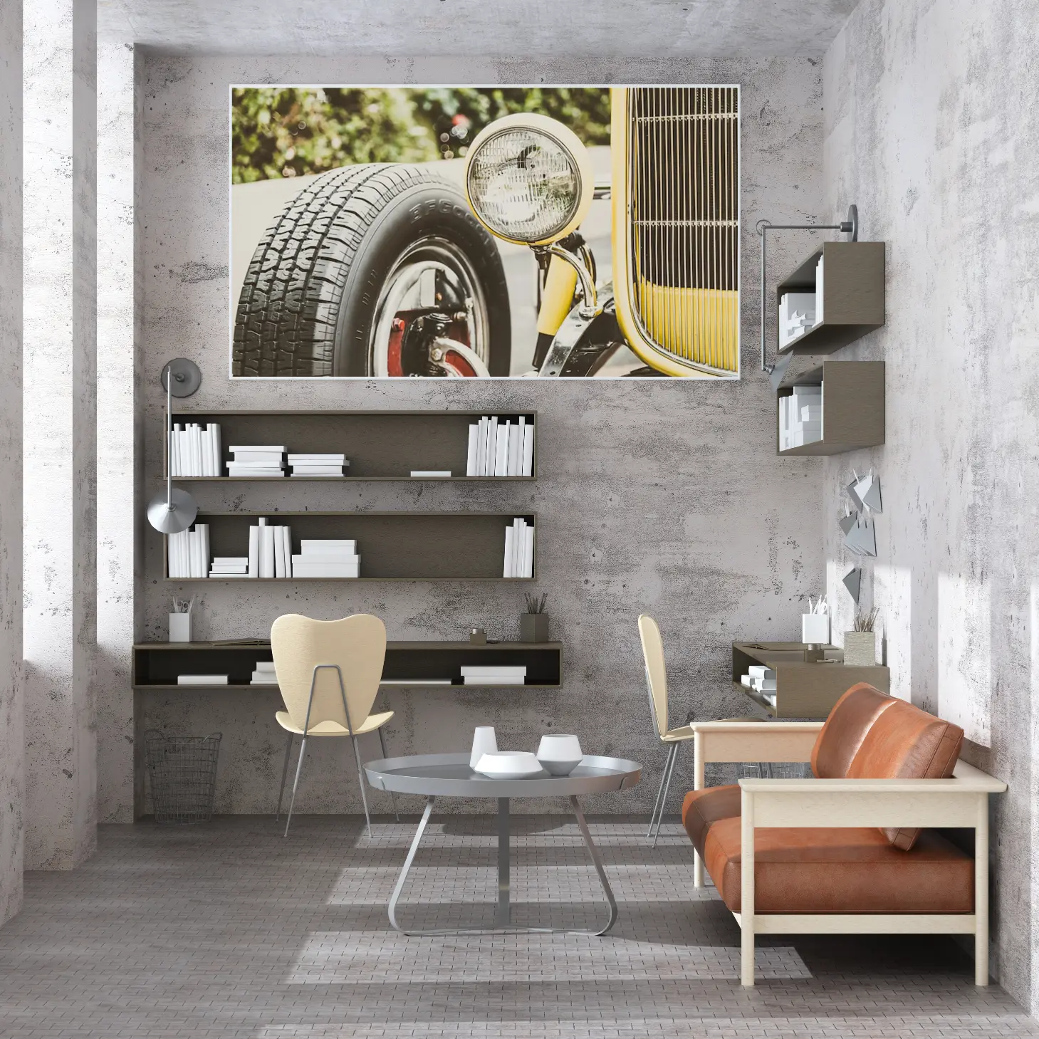 تجسد هذه اللوحة الفنية لحظة من الزمن، حيث تلتقي الأناقة الكلاسيكية مع روح المغامرة. يظهر في المشهد جزء من سيارة كلاسيكية، مع تفاصيل دقيقة تعكس جمال التصميم الهندسي. الألوان الدافئة، مثل الأصفر اللامع، تضفي حيوية على المكان، مما يجعلها خيارًا مثاليًا لإضفاء لمسة من الرقي على أي مساحة. إن تأثير هذه القطعة الفنية يمتد إلى خلق أجواء مريحة وجذابة، مما يجعلها نقطة محورية في أي ديكور منزلي.