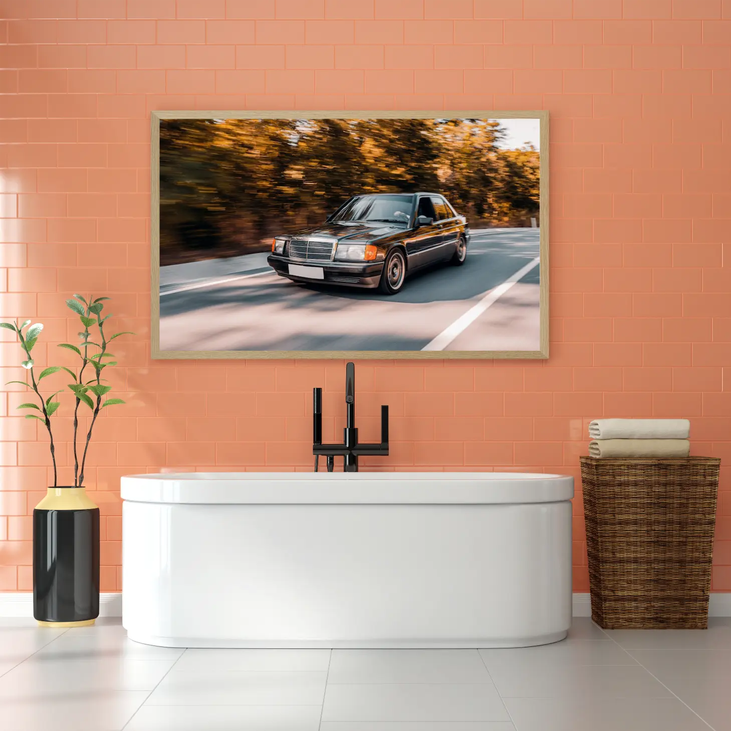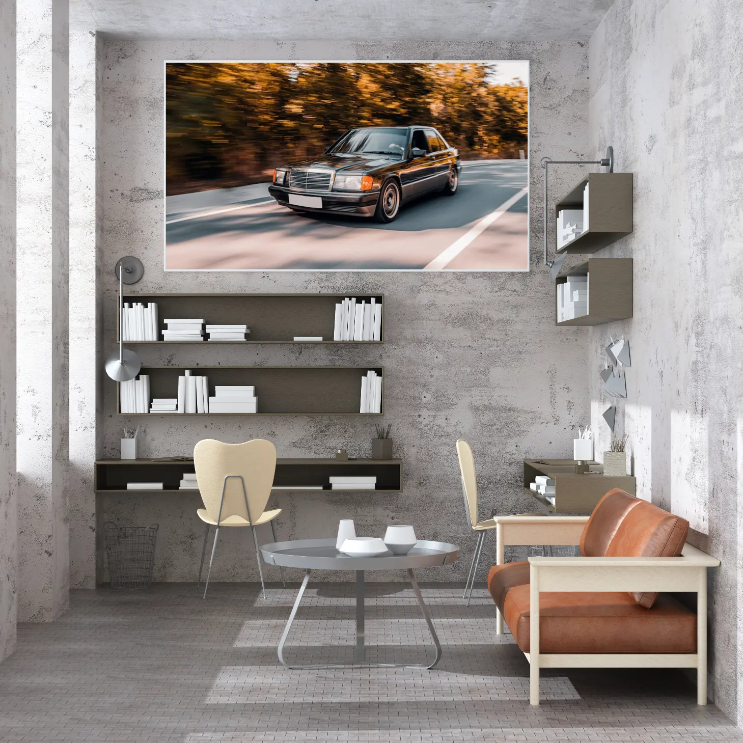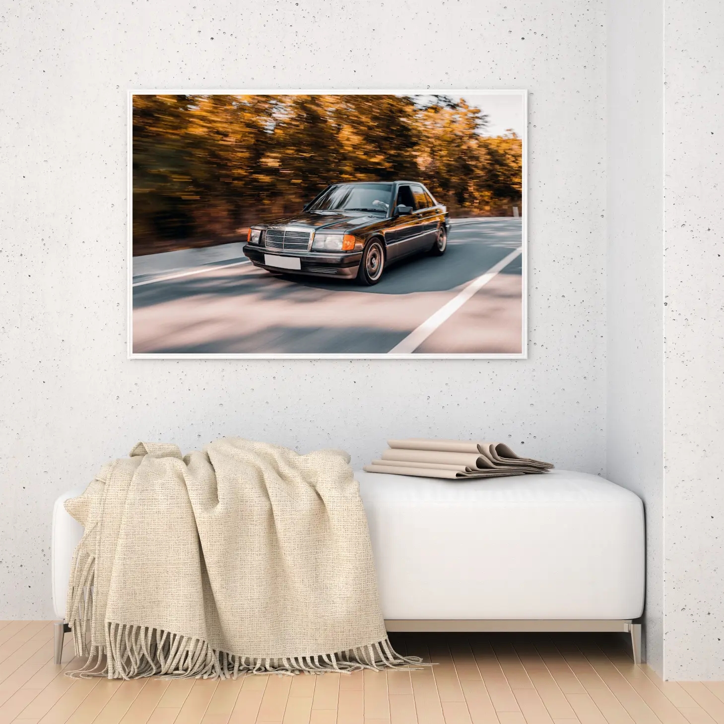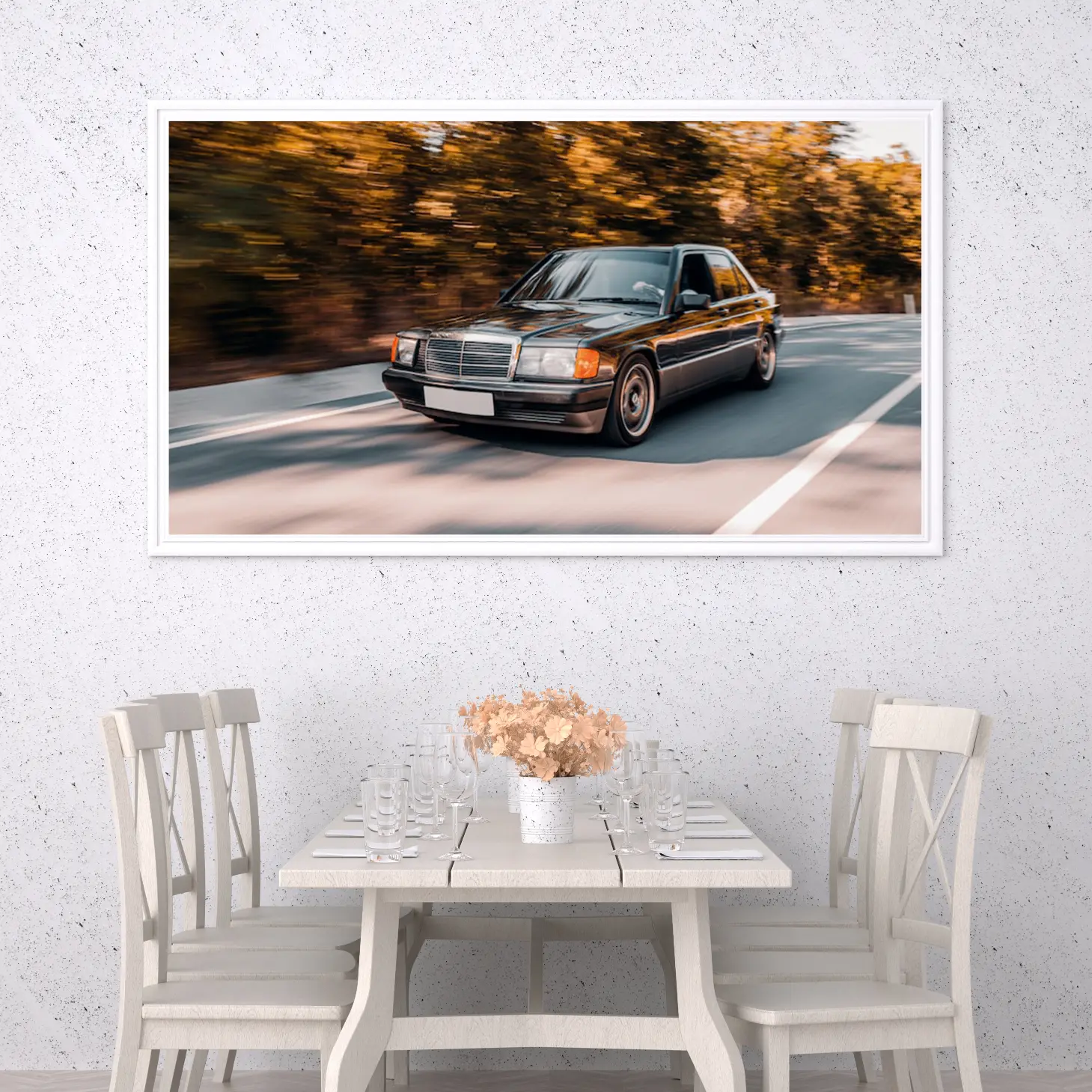 تتجلى في هذه اللوحة الفنية مشهدٌ ديناميكي يجسد حركة الحياة وسرعتها، حيث يظهر فيها سيارة أنيقة تتنقل بسلاسة على طريق محاط بأشجار تتلألأ بألوان الخريف الدافئة. تعكس الأجواء المحيطة إحساسًا بالحرية والانطلاق، مما يجعلها إضافة مثالية لأي مساحة ترغب في إضفاء لمسة من الحيوية والأناقة. إن هذه القطعة الفنية ليست مجرد ديكور جداري، بل هي تعبير عن نمط حياة مفعم بالحيوية والطموح.