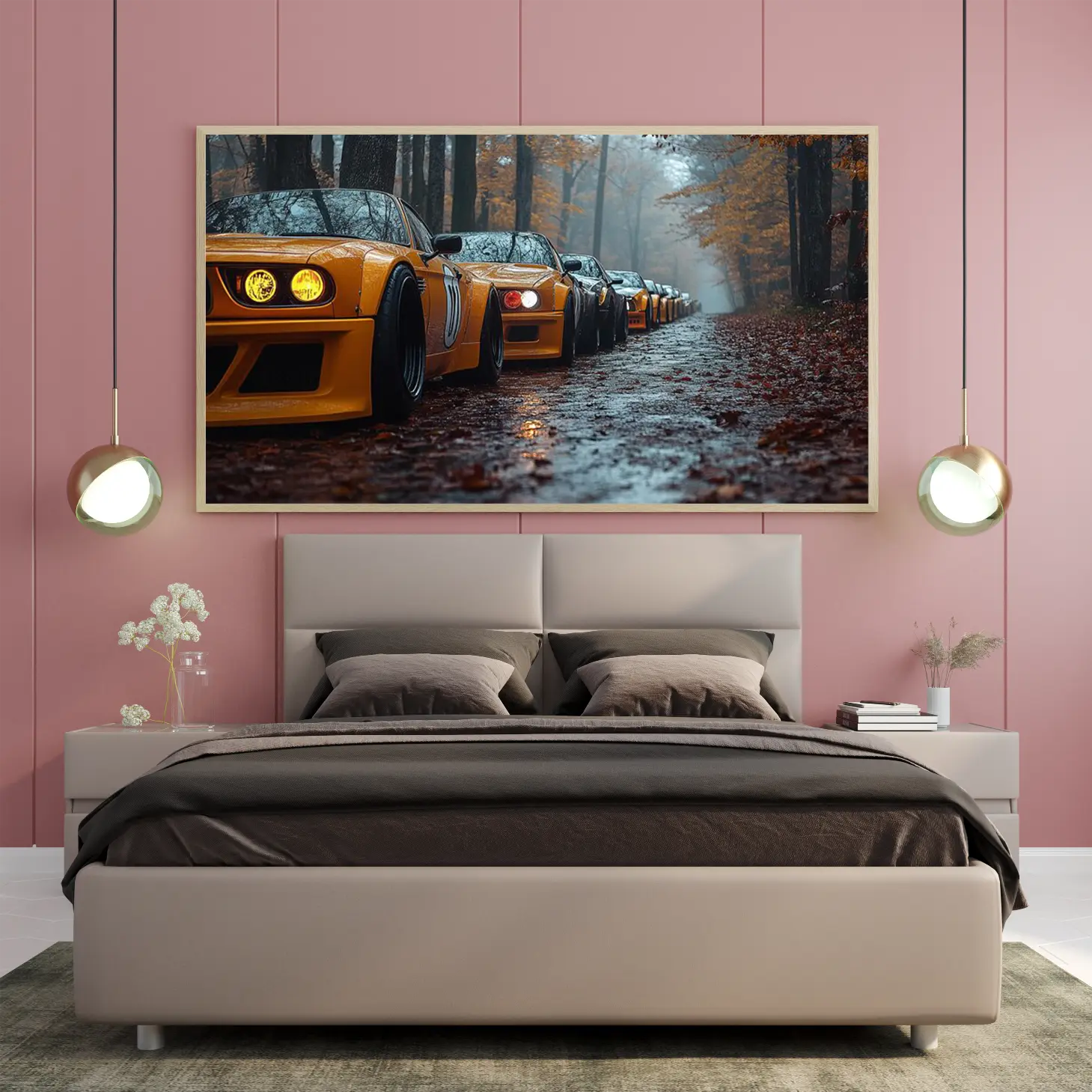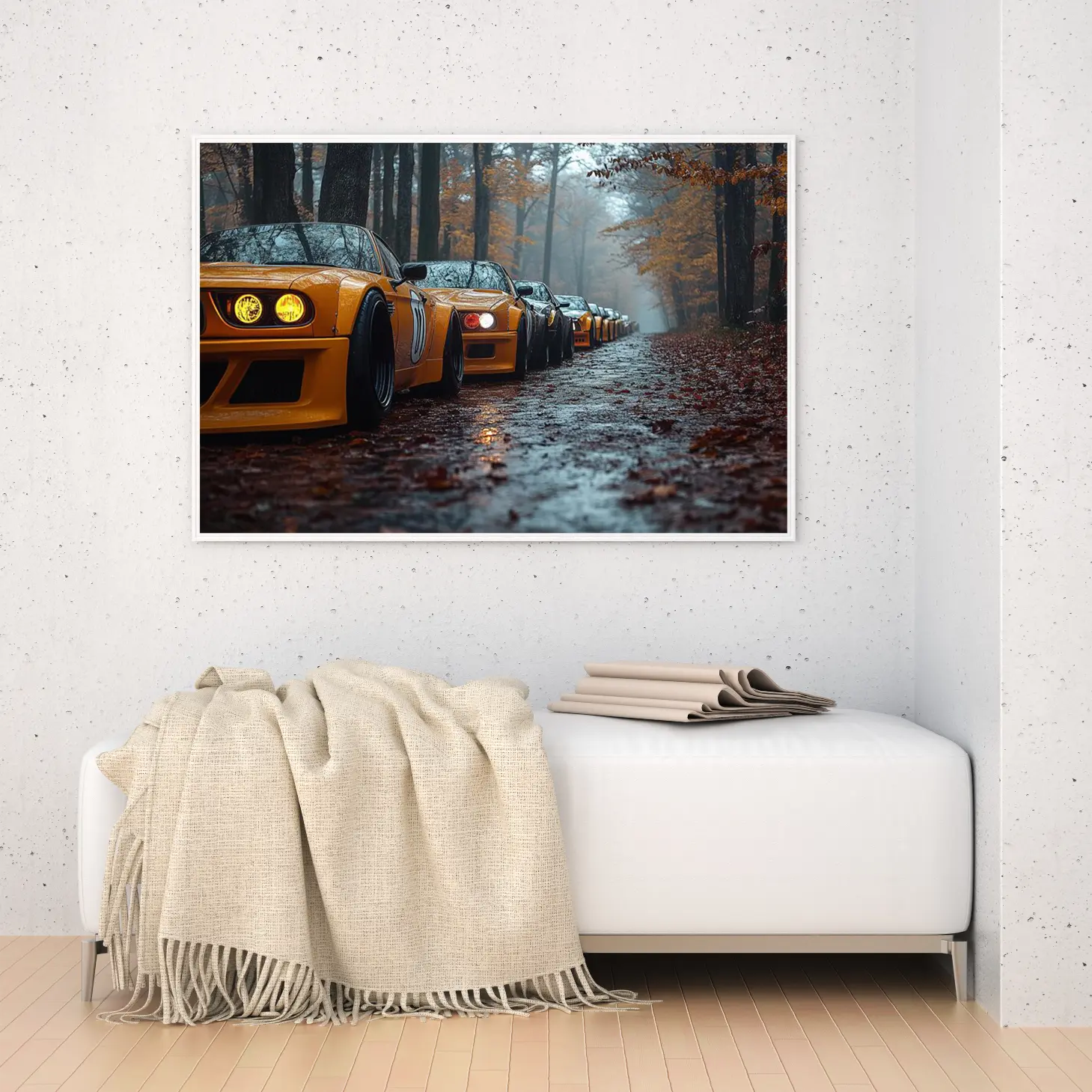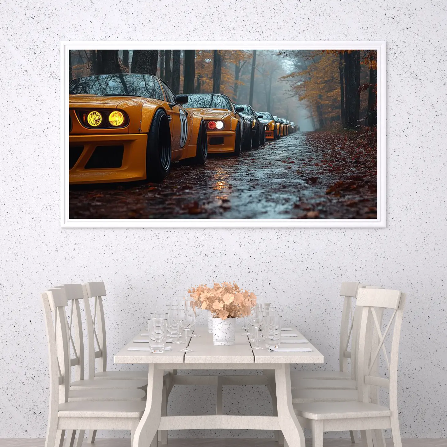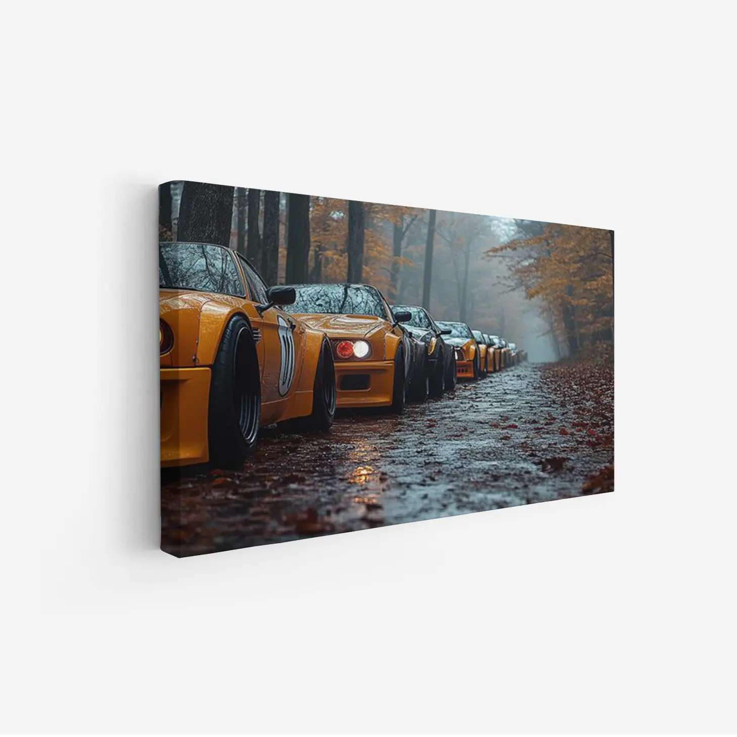 تتجلى في هذه اللوحة الفنية مشهدٌ ساحر يجسد مجموعة من السيارات الرياضية ذات اللون الأصفر اللامع، تتناغم مع أجواء الغابة الخريفية. تتسلسل السيارات على طريق مبلل بأوراق الشجر المتساقطة، مما يضفي على المشهد إحساسًا بالهدوء والغرابة في آن واحد. إن هذا التباين بين الألوان الدافئة للسيارات والخلفية الطبيعية يخلق تأثيرًا بصريًا يجذب الأنظار ويعكس أسلوب حياة عصري يمزج بين القوة والجمال.