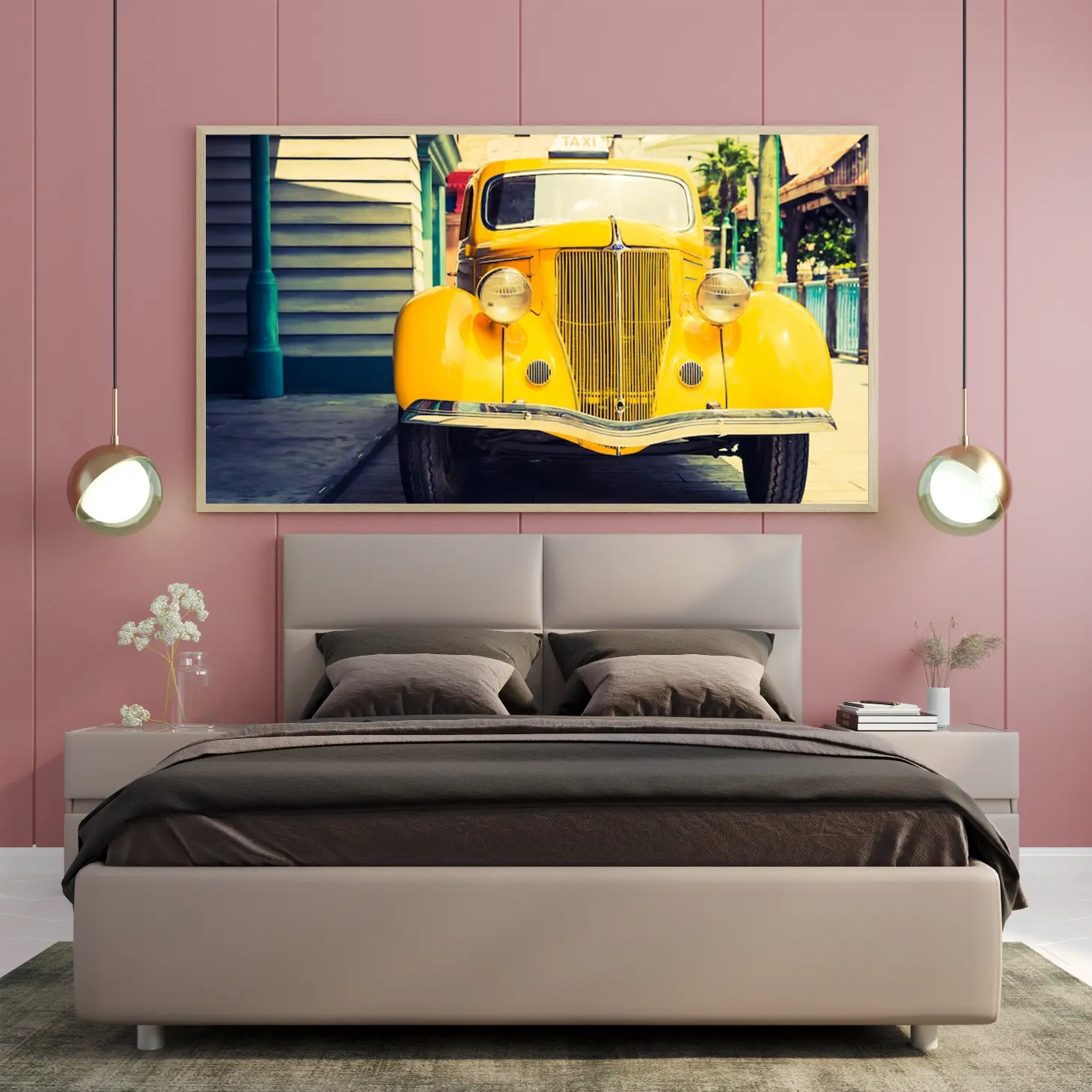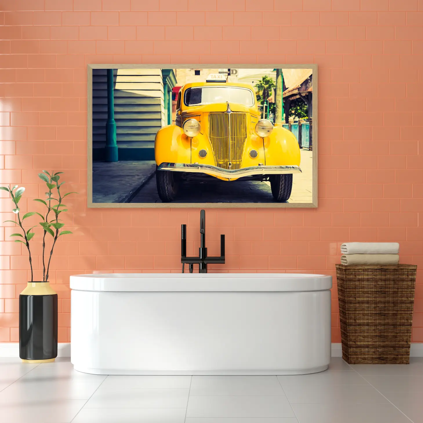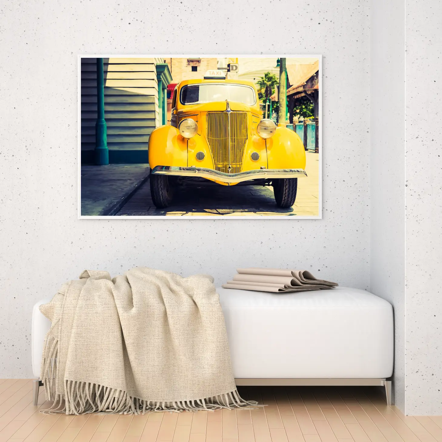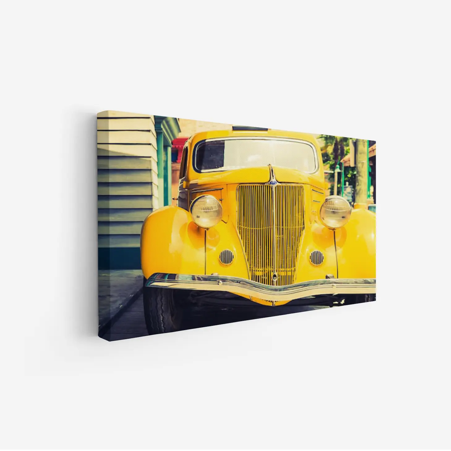 لوحة سيارات كلاسيكية – سيارة صفراء قديمة – خلفية حضرية ملونة – مشمس – لوحات فن عصري – لوحات كانفاس
