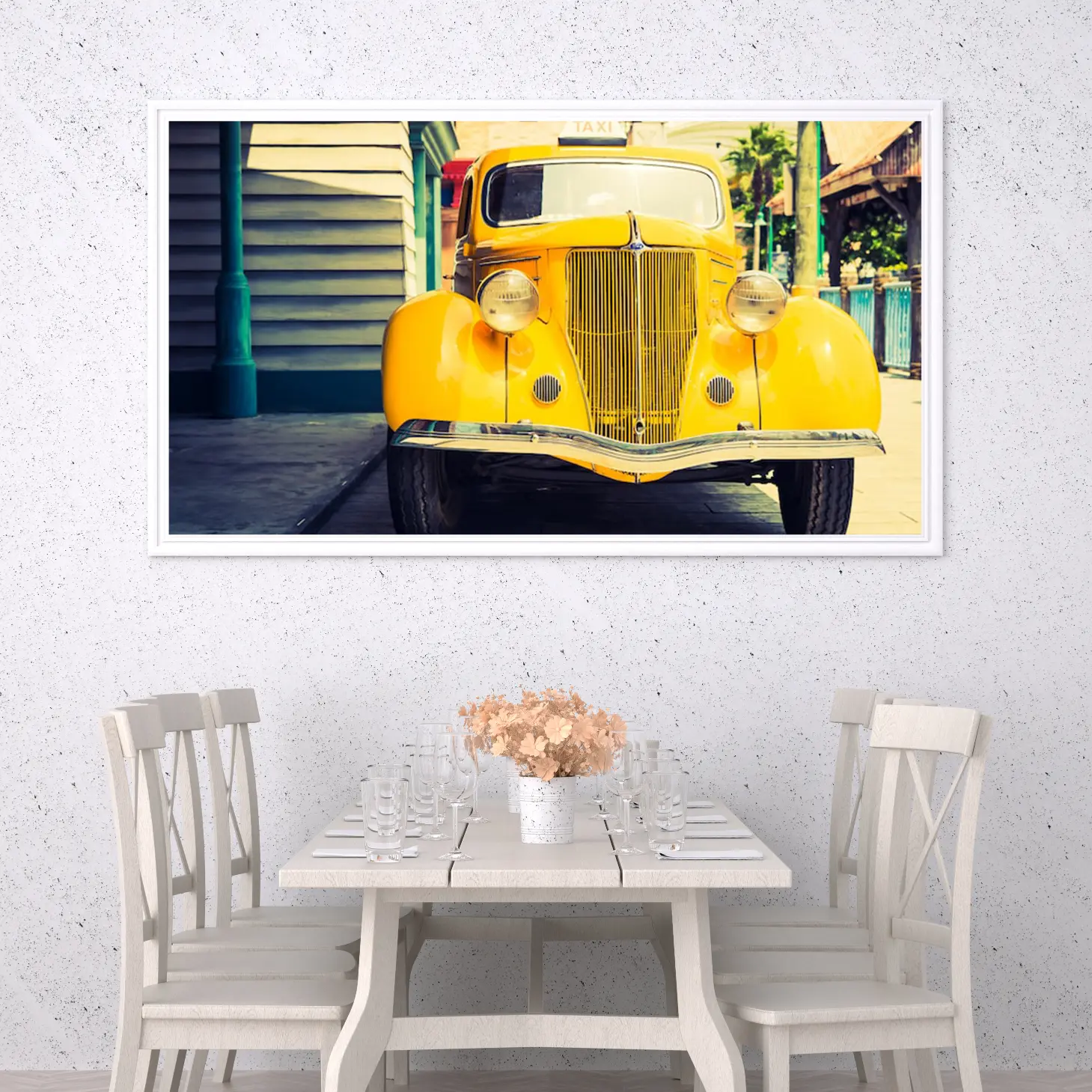 استمتع بجماليات هذه اللوحة الفنية التي تجسد سيارة كلاسيكية صفراء، تعكس روح الحنين إلى الماضي وتضفي لمسة من الأناقة على أي مساحة. تتوفر بأحجام متعددة وإطارات متنوعة، مما يجعلها خيارًا أنيقًا للهدايا التي تعبر عن الذوق الرفيع في المناسبات الخاصة. دع هذه التحفة الفنية تروي قصصًا من الزمن الجميل في منزلك أو مكتبك.
