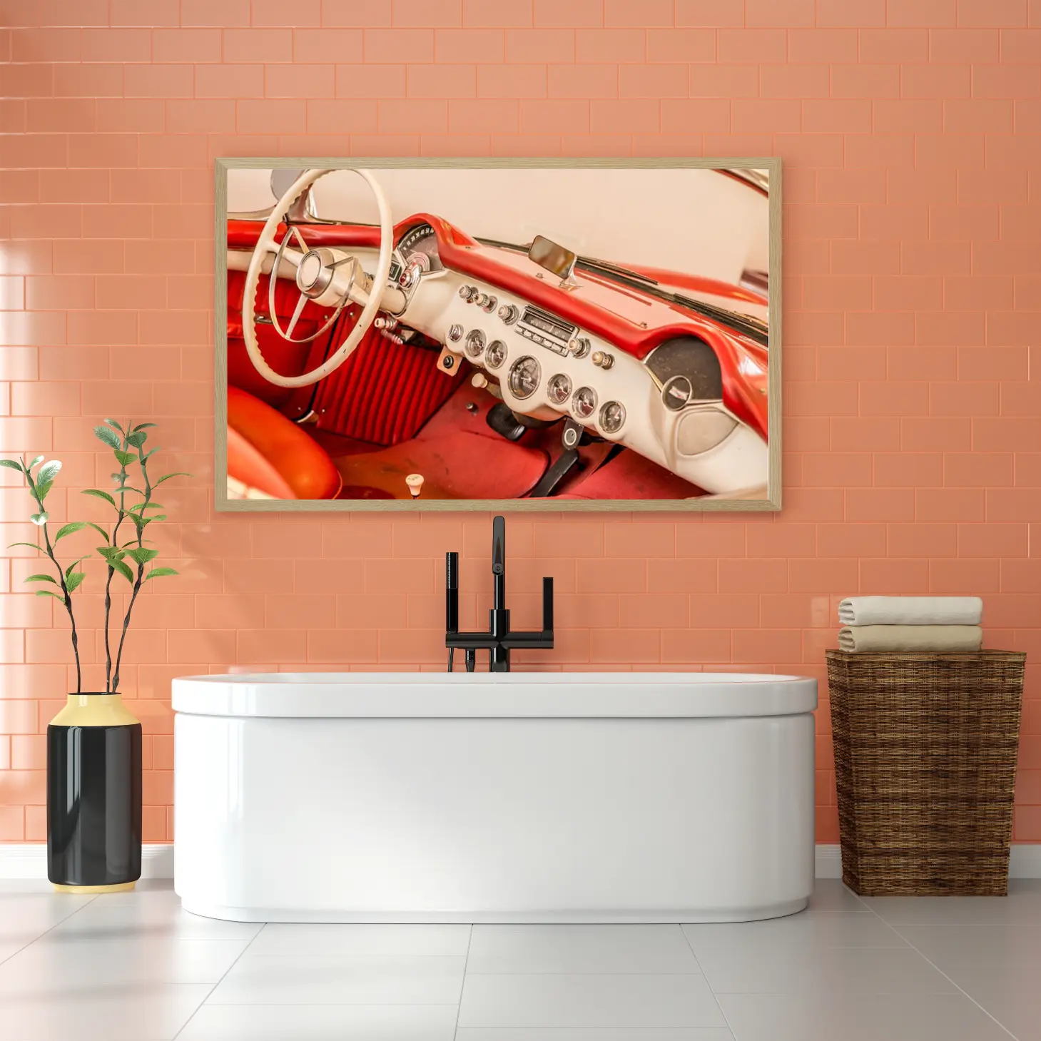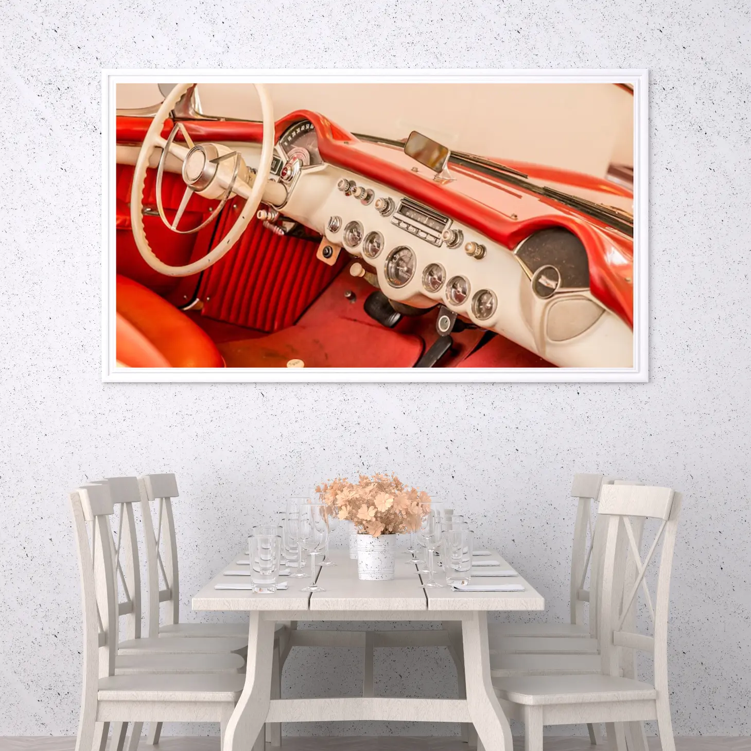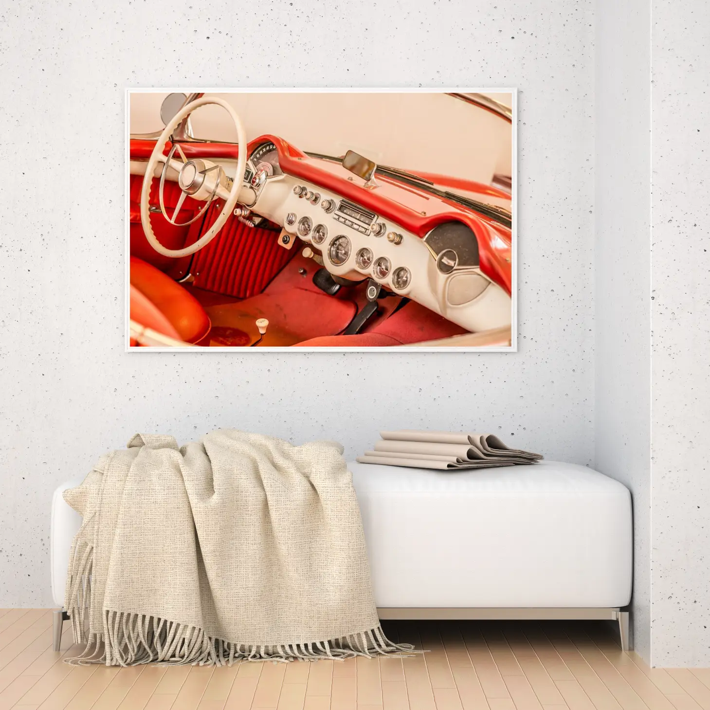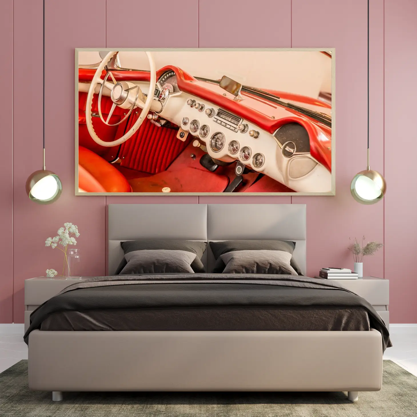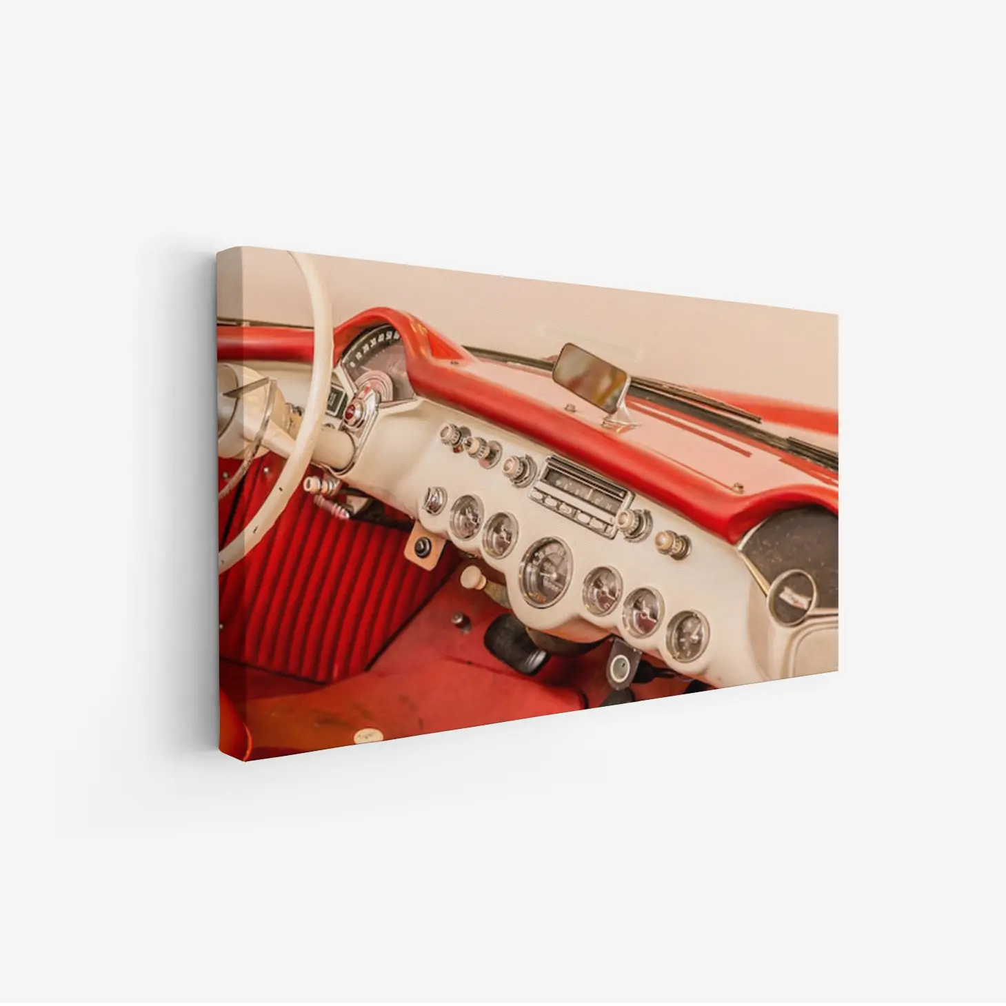 تجسد هذه اللوحة الفنية لحظة من الزمن، حيث تأخذك إلى عالم السيارات الكلاسيكية بأناقتها الفائقة. الألوان الدافئة التي تتناغم بين الأحمر والبيج تضفي شعورًا بالحنين والراحة، مما يجعلها خيارًا مثاليًا لإضفاء لمسة من الفخامة على أي مساحة. تأثيرها البصري يخلق أجواءً مريحة ودافئة، مما يجعلها قطعة فنية تساهم في تحسين نمط الحياة وتعزيز الإلهام.
