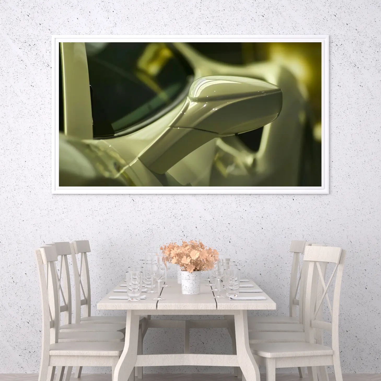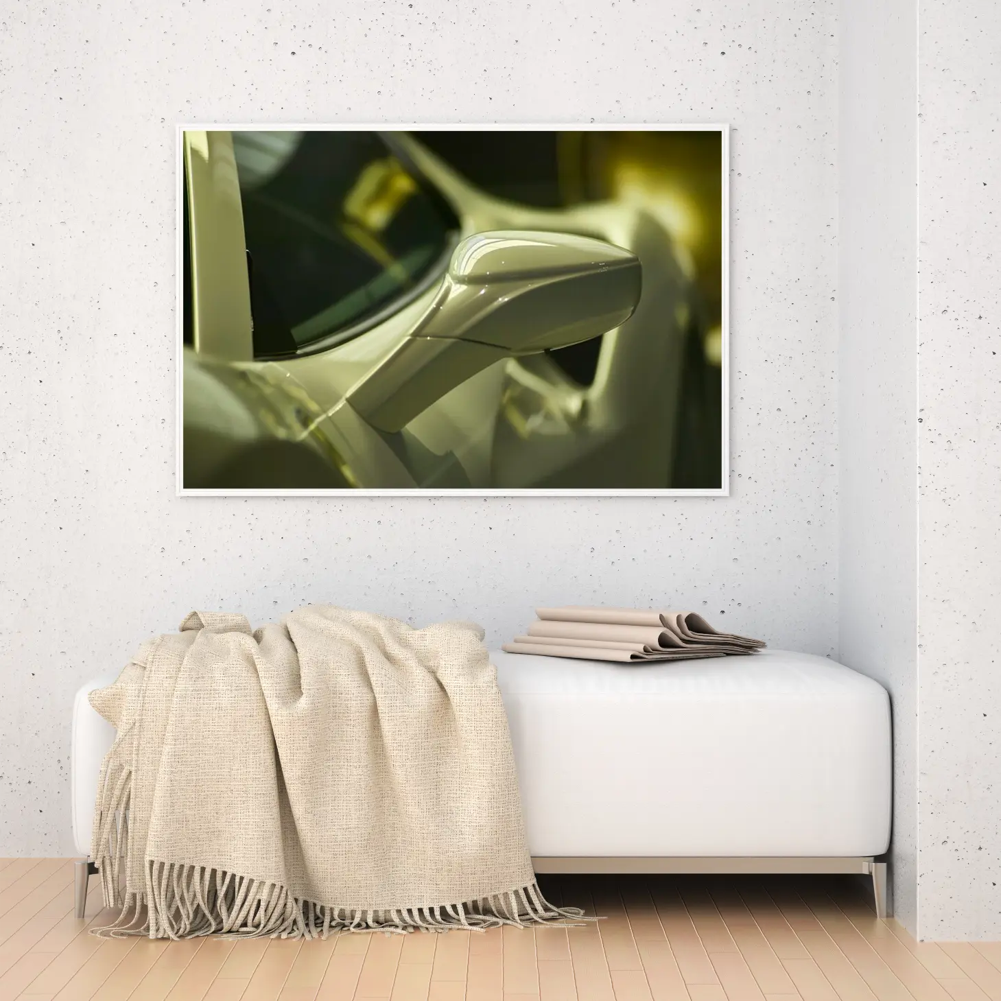 تجسد هذه اللوحة الفنية لحظة من الفخامة والسرعة، حيث تبرز تفاصيل دقيقة لجانب سيارة أنيقة بلونها الفاتح اللامع. تعكس الأضواء المتلألئة على السطح المصقول إحساسًا بالحركة والديناميكية، مما يضفي على المكان أجواءً من الإثارة والتشويق. إن هذه القطعة ليست مجرد ديكور جداري، بل هي تعبير عن نمط حياة يتسم بالرفاهية والتميز، مما يجعلها إضافة مثالية لأي مساحة.