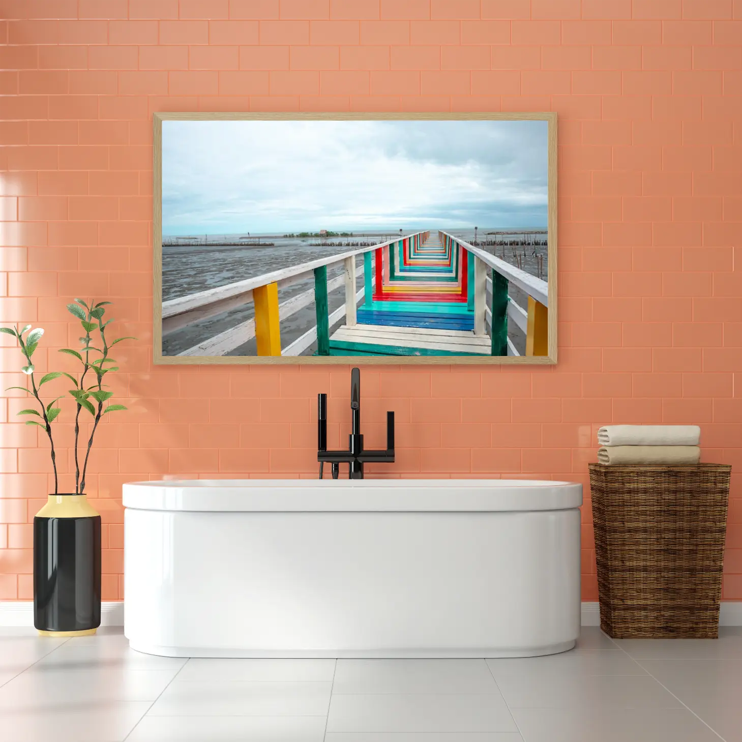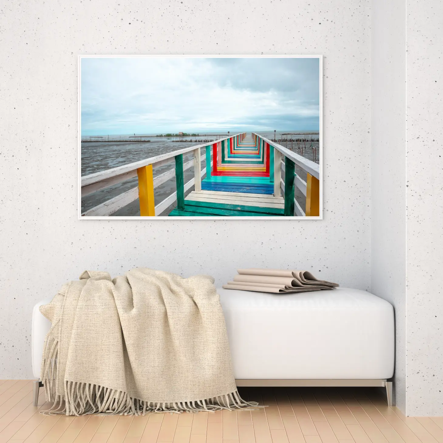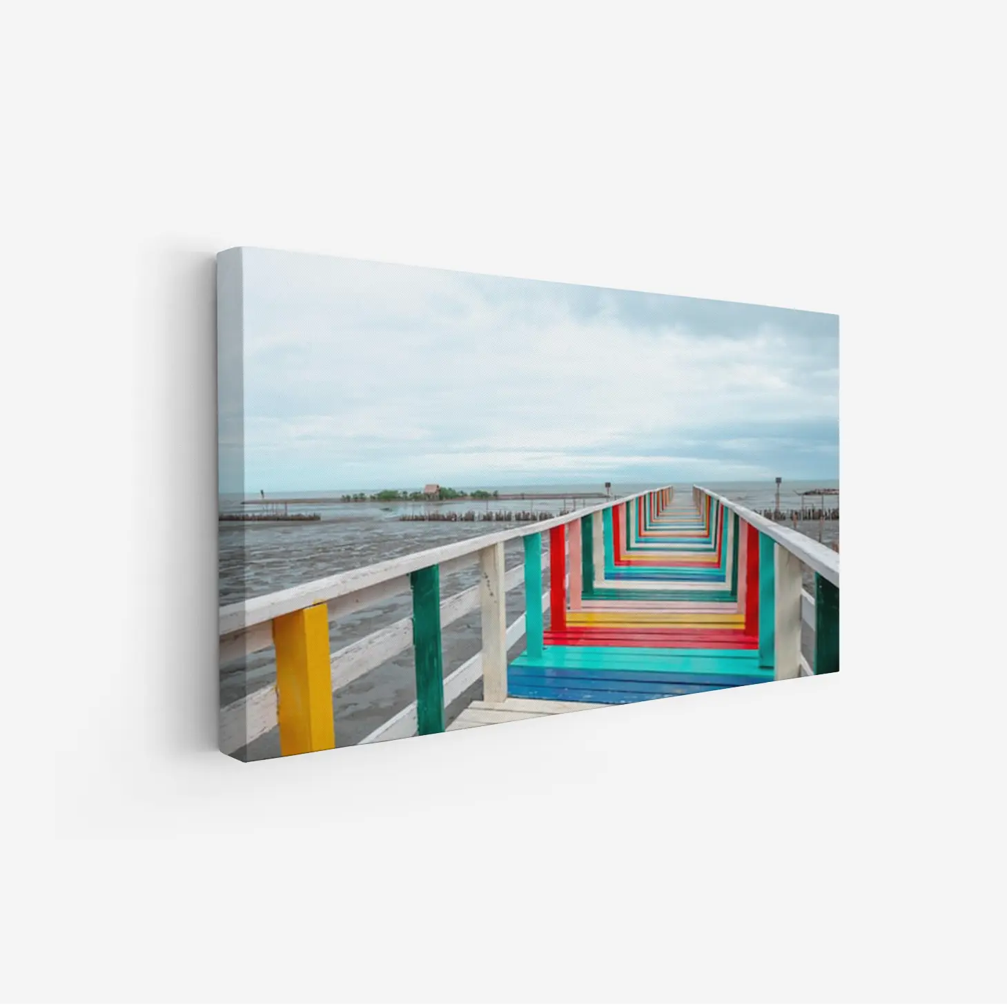 تتجلى في هذه اللوحة جماليات فنية تأسر الأنظار، حيث يظهر جسر ملون يمتد نحو الأفق، محاطًا بمياه هادئة وأجواء طبيعية ساحرة. الألوان الزاهية التي تتناغم مع بعضها تعكس روح الحياة والنشاط، مما يضفي على المكان إحساسًا بالبهجة والانتعاش. هذه القطعة الفنية ليست مجرد ديكور جداري، بل هي استثمار جمالي يضيف لمسة من الأناقة والتوازن إلى أي مساحة.