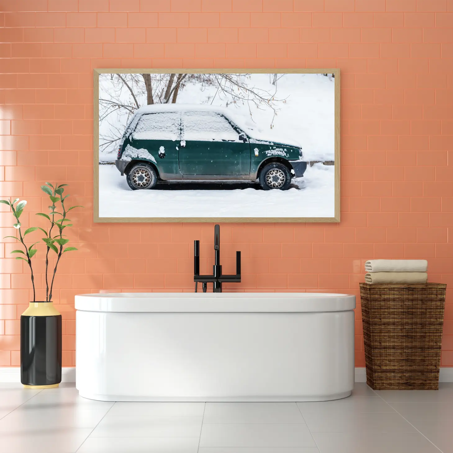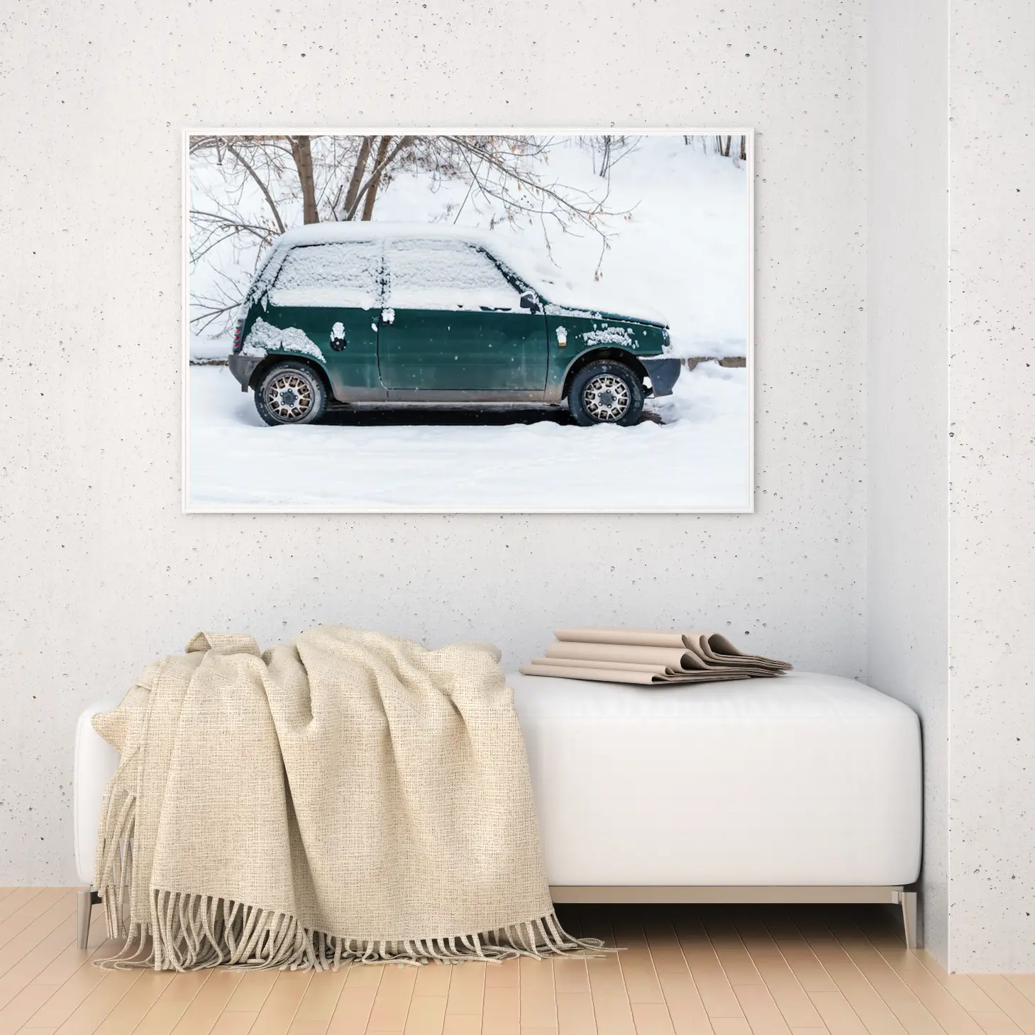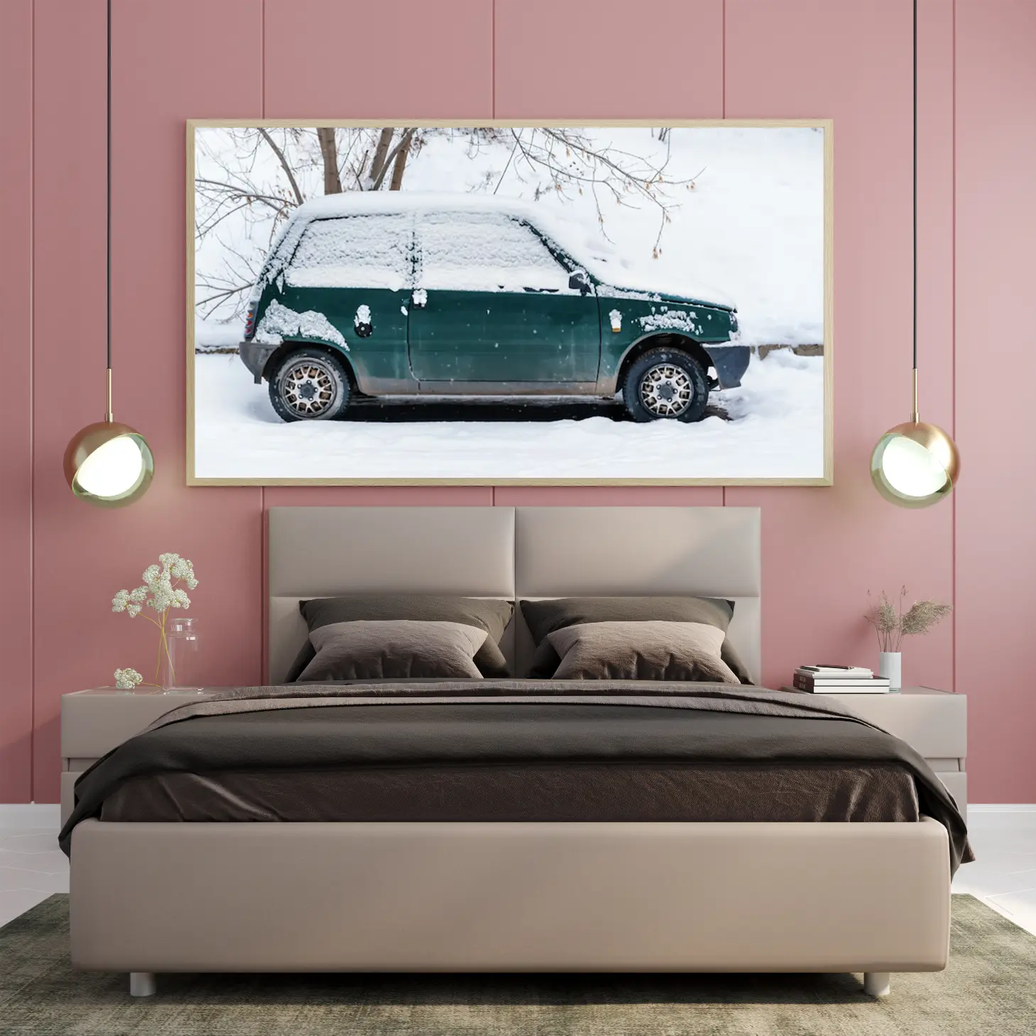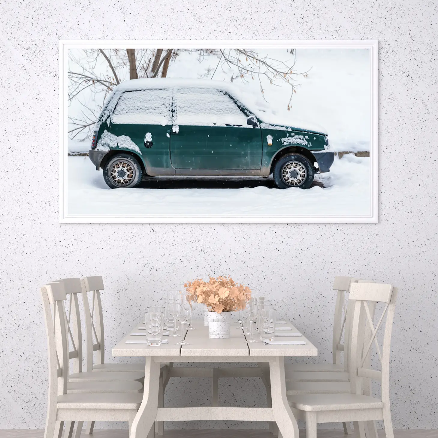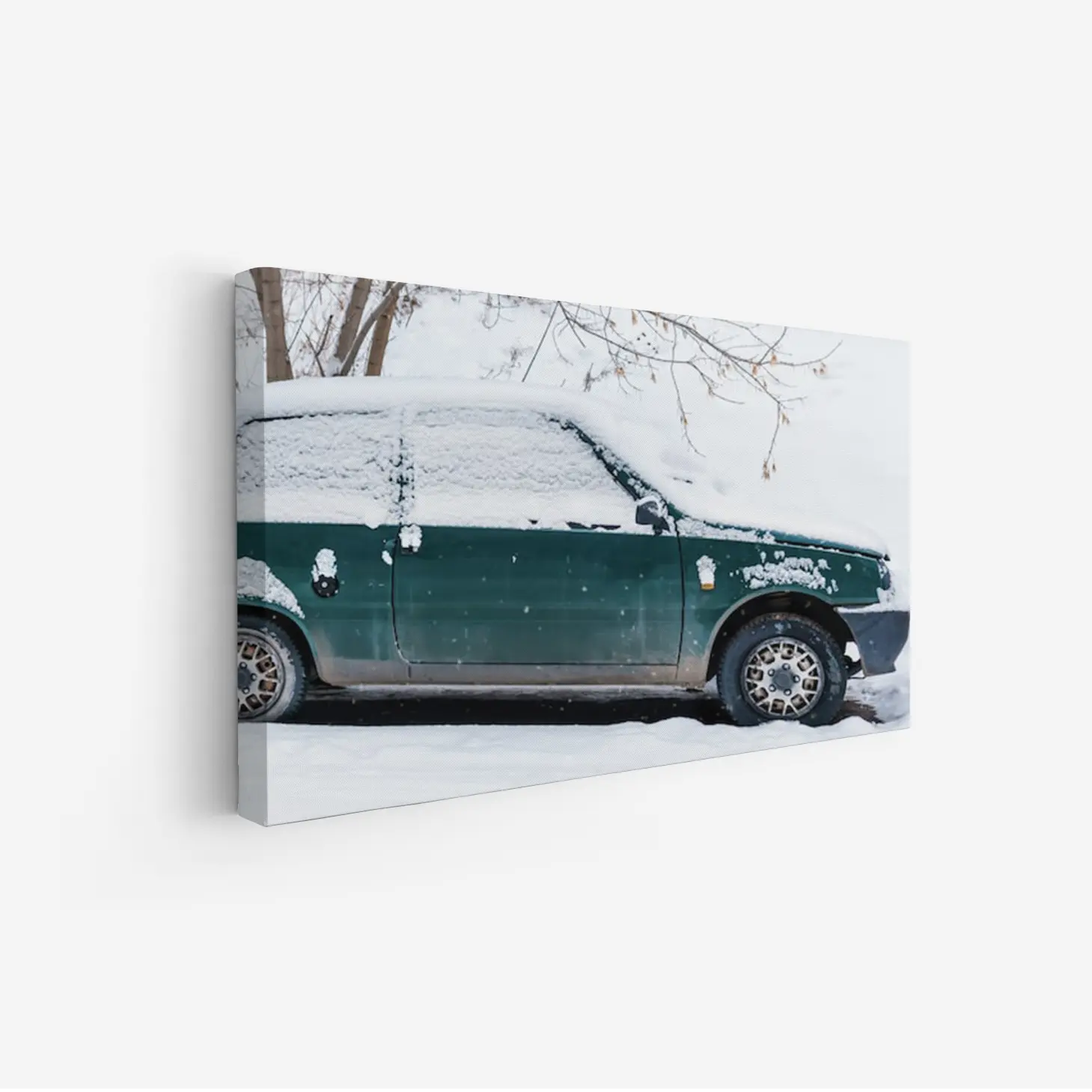 لوحة شتاء مغطاة بالثلوج مع سيارة خضراء تحت أشجار عارية، أجواء هادئة وساحرة، لوحات طبيعة، لوحات كانفاس.