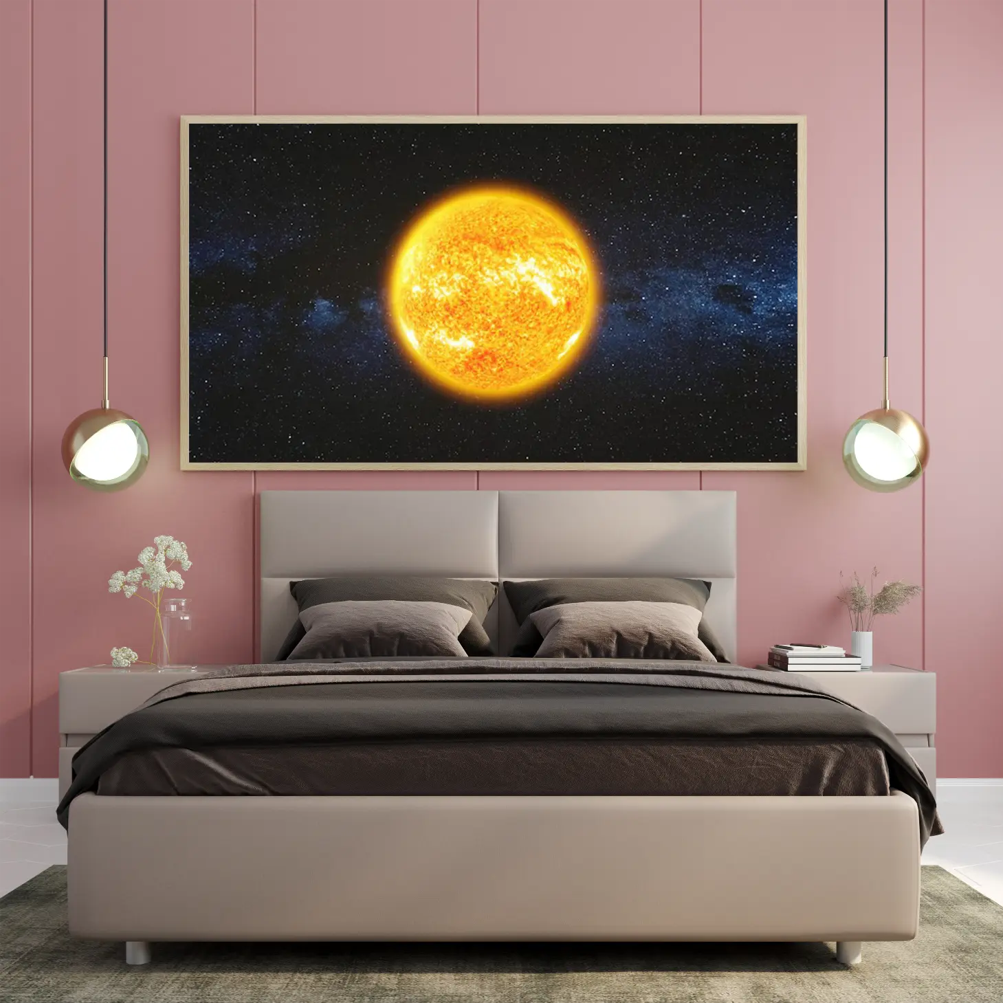 لوحة شمس ساطعة في سماء مظلمة مليئة بالنجوم، ألوان دافئة ومشرقة، جو مفعم بالطاقة والحيوية، مناظر طبيعية، لوحات جدارية أنيقة، لوحات فنية عصرية، لوحات مودرن.