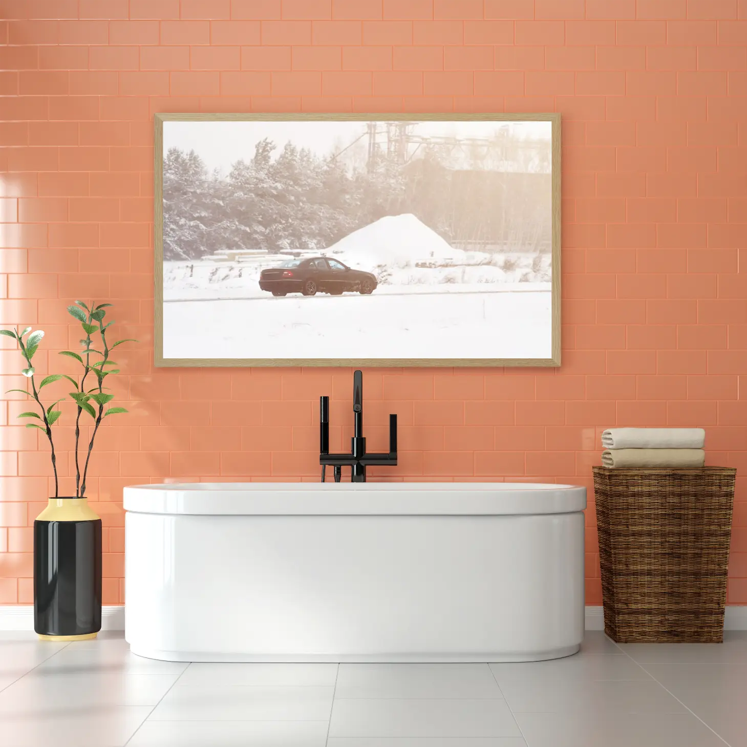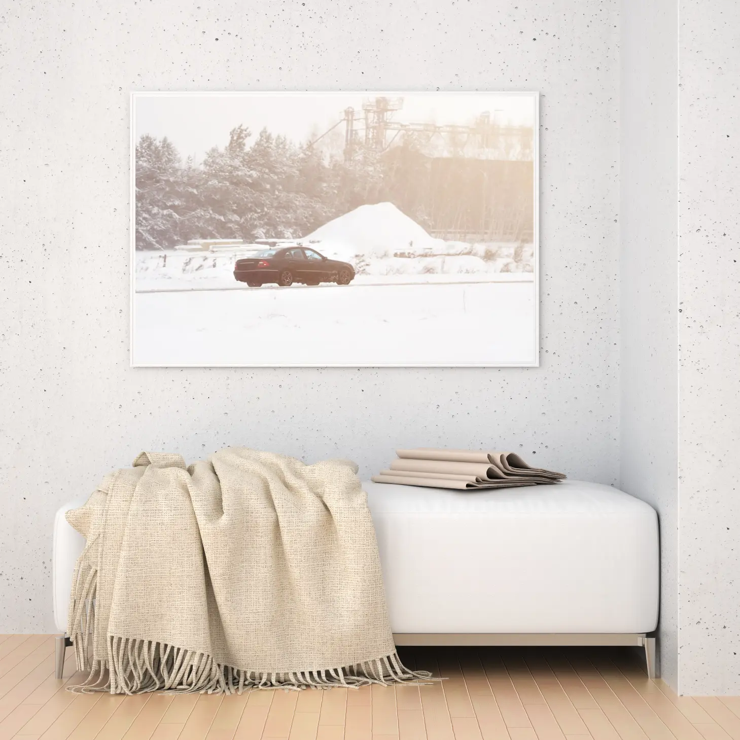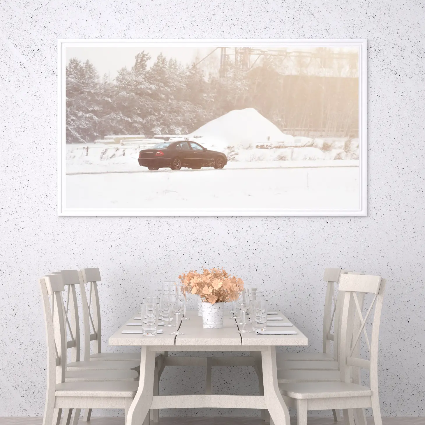 تجسد هذه اللوحة الفنية مشهداً ساحراً يأخذك إلى عالم من السكون والجمال الطبيعي. تتناغم الألوان الهادئة مع الثلوج البيضاء التي تغطي الأرض، مما يخلق إحساساً بالهدوء والسكينة. السيارة السوداء، التي تتوسط المشهد، تضيف لمسة من الأناقة والحداثة، مما يجعل هذا العمل الفني خياراً مثالياً لإضفاء جو من الرقي على أي مساحة. إن تأثير هذه اللوحة على الأجواء المحيطة بها يجعلها نقطة جذب للأنظار، مما يعكس أسلوب حياة متميز.