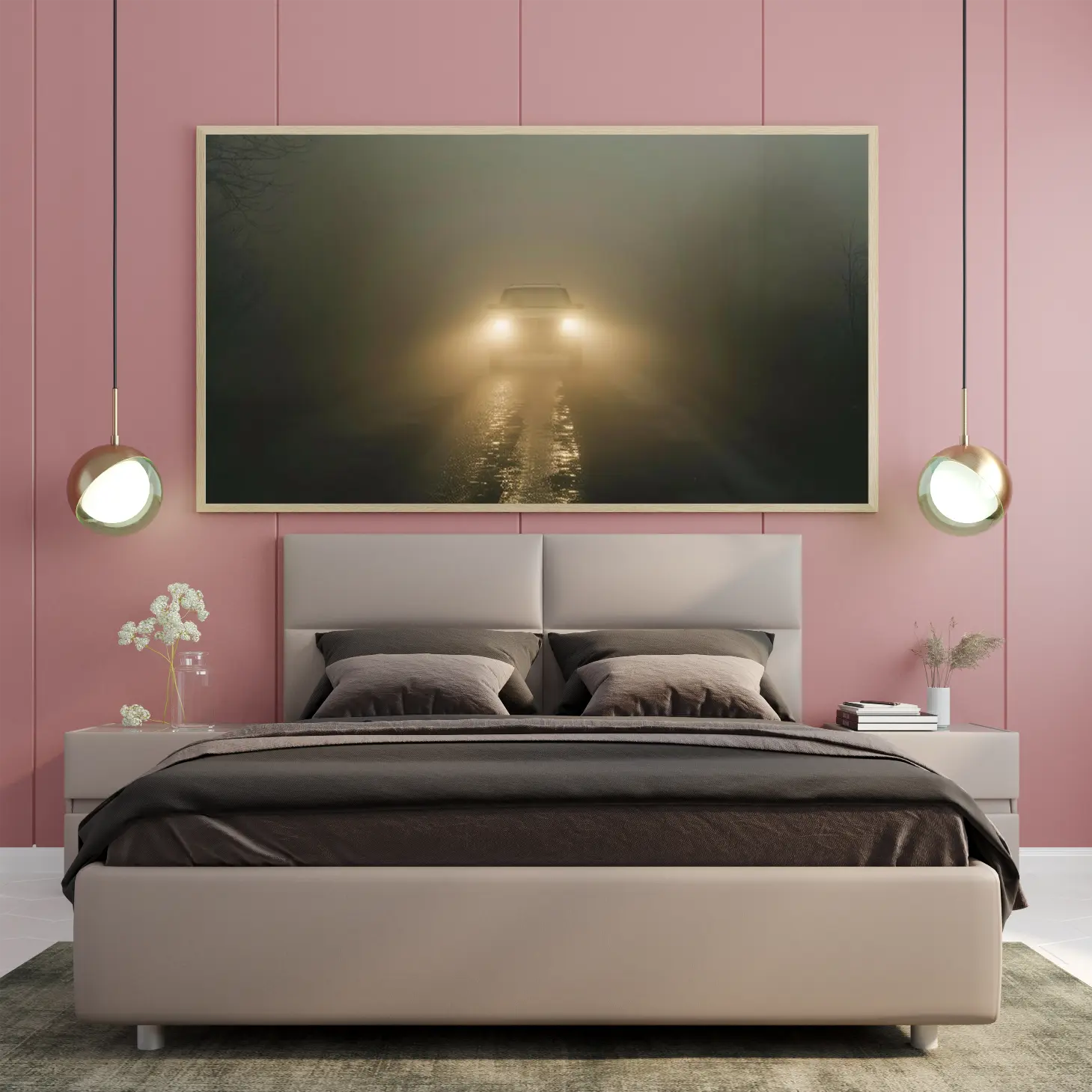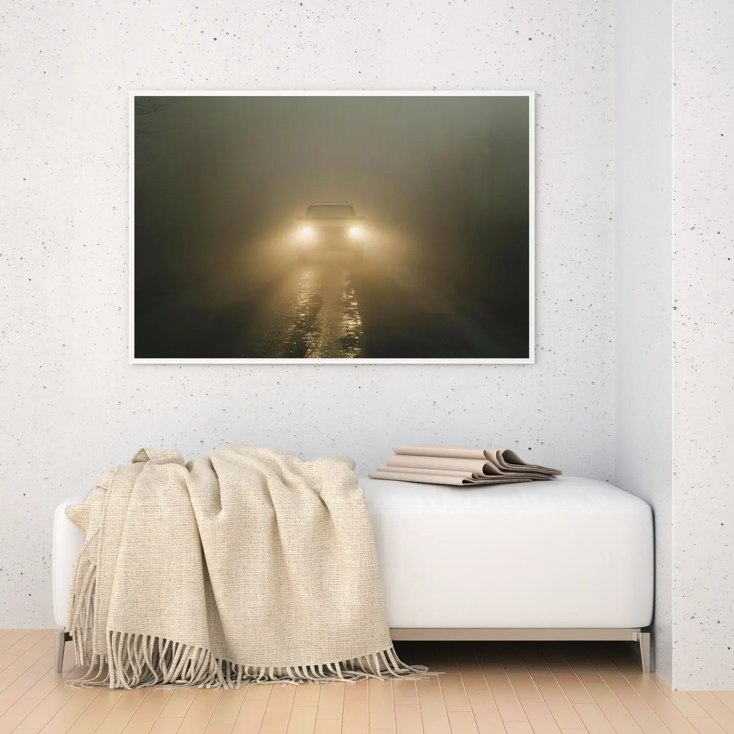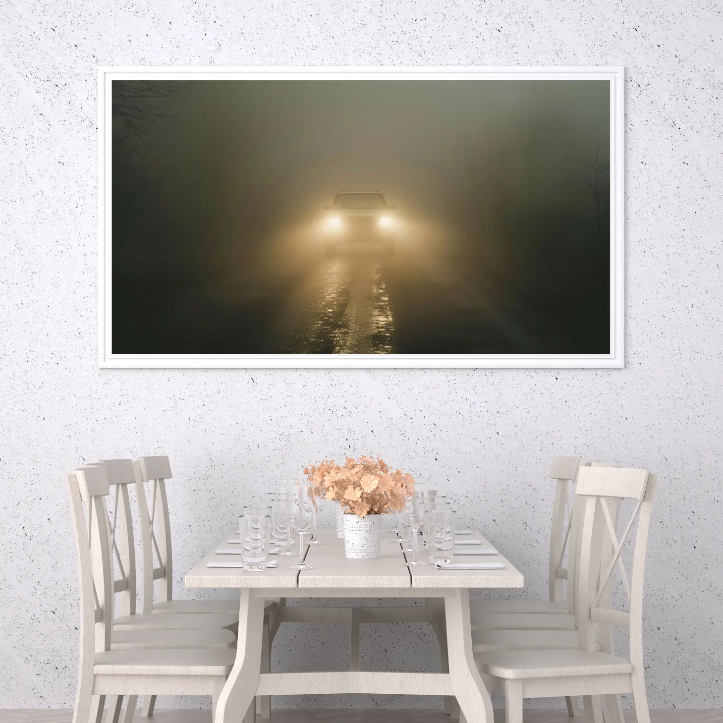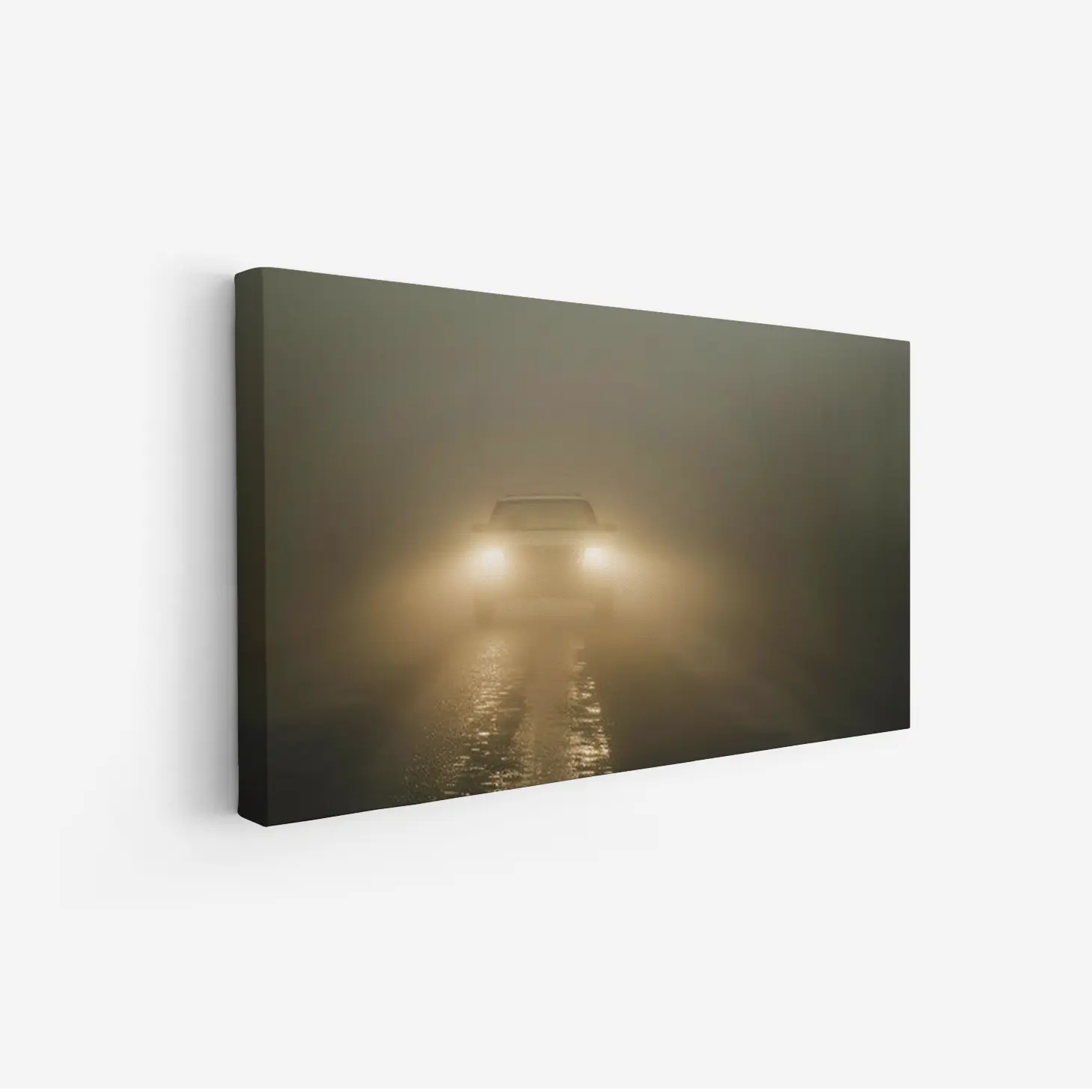 تتجلى في هذه اللوحة الفنية أجواء من الغموض والسحر، حيث تتسلل خيوط الضباب الكثيف لتغلف المشهد بألوان دافئة وناعمة. يظهر في المقدمة ضوء سيارة يتلألأ في وسط الضباب، مما يخلق تباينًا رائعًا بين الظلام والضوء. هذه القطعة الفنية ليست مجرد ديكور جداري، بل هي تجربة بصرية تأخذك في رحلة عبر الأجواء الحالمة، مما يضفي لمسة من الأناقة والهدوء على أي مساحة.
