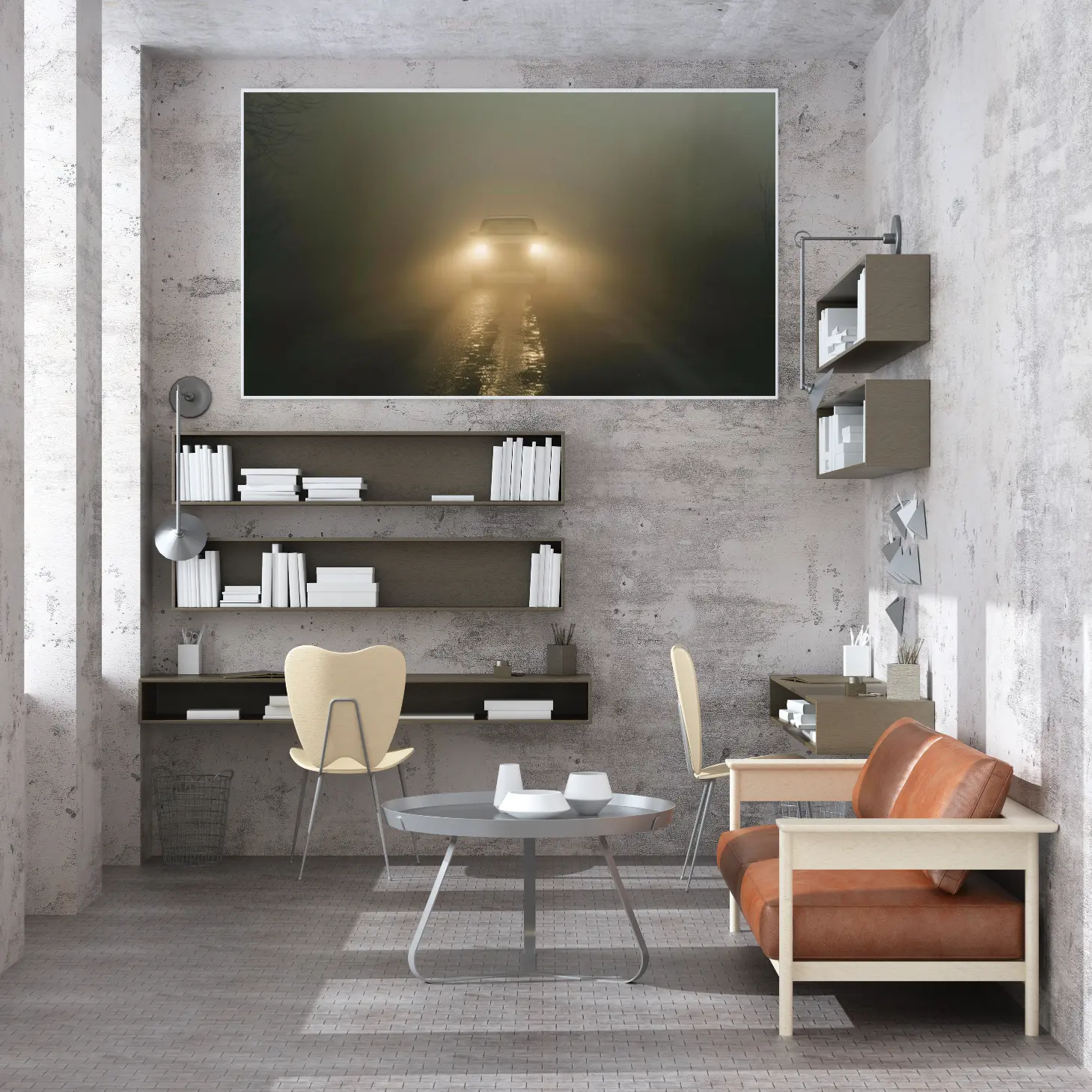 لوحة طبيعة ضبابية – سيارة في الضباب – ألوان رمادية – غامض – لوحات فنية مودرن – لوحات كانفاس