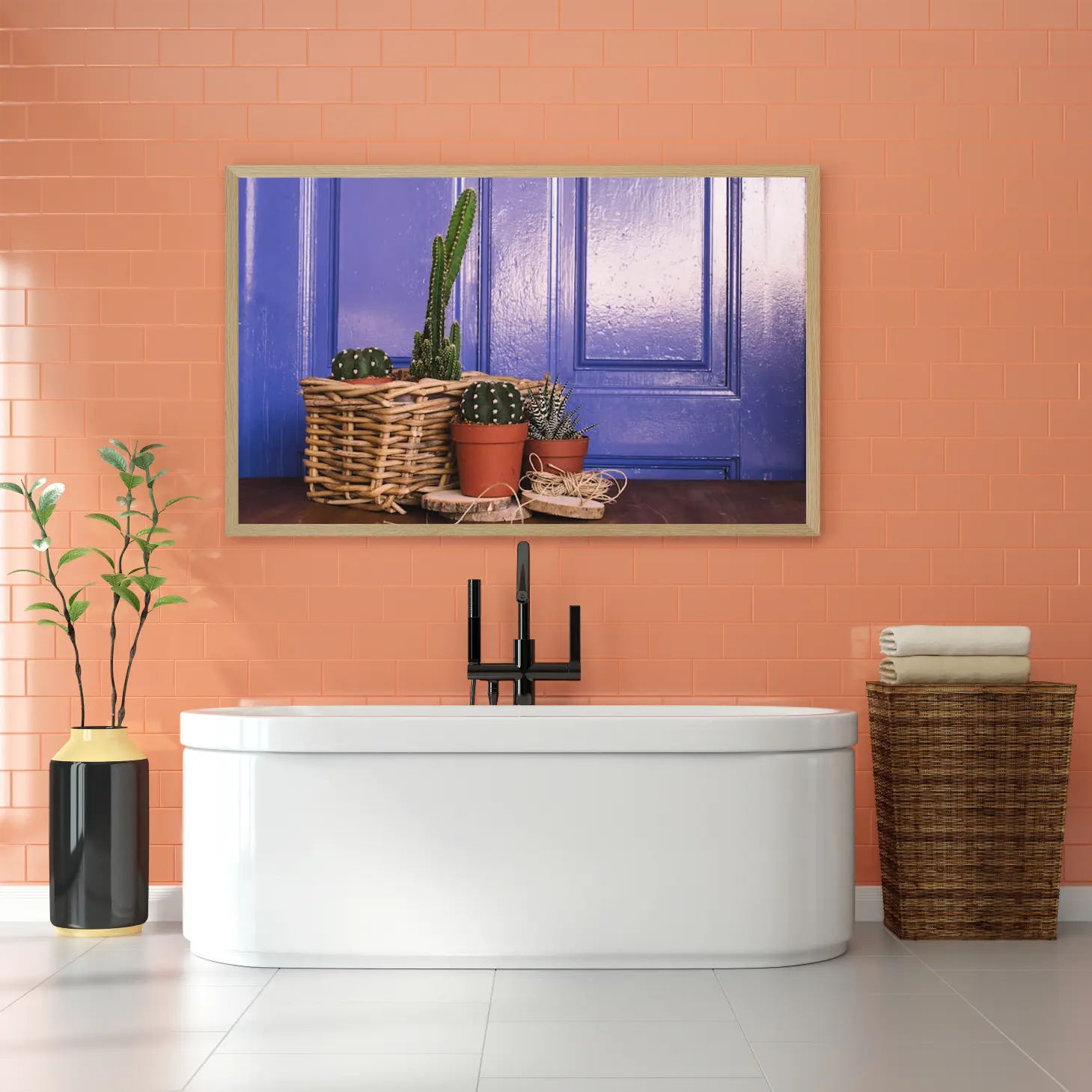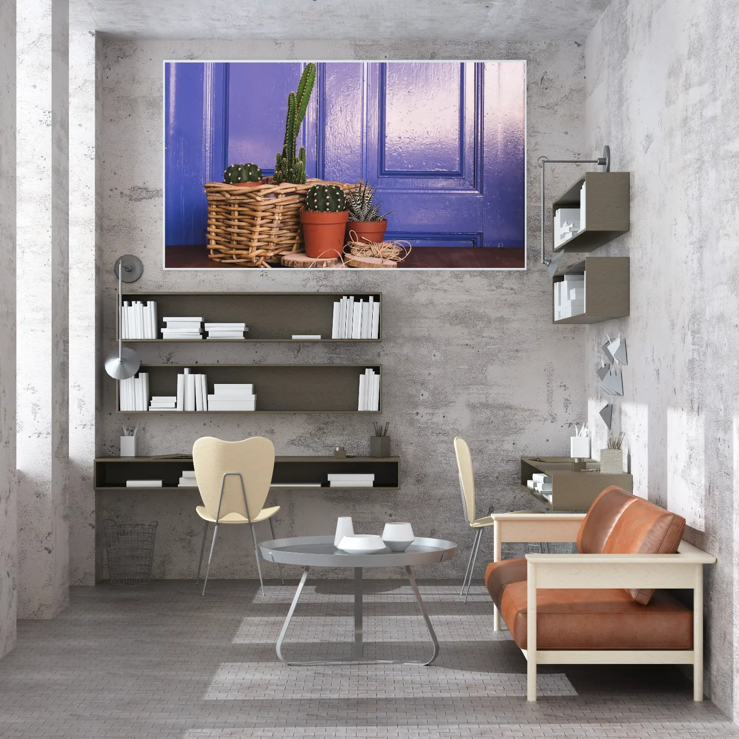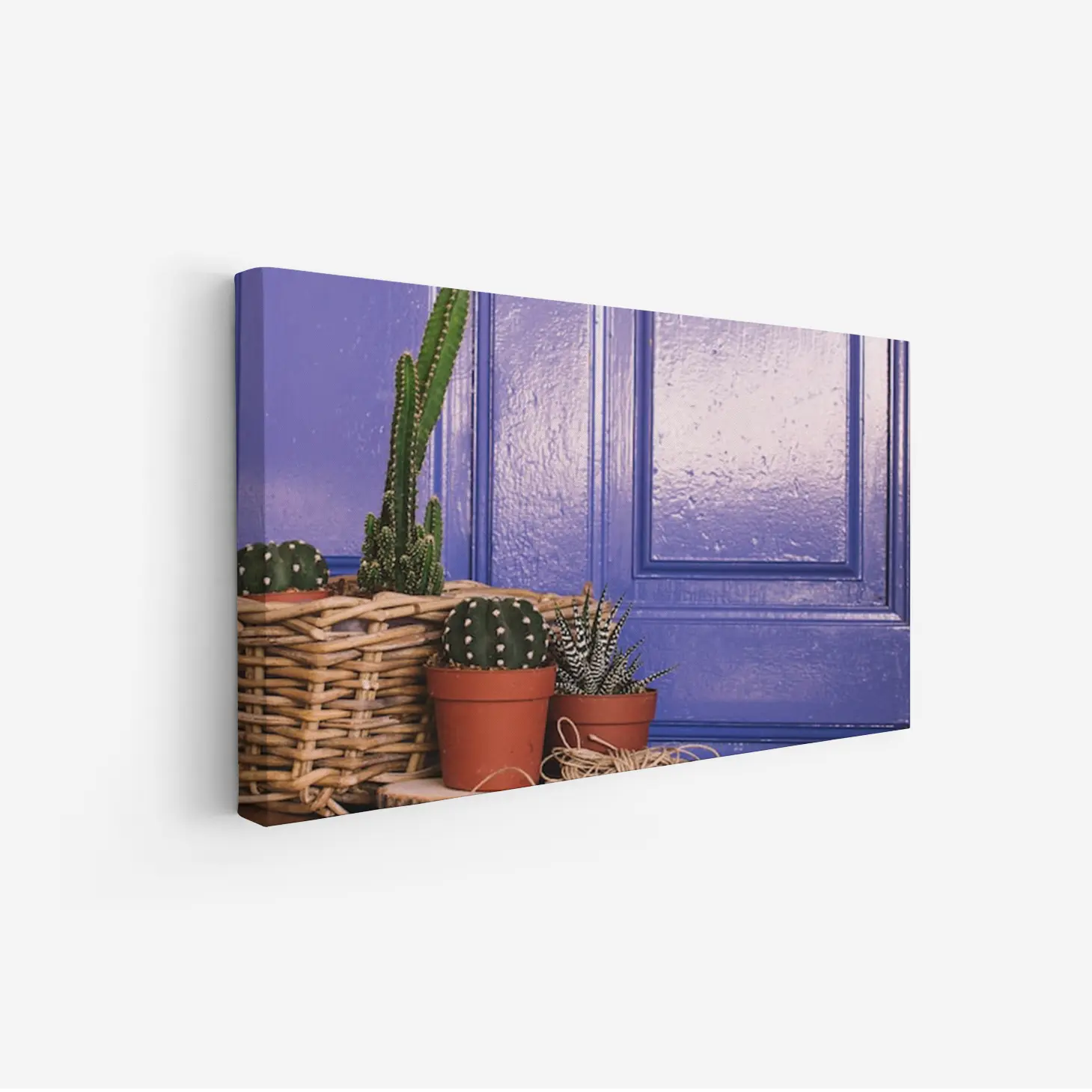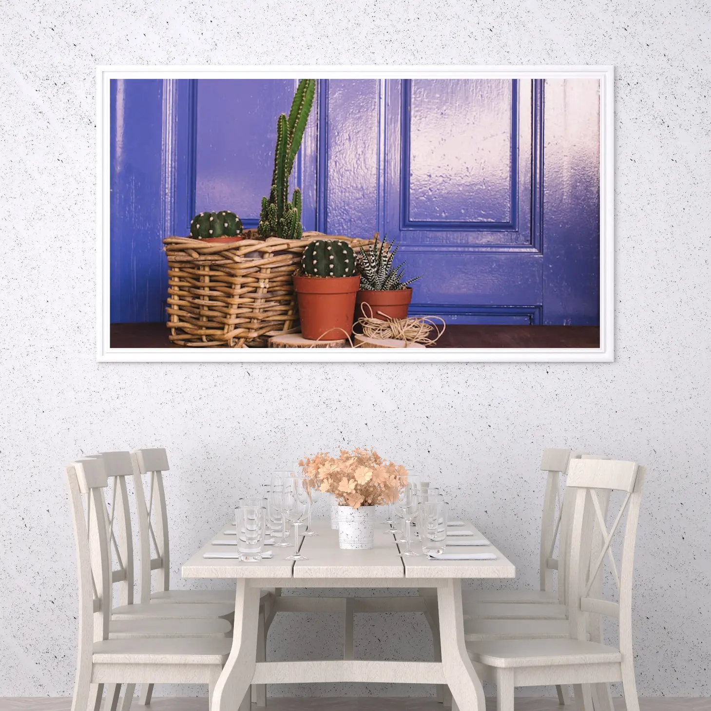 استمتع بجمال الألوان الزاهية مع هذه اللوحة الفريدة التي تبرز بابًا أزرق رائعًا محاطًا بنباتات صحراوية أنيقة. تضيف هذه القطعة لمسة من الحيوية والدفء إلى أي مساحة، مما يجعلها خيارًا أنيقًا للهدايا تعبر عن الذوق الرفيع. متوفرة بمقاسات متعددة وإطارات متنوعة، ستجد بالتأكيد ما يناسب ذوقك أو ما تبحث عنه لمناسبة خاصة.