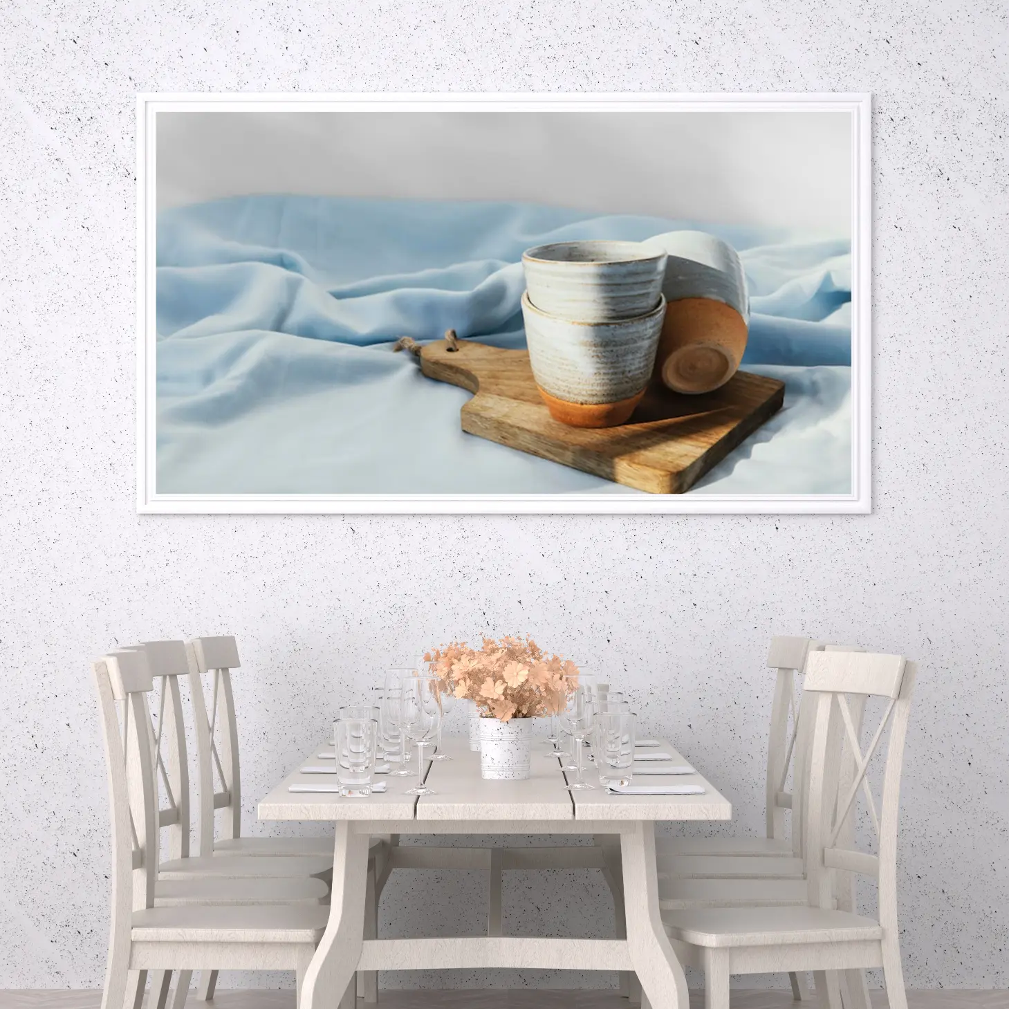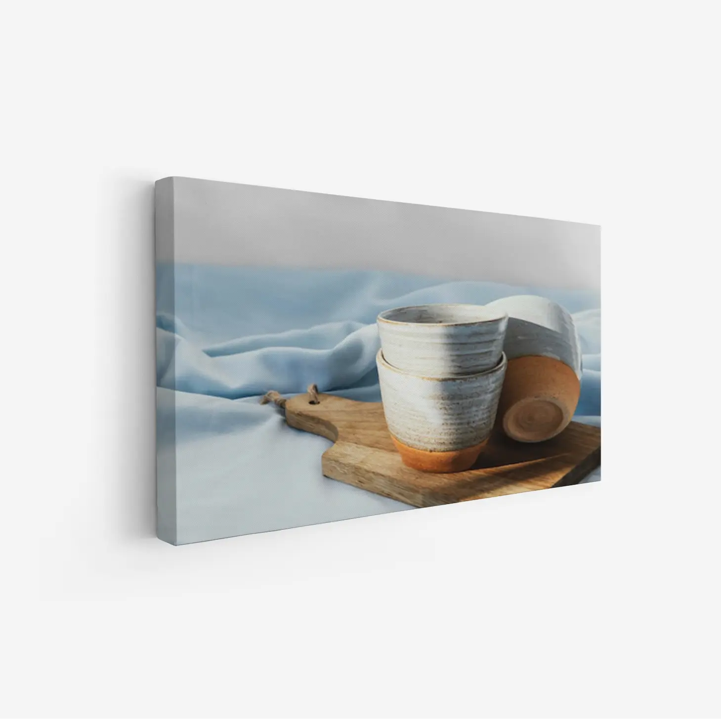لوحة طبيعة هادئة – أكواب خزفية – خلفية زرقاء فاتحة – هادئ – لوحات فنية مودرن – لوحات كانفاس