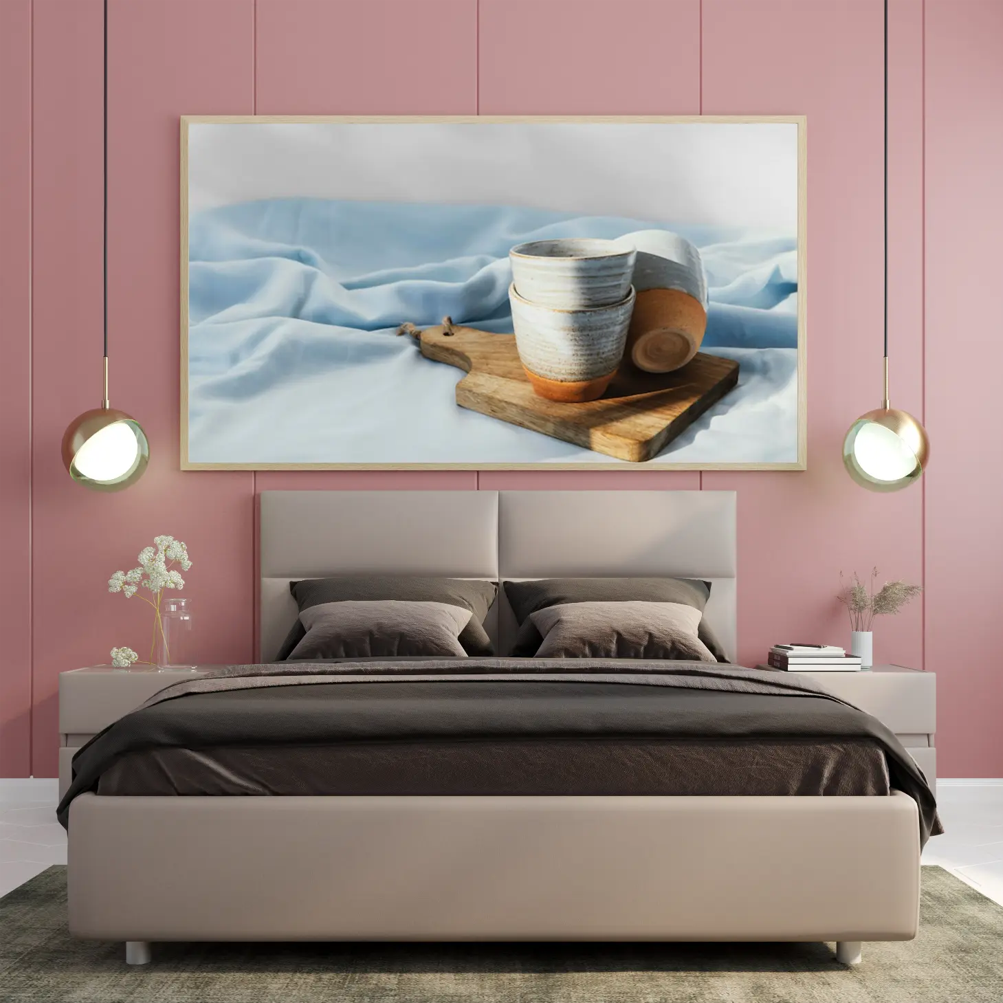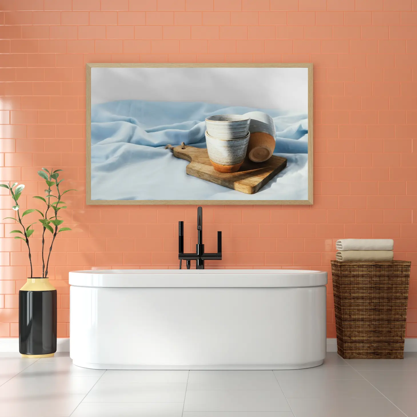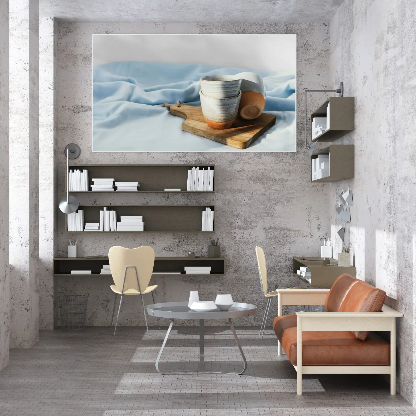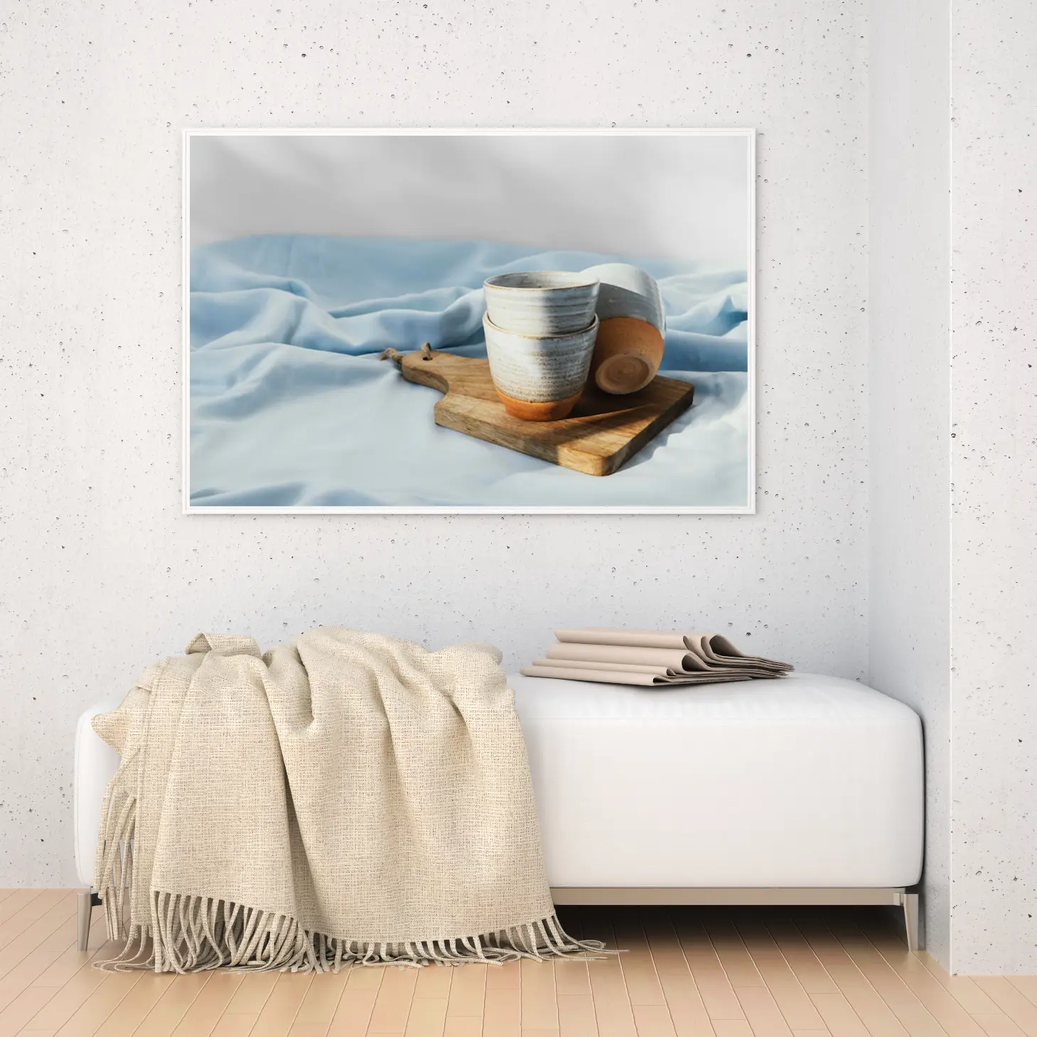 تتجلى في هذه اللوحة الفنية أجواء من الهدوء والسكينة، حيث تتناغم الألوان الهادئة مع الأشكال البسيطة لتخلق مشهداً يبعث على الراحة النفسية. الأكواب الفخارية، بتفاصيلها الدقيقة، تتربع على سطح خشبي، محاطة بقماش أزرق ناعم، مما يضفي لمسة من الأناقة العصرية على أي مساحة. إن هذا العمل الفني ليس مجرد ديكور جداري، بل هو تعبير عن أسلوب حياة يقدّر الجمال البسيط والراحة.