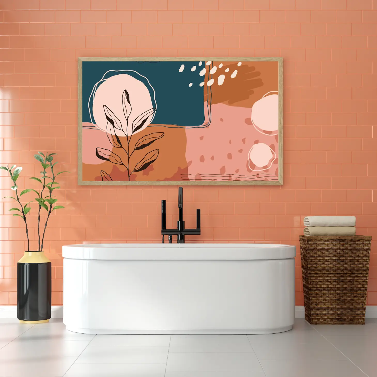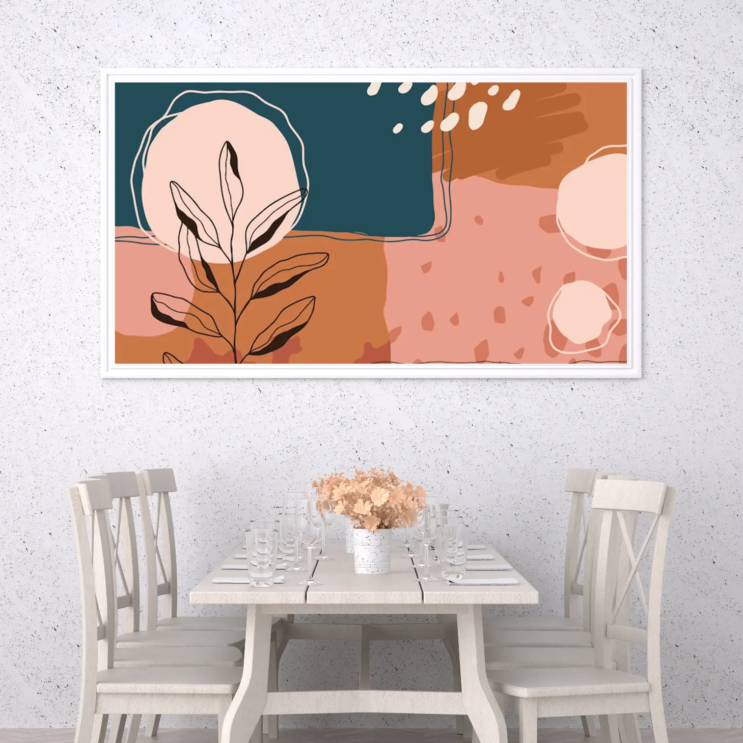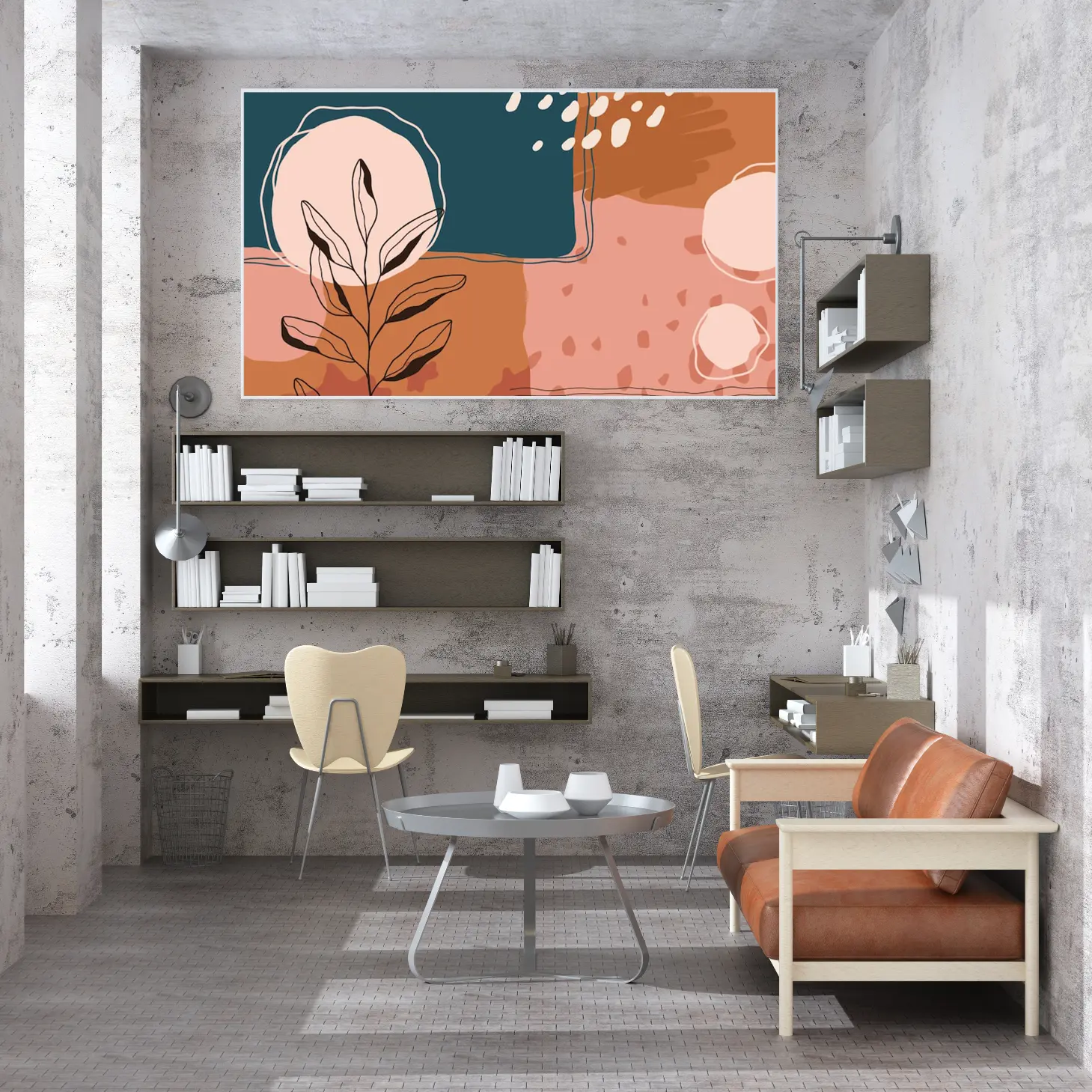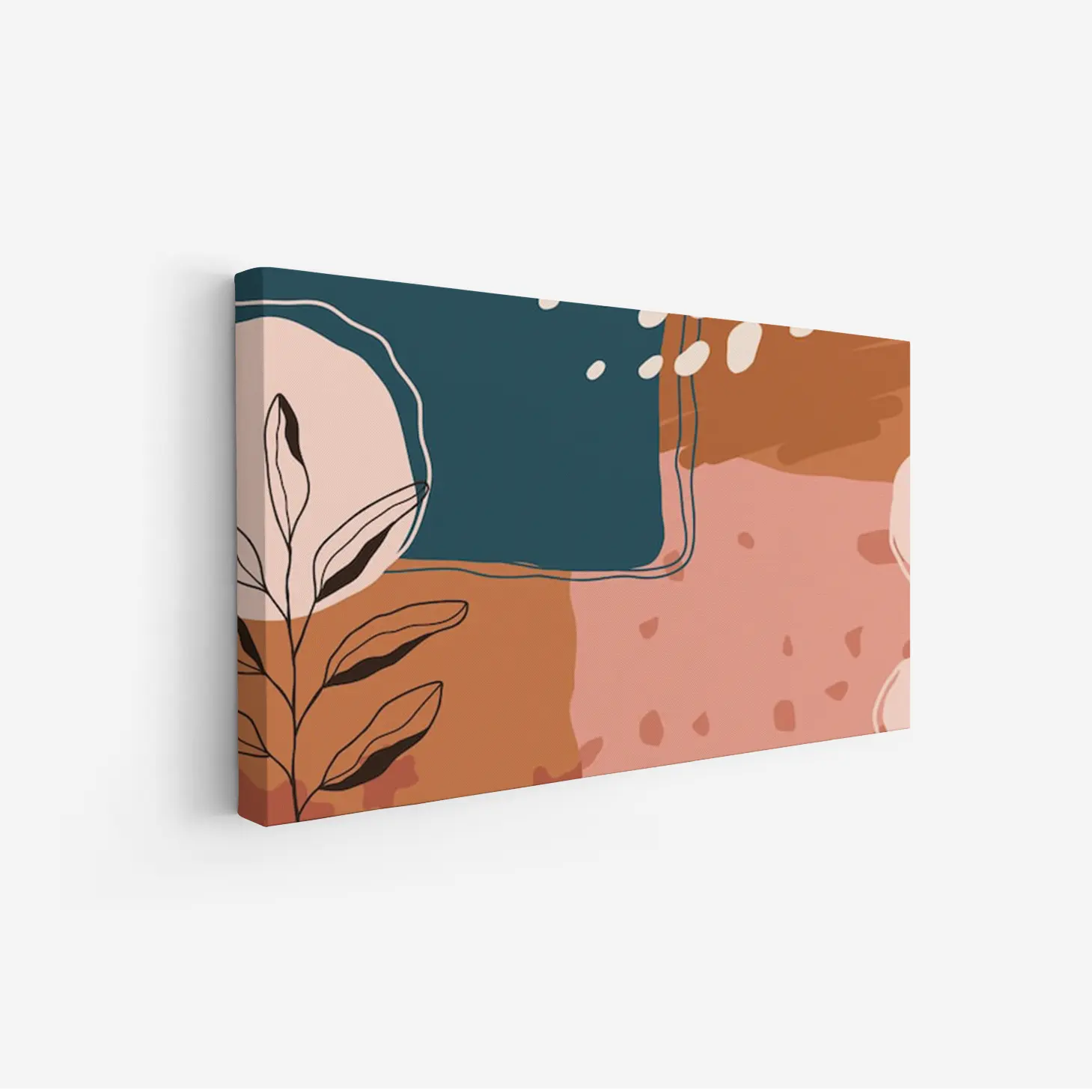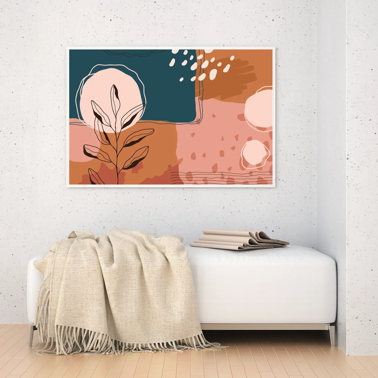 تتجلى في هذه اللوحة الفنية المعاصرة ملامح جمالية تنبض بالحياة، حيث تتناغم الألوان الدافئة مع لمسات من الأشكال الهندسية، مما يخلق إحساسًا بالهدوء والتوازن. تبرز الأشكال النباتية بشكل أنيق، مما يضفي لمسة طبيعية على الأجواء، ويعكس أسلوب حياة عصري يتسم بالبساطة والأناقة. إن وجود هذه القطعة في أي مساحة يضفي لمسة من الفخامة، ويحول المكان إلى ملاذ مريح يبعث على الاسترخاء.