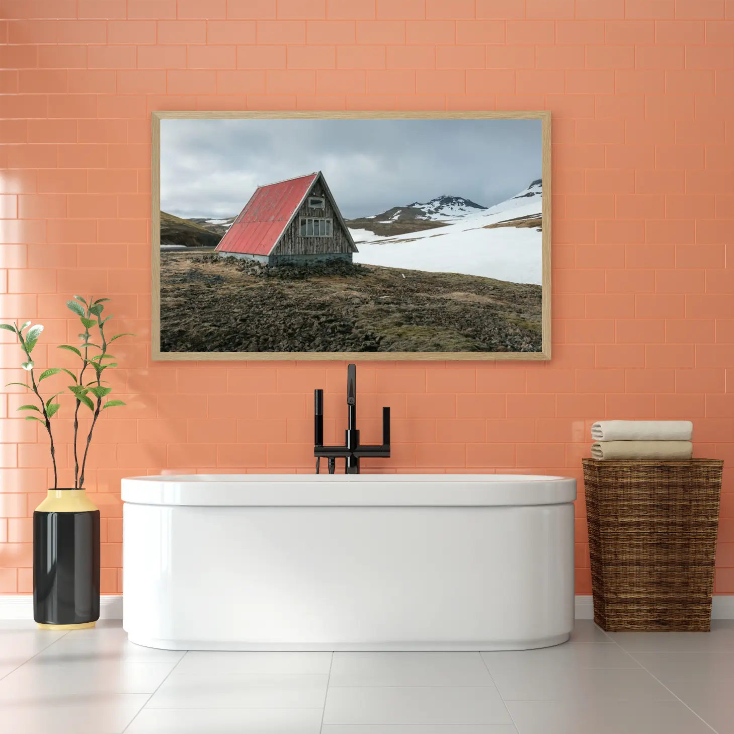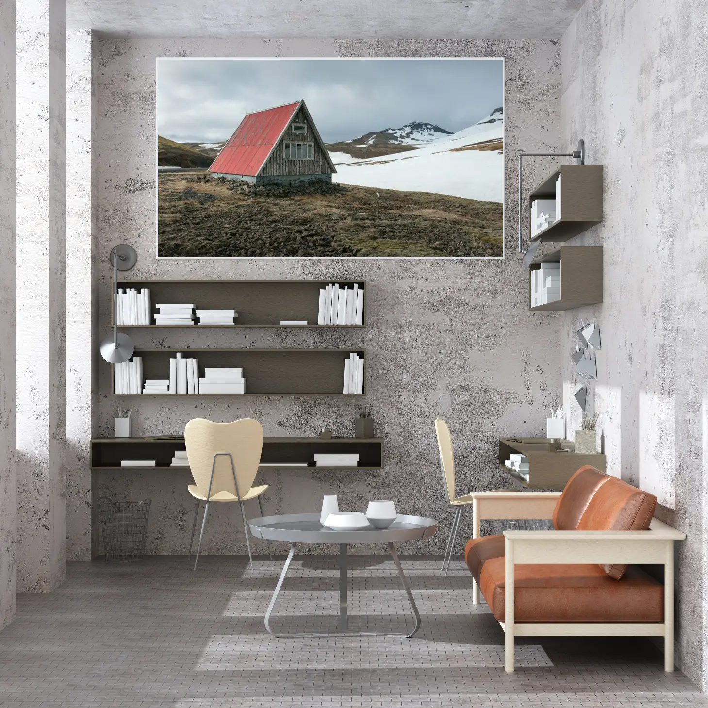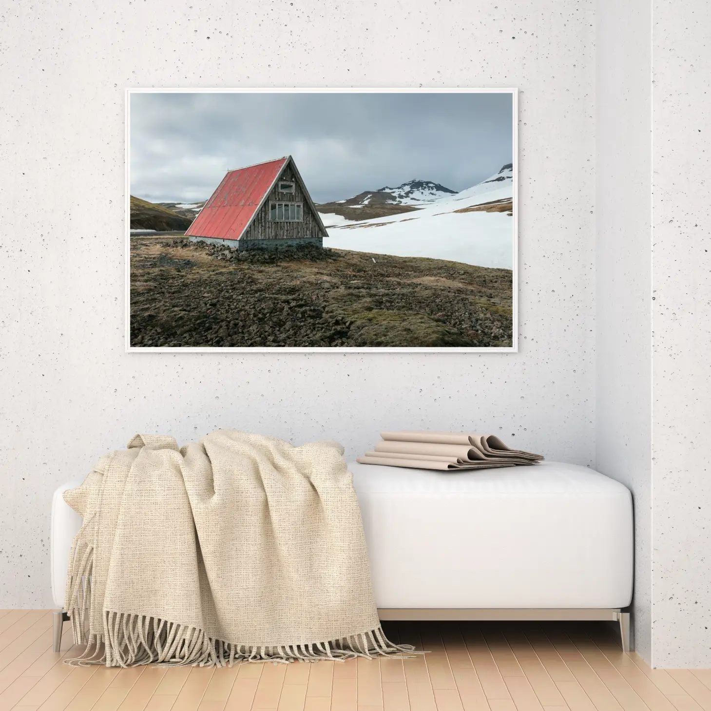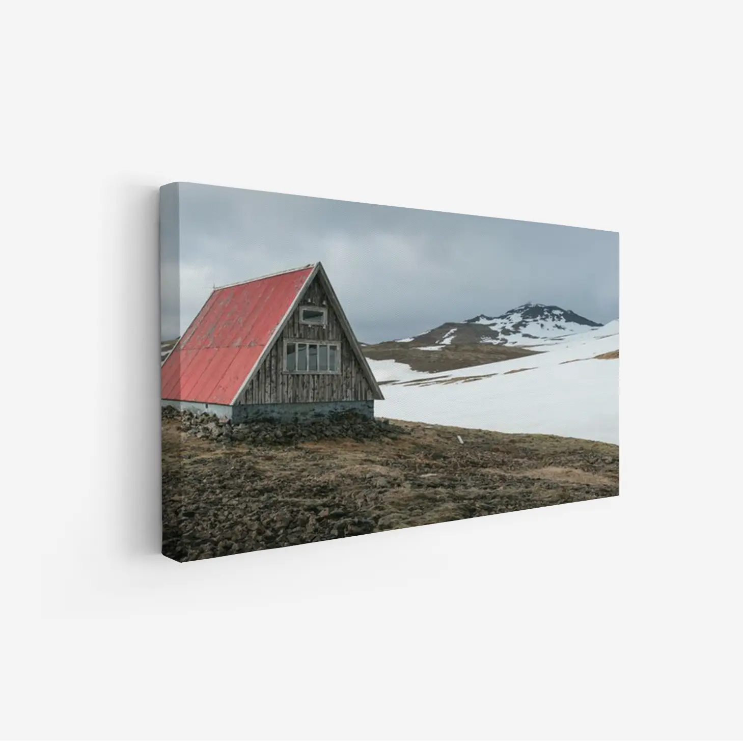 تجسد هذه اللوحة مشهدًا طبيعيًا ساحرًا، حيث يلتقي جمال الطبيعة بلمسة من العمارة التقليدية. يظهر في الخلفية جبل مهيب يكتسي بغطاء ثلجي، بينما تتوسطه كوخ خشبي ذو سقف أحمر، مما يضفي على المكان إحساسًا بالهدوء والسكينة. تعكس الألوان الهادئة والدرجات الرمادية في السماء توازنًا فنيًا، مما يجعل هذه القطعة مثالية لإضفاء لمسة من الأناقة على أي مساحة.
