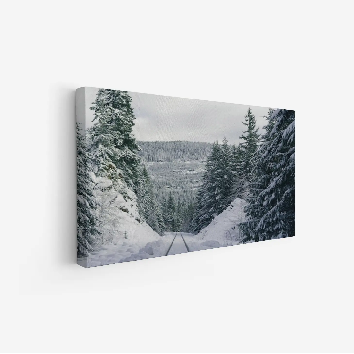 لوحة طبيعة هادئة تظهر غابات مغطاة بالثلوج وأشجار خضراء تحت سماء رمادية، لوحات طبيعة، لوحات كانفاس.