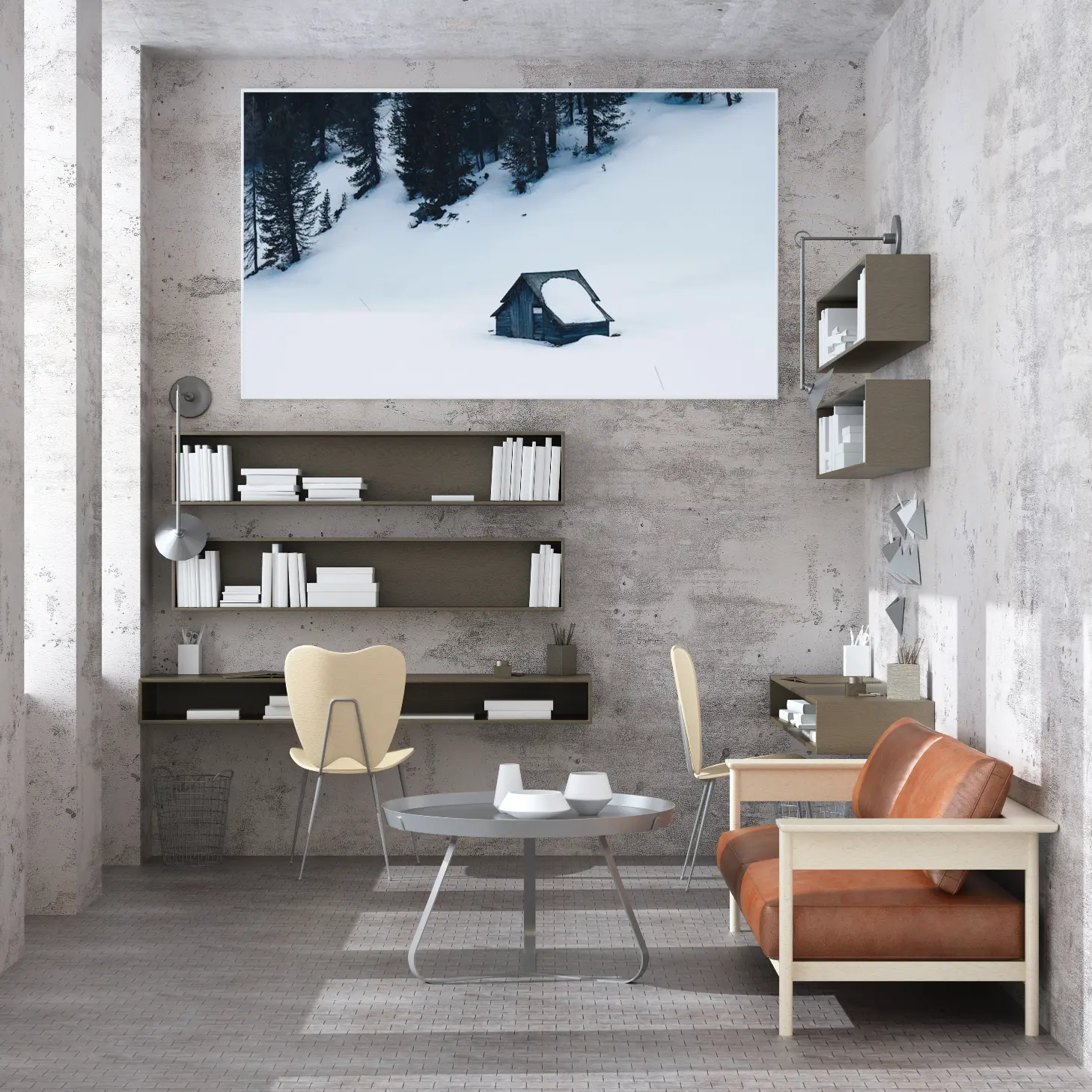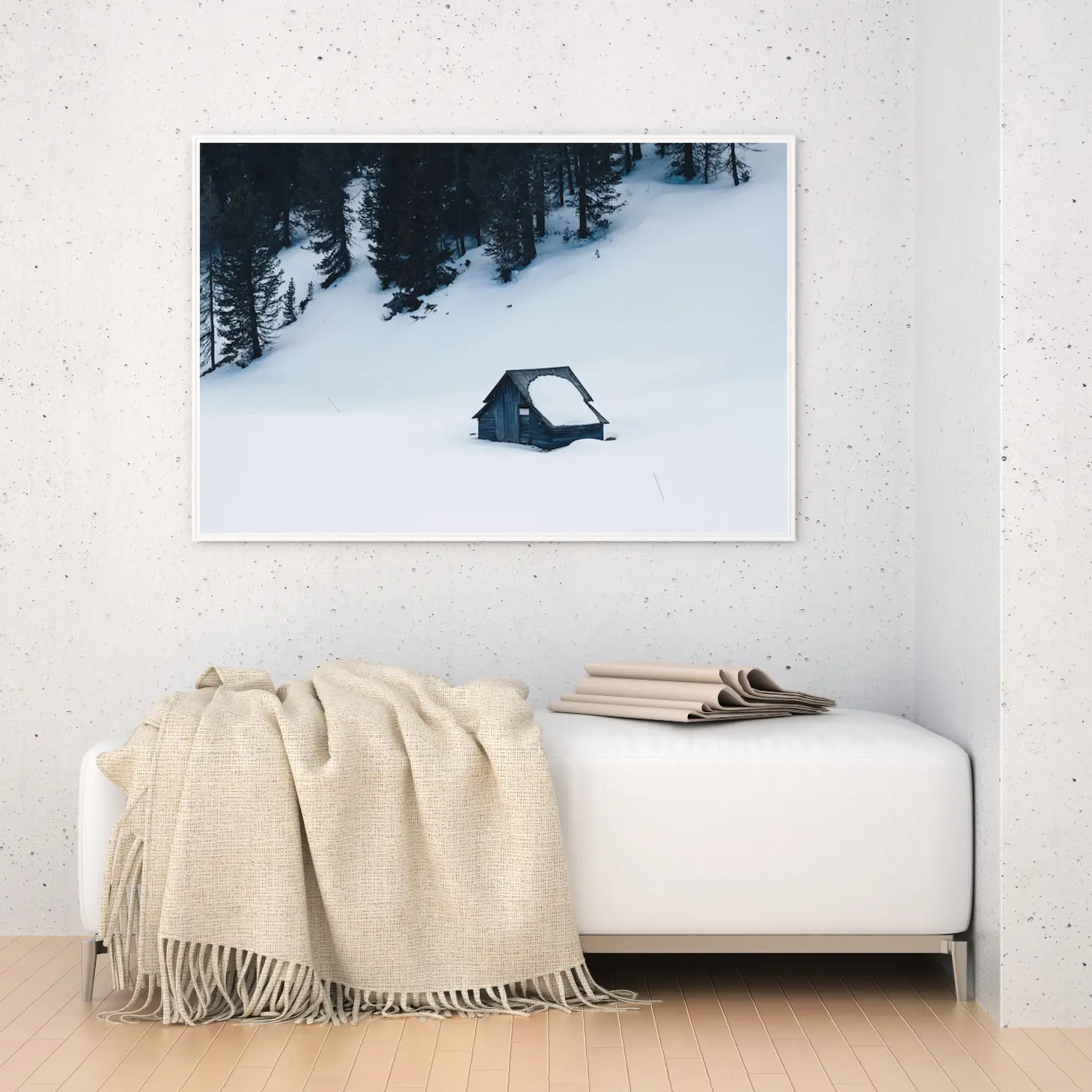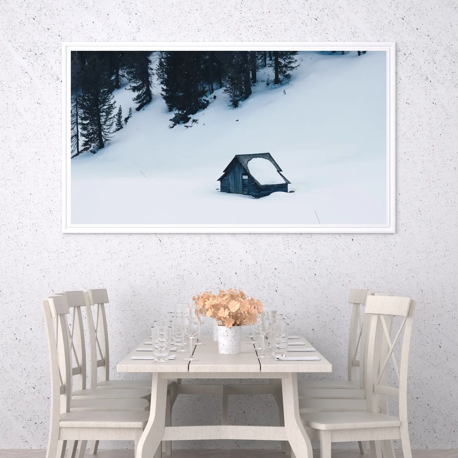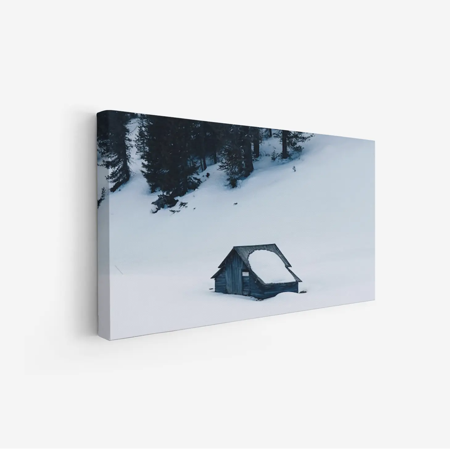 لوحة طبيعة هادئة تعكس جمال الثلوج البيضاء مع كوخ خشبي محاط بالأشجار الداكنة، لوحات طبيعة، لوحات كانفاس.
