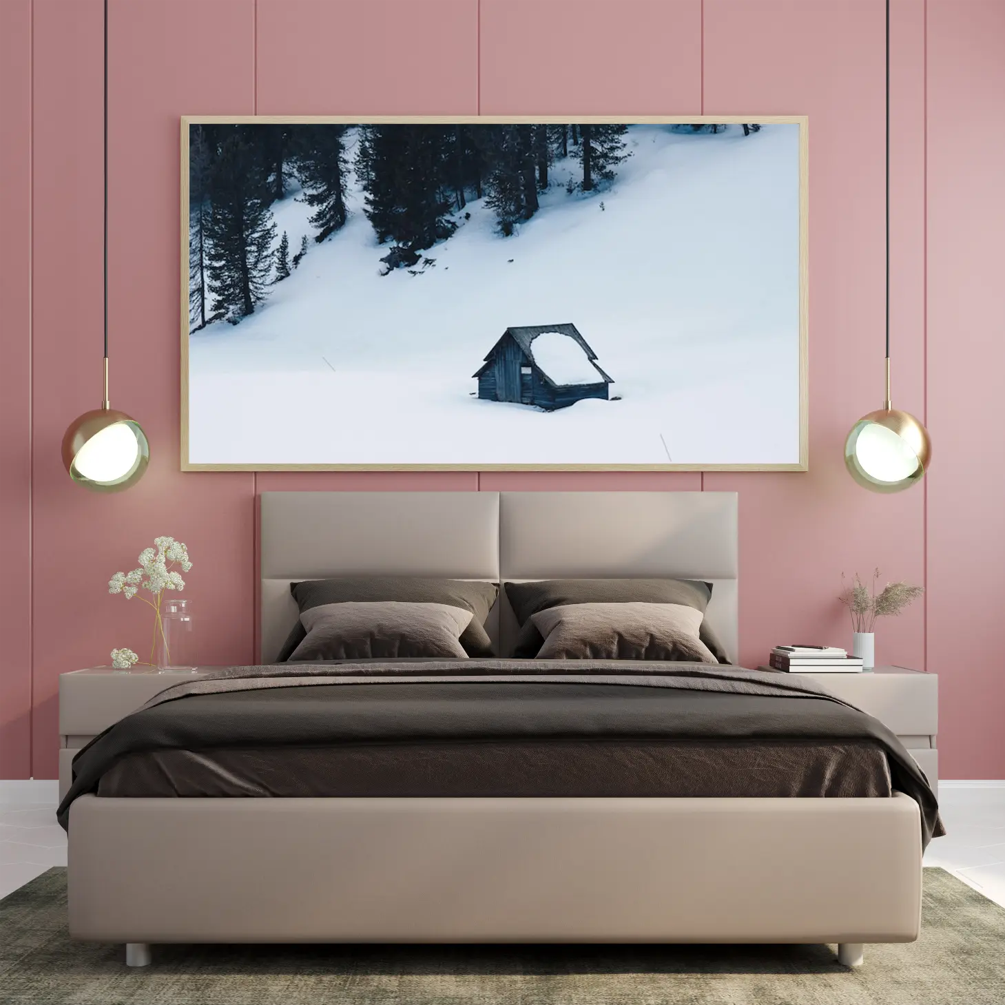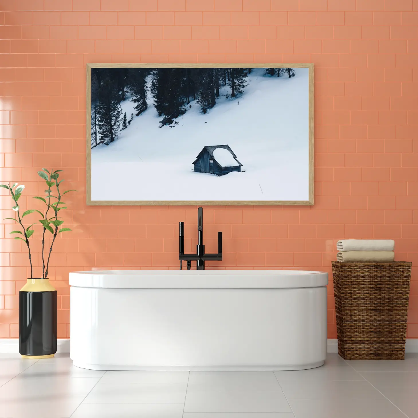 تجسد هذه اللوحة جمال الطبيعة الخلابة، حيث تتناغم الألوان الباردة مع مشهد الثلوج الواسع الذي يبعث على الهدوء والسكينة. تبرز الكوخ الخشبي وسط هذا المنظر، مما يخلق تباينًا رائعًا يجذب الأنظار ويعكس روح العزلة والهدوء. إن الأجواء العامة لهذه القطعة الفنية تضفي لمسة من السحر على أي مساحة، مما يجعلها خيارًا مثاليًا لمن يسعى لإضفاء لمسة من الرقي والهدوء على ديكوره المنزلي.