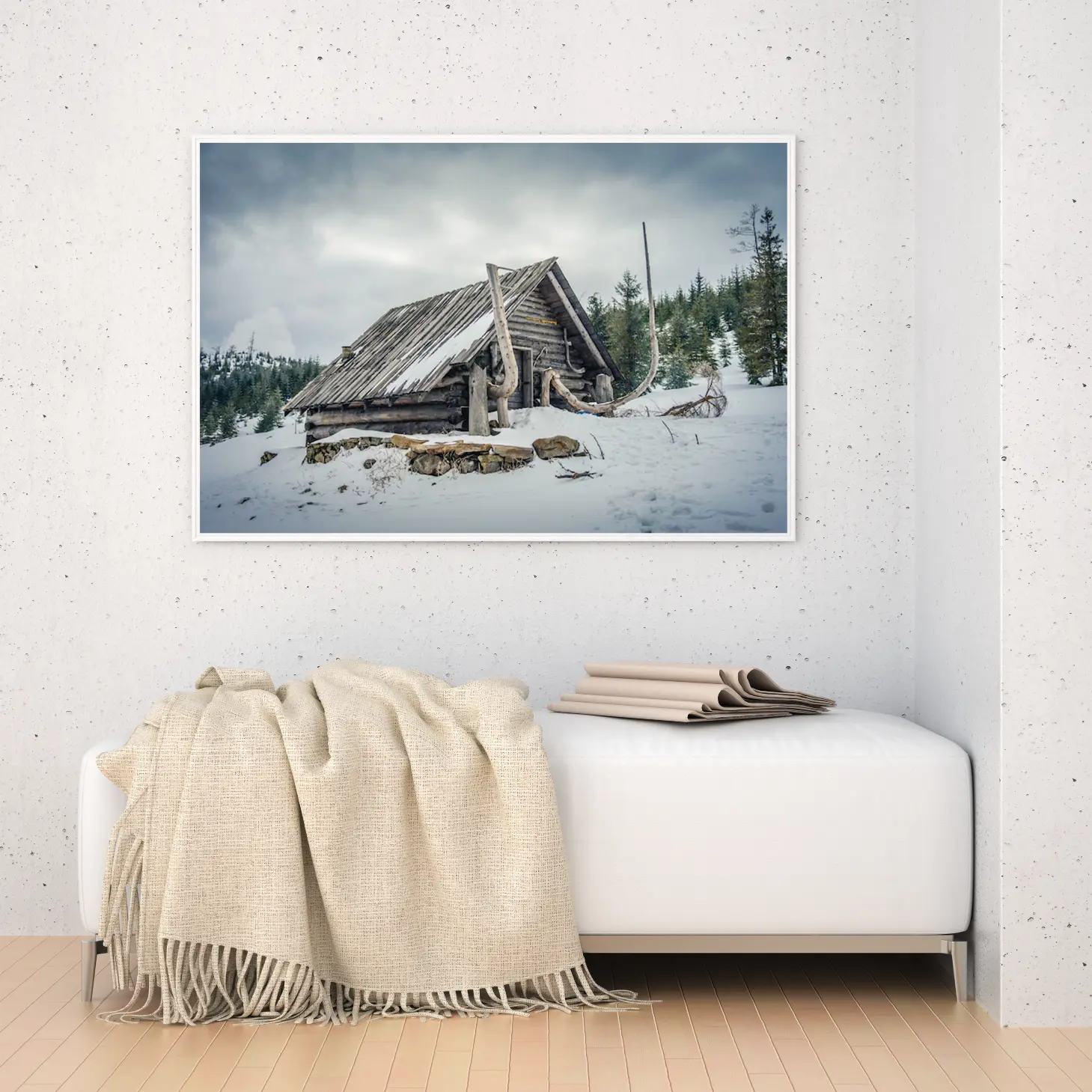 لوحة طبيعة هادئة تعكس كوخًا خشبيًا محاطًا بالثلوج والأشجار الخضراء تحت سماء غائمة، لوحات طبيعة، لوحات كانفاس.