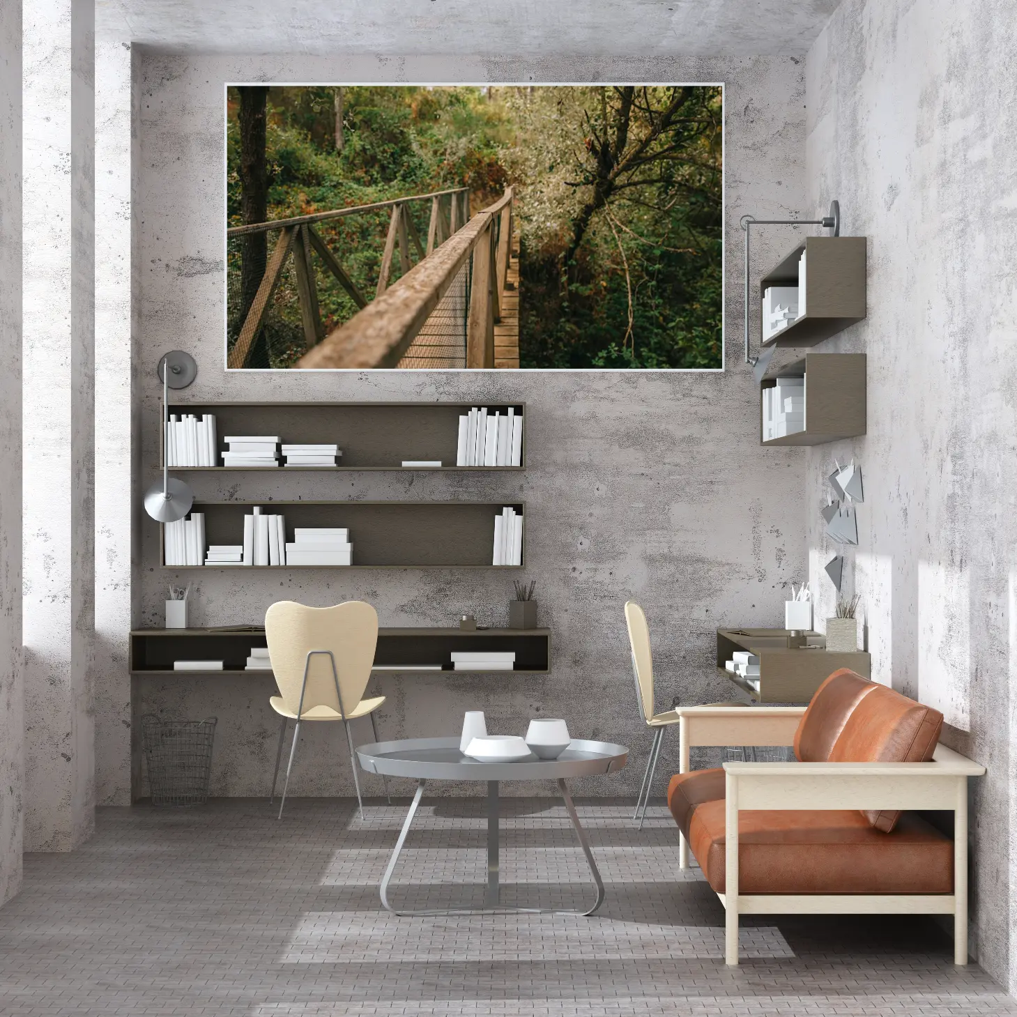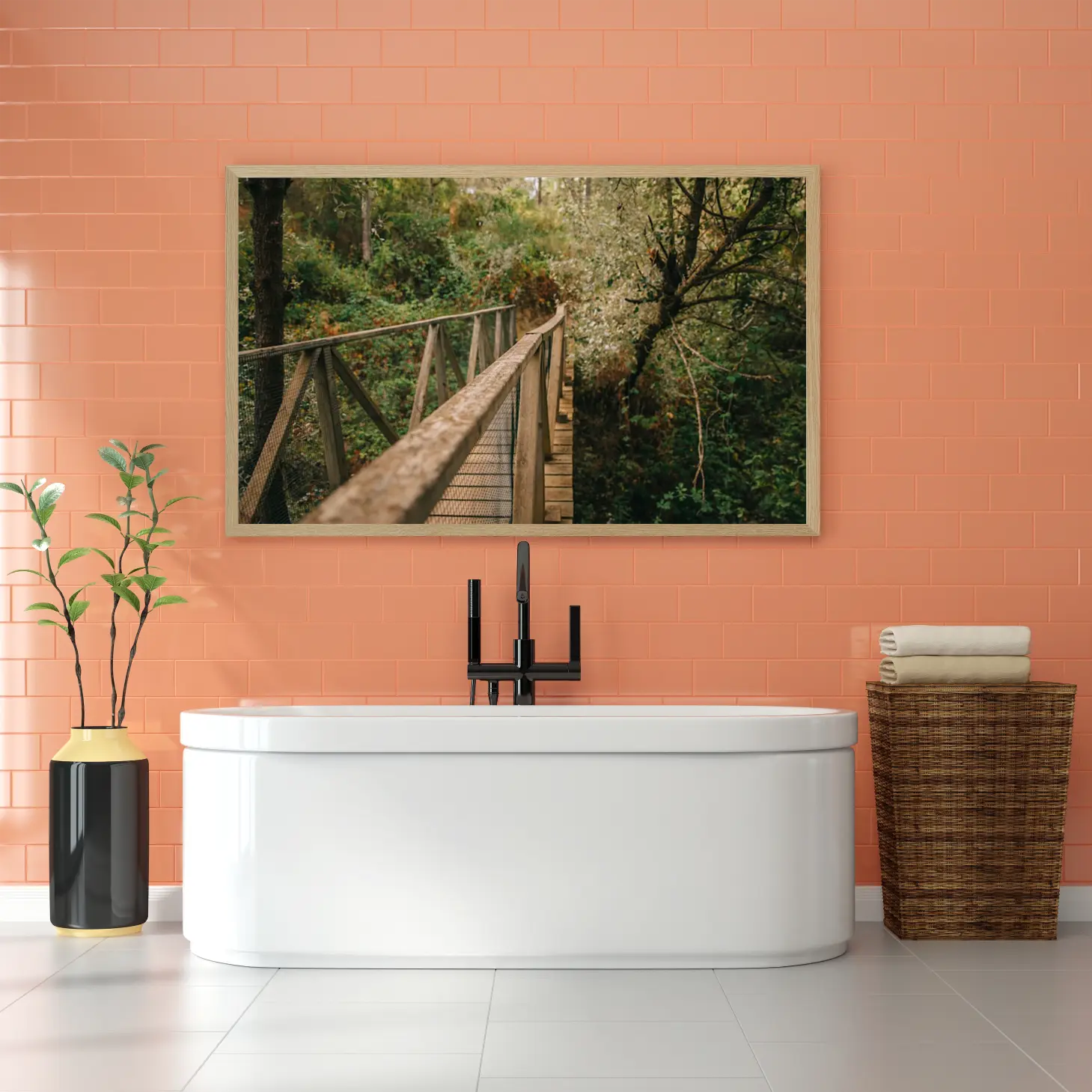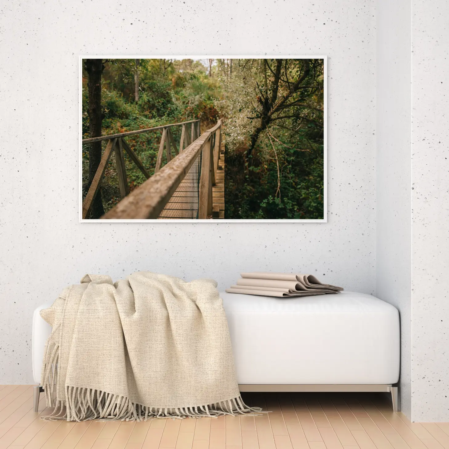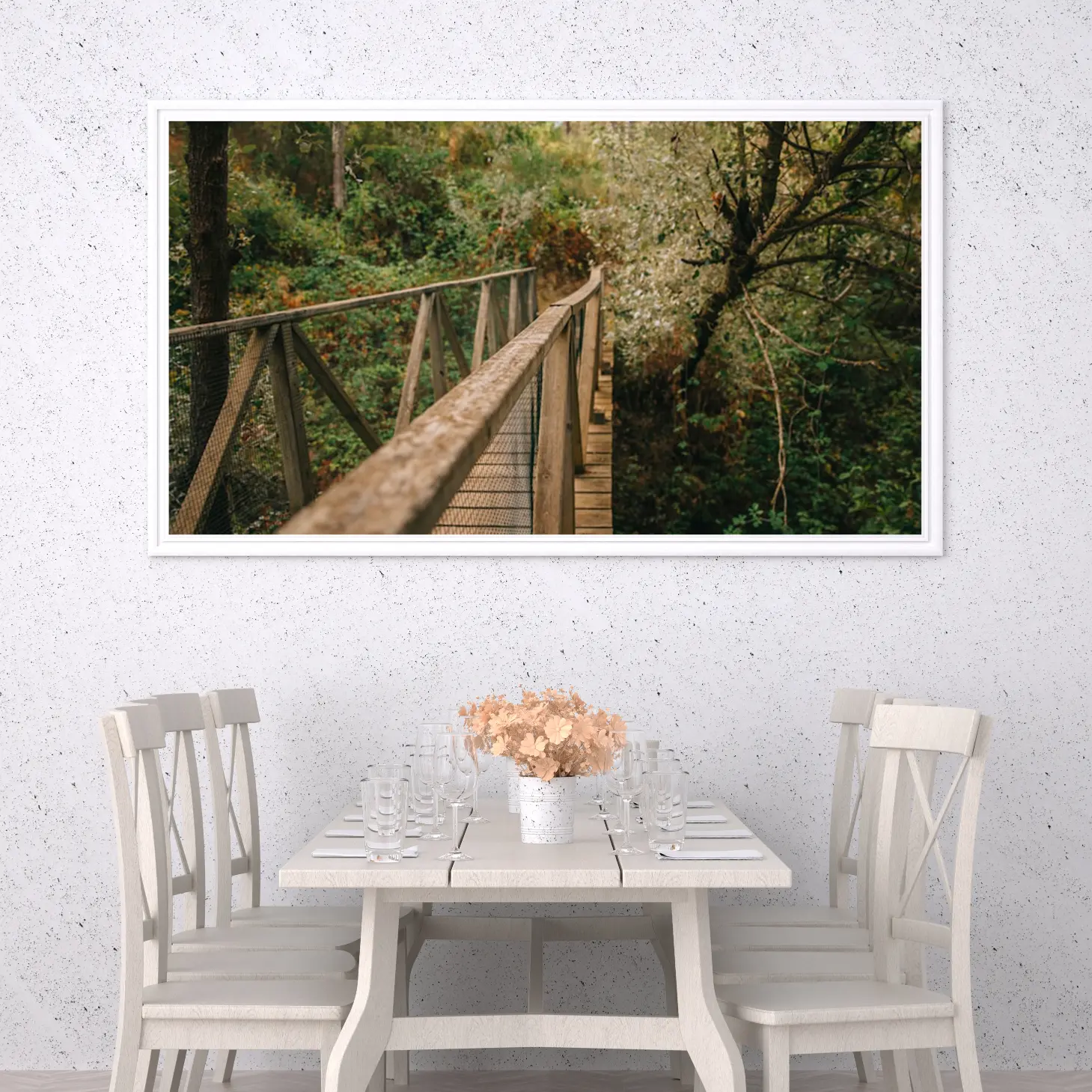 تجسد هذه اللوحة جمال الطبيعة الخلابة من خلال مشهد جسر خشبي يتناغم مع محيطه الأخضر. تعكس الألوان الدافئة والهادئة إحساسًا بالسكينة والهدوء، مما يجعلها خيارًا مثاليًا لإضفاء لمسة من الجمال الطبيعي على أي مساحة. تساهم هذه القطعة الفنية في خلق أجواء مريحة تعزز من نمط الحياة العصري، حيث يمكن أن تكون نقطة محورية في الديكور المنزلي.