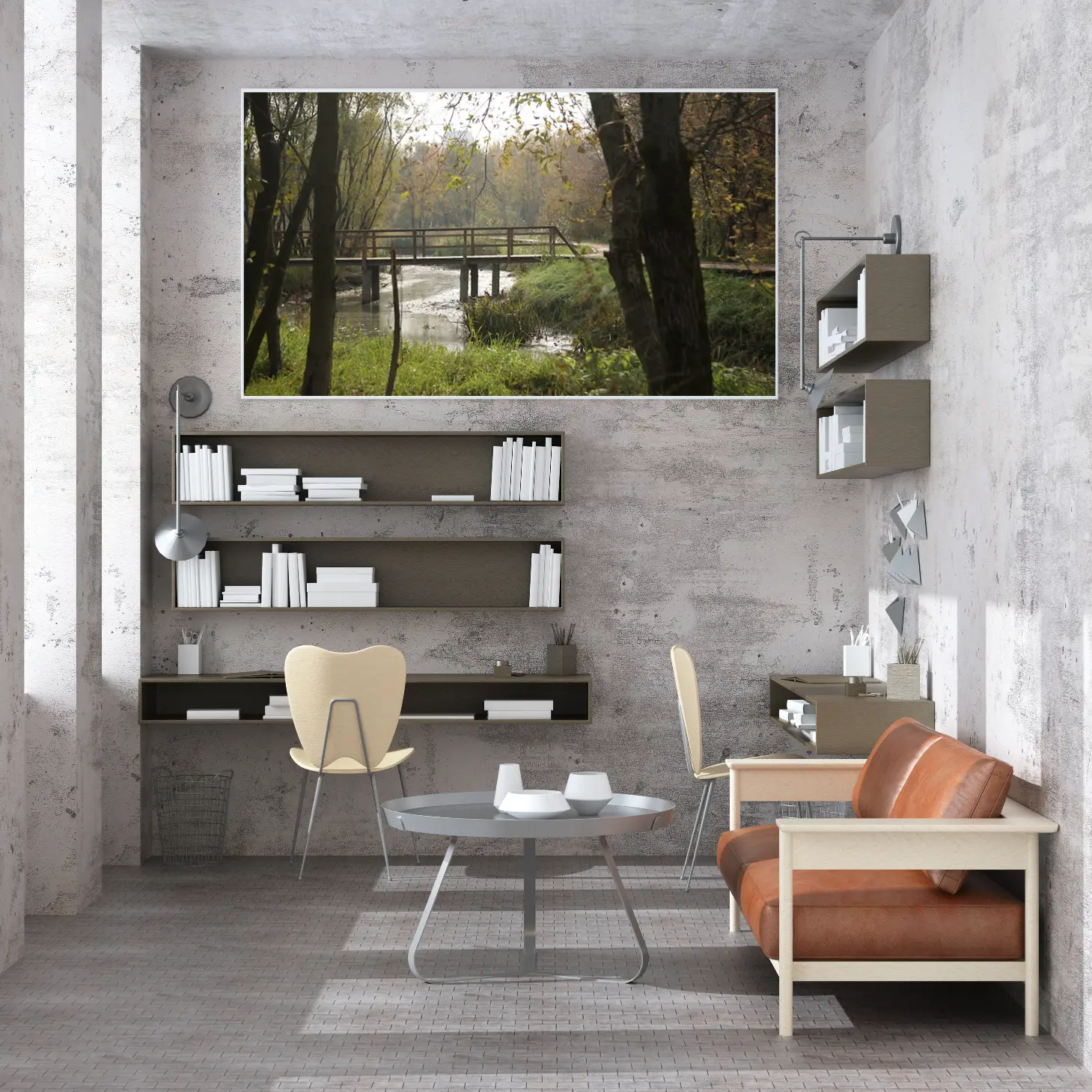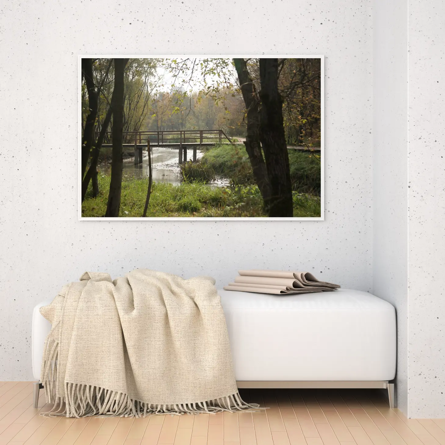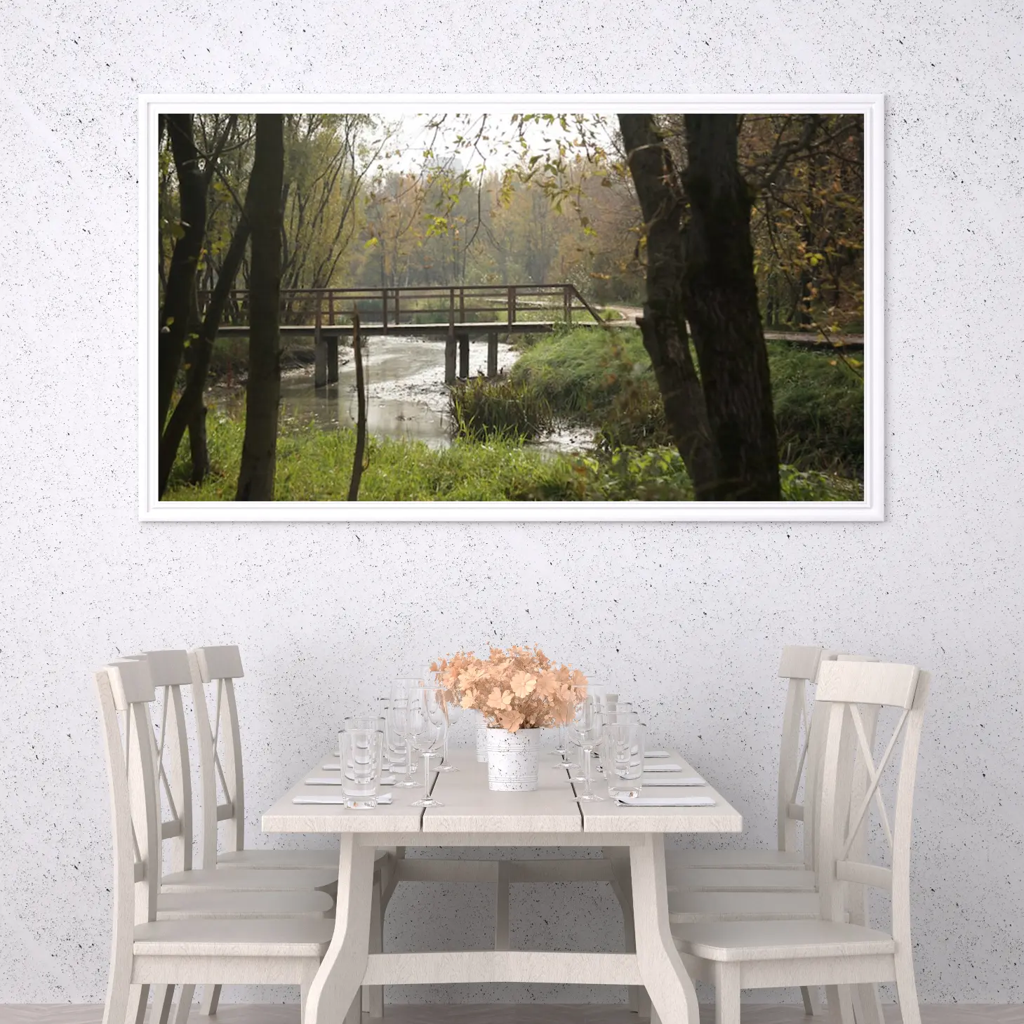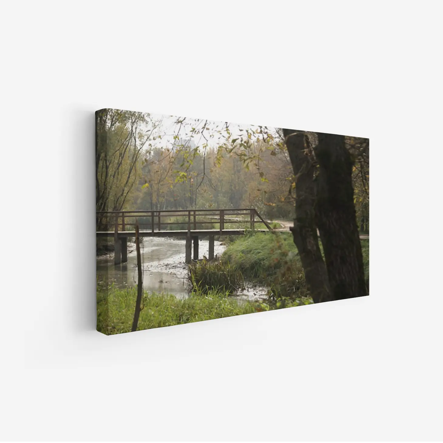 تتجلى في هذه اللوحة جماليات الطبيعة الخلابة، حيث يبرز جسر خشبي يعبر فوق مجرى مائي هادئ، محاط بأشجار تتناغم ألوانها بين الأخضر والذهبي. تعكس الأجواء السلمية والهادئة للمشهد إحساسًا بالسكينة والراحة، مما يجعلها خيارًا مثاليًا لإضفاء لمسة من الهدوء على أي مساحة. إن هذه القطعة الفنية ليست مجرد ديكور جداري، بل هي استثمار جمالي يعكس ذوقك الرفيع ويعزز نمط حياتك العصري.