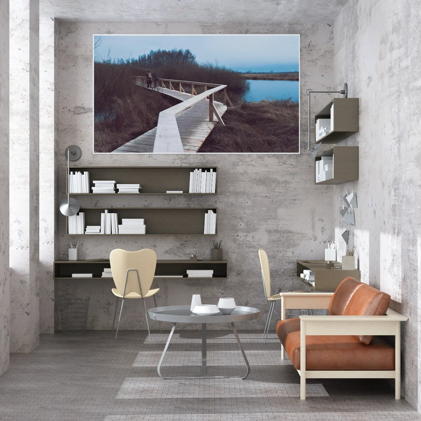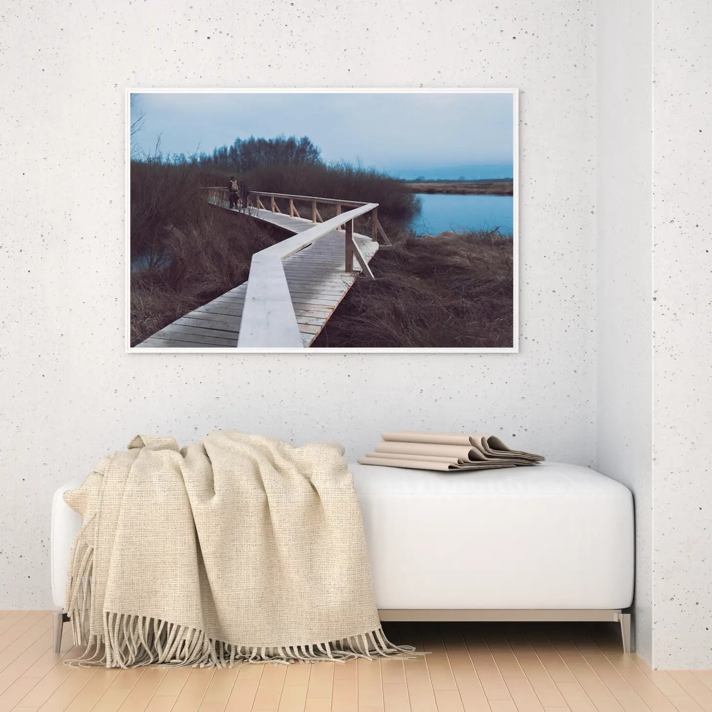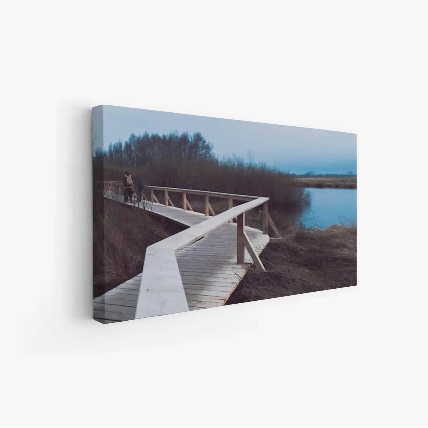 استمتع بجمال الطبيعة الخلابة مع هذه اللوحة الفنية التي تجسد لحظة ساحرة على جسر خشبي يلتف حول بحيرة هادئة، حيث يلتقي الهدوء مع جمال المناظر الطبيعية. تتوفر اللوحة بمقاسات متعددة وإطارات أنيقة، مما يجعلها خيارًا مثاليًا للتزيين أو كهدية تعبّر عن الذوق الرفيع في المناسبات الخاصة. اجعل من كل زاوية في منزلك لوحة فنية تعكس أسلوبك الفريد.