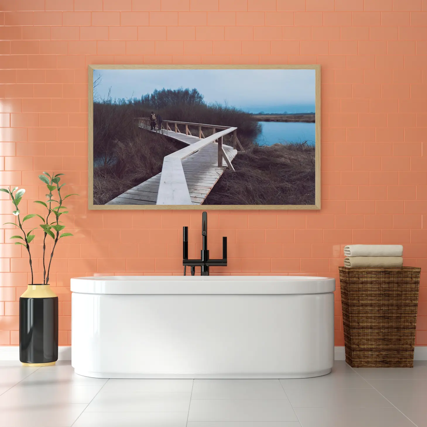 تجسد هذه اللوحة مشهدًا ساحرًا يلتقي فيه جمال الطبيعة مع بساطة الحياة. يظهر فيها ممر خشبي يلتف برفق حول ضفاف مائية، حيث يسير شخصان مع كلبهما، مما يضفي إحساسًا بالهدوء والسكينة. الألوان الهادئة التي تسيطر على المشهد، من الأزرق الفاتح إلى درجات البني الدافئة، تخلق جوًا مريحًا يعزز من جمال المكان ويعكس نمط حياة متوازن ومتناغم.