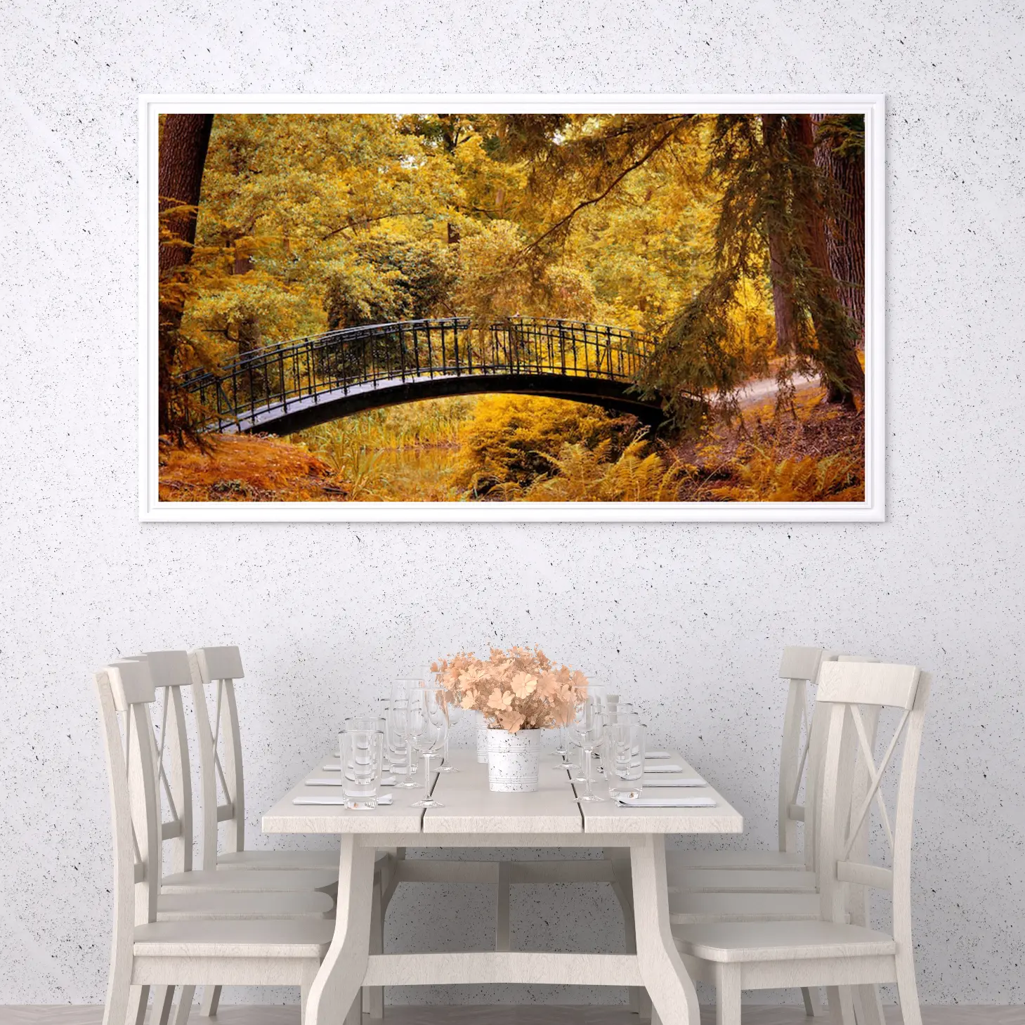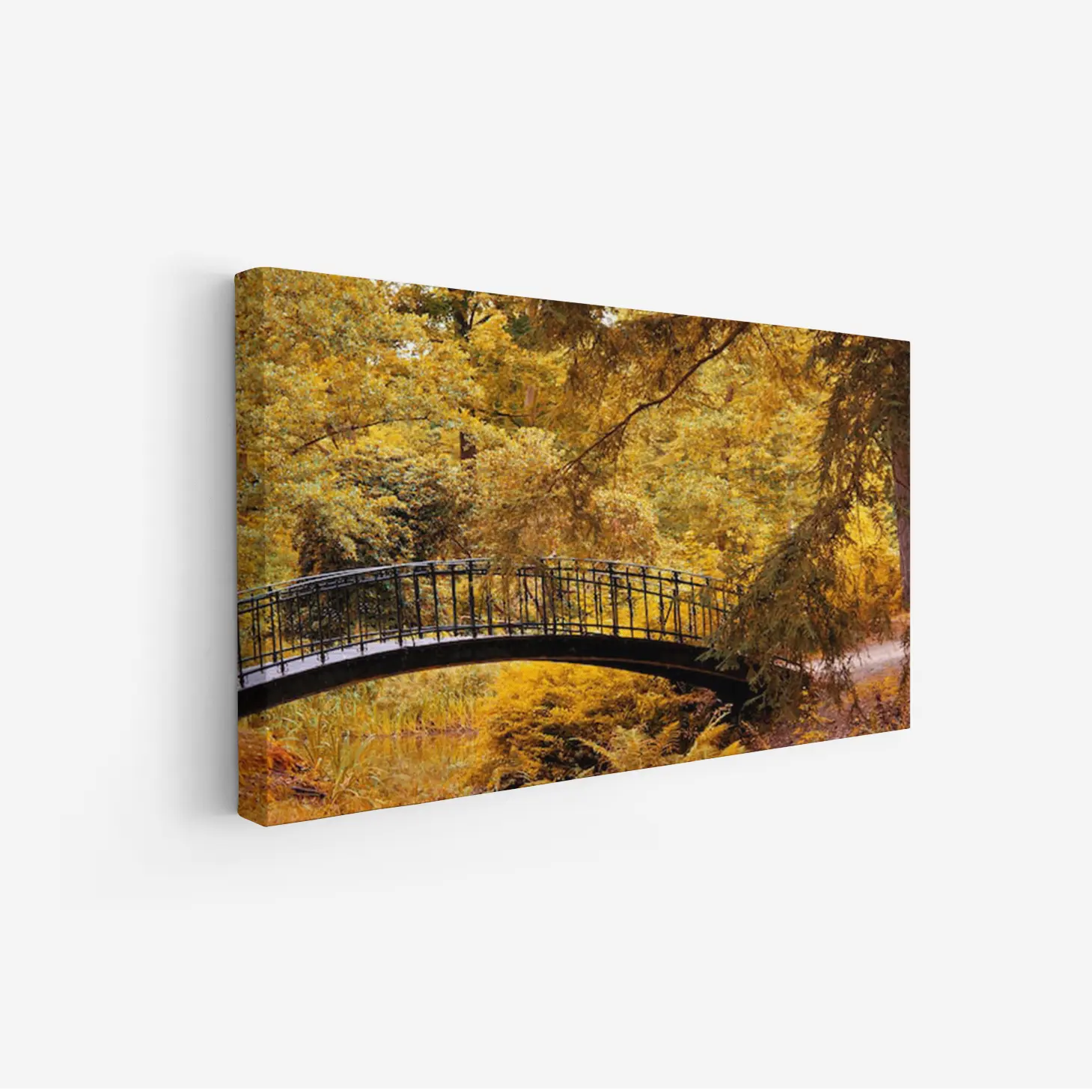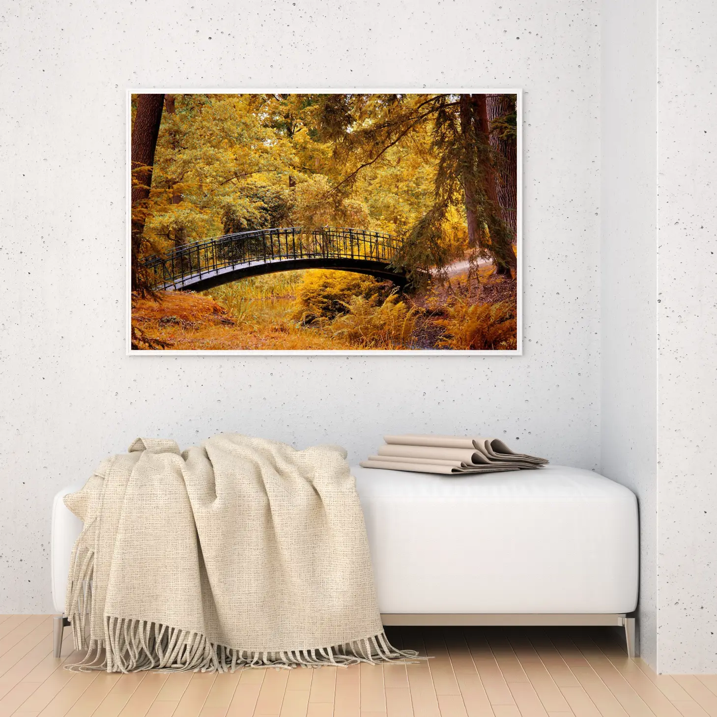تتجلى في هذه اللوحة جماليات الطبيعة الخلابة، حيث يبرز جسر أنيق يتوسط مشهدًا ساحرًا من الأشجار المورقة بألوانها الذهبية الدافئة. تنقل الألوان الزاهية إحساسًا بالهدوء والسكينة، مما يجعلها إضافة مثالية لأي مساحة. تعكس هذه القطعة الفنية نمط حياة متوازن، حيث تندمج عناصر الطبيعة مع الأناقة، مما يخلق أجواءً مريحة ومليئة بالإلهام.