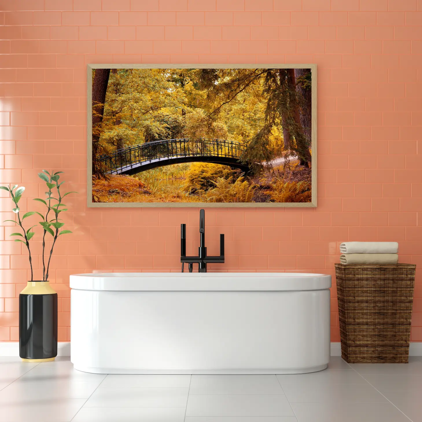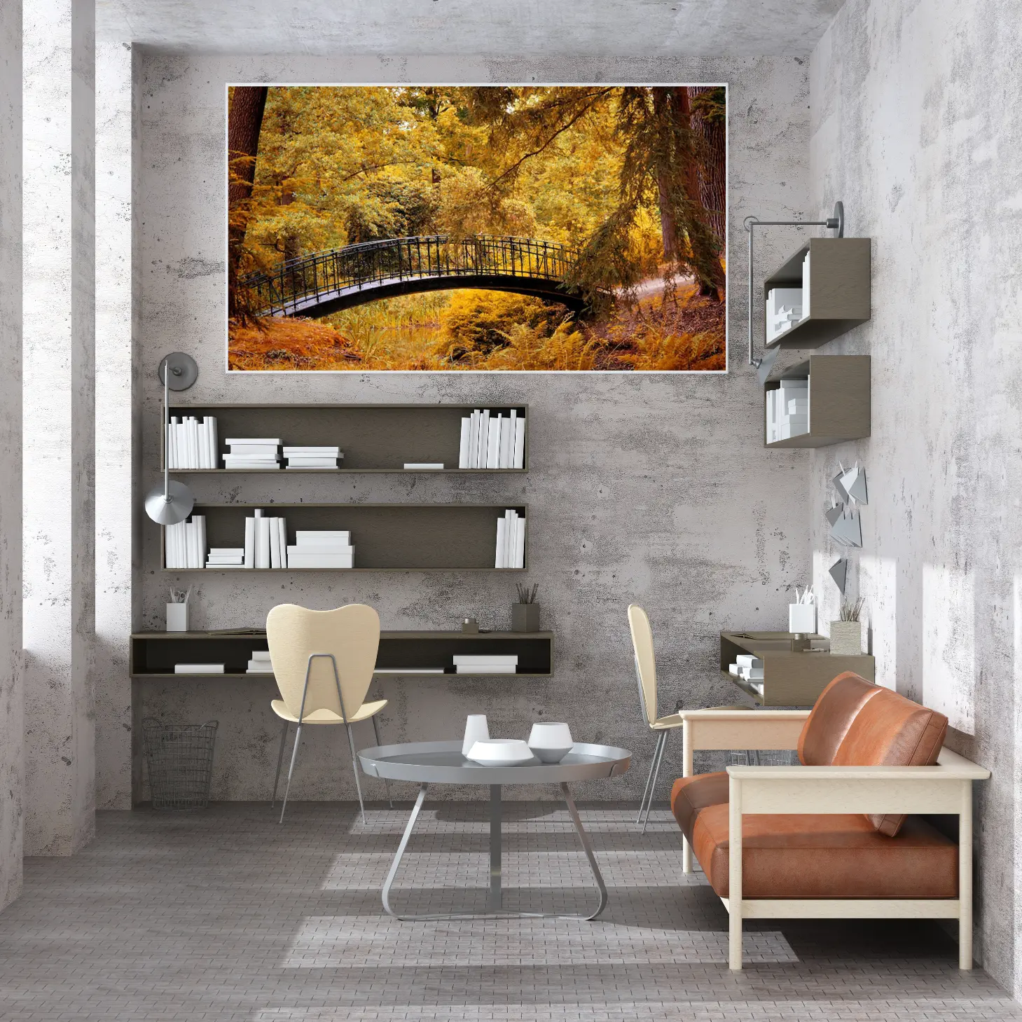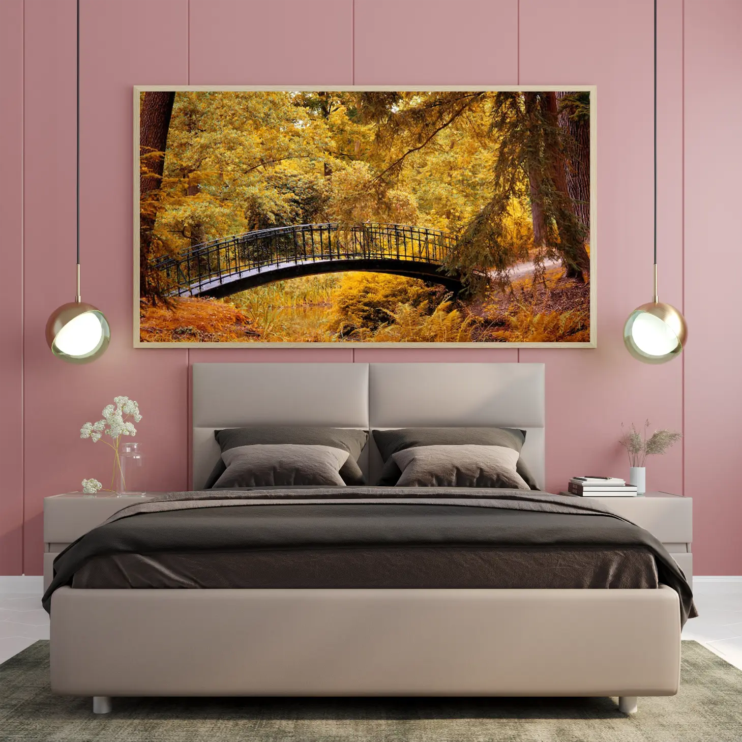 تتجلى في هذه اللوحة جماليات الطبيعة الخلابة، حيث يبرز جسر أنيق يتوسط مشهدًا ساحرًا من الأشجار المورقة بألوانها الذهبية الدافئة. تنقل الألوان الزاهية إحساسًا بالهدوء والسكينة، مما يجعلها إضافة مثالية لأي مساحة. تعكس هذه القطعة الفنية نمط حياة متوازن، حيث تندمج عناصر الطبيعة مع الأناقة، مما يخلق أجواءً مريحة ومليئة بالإلهام.