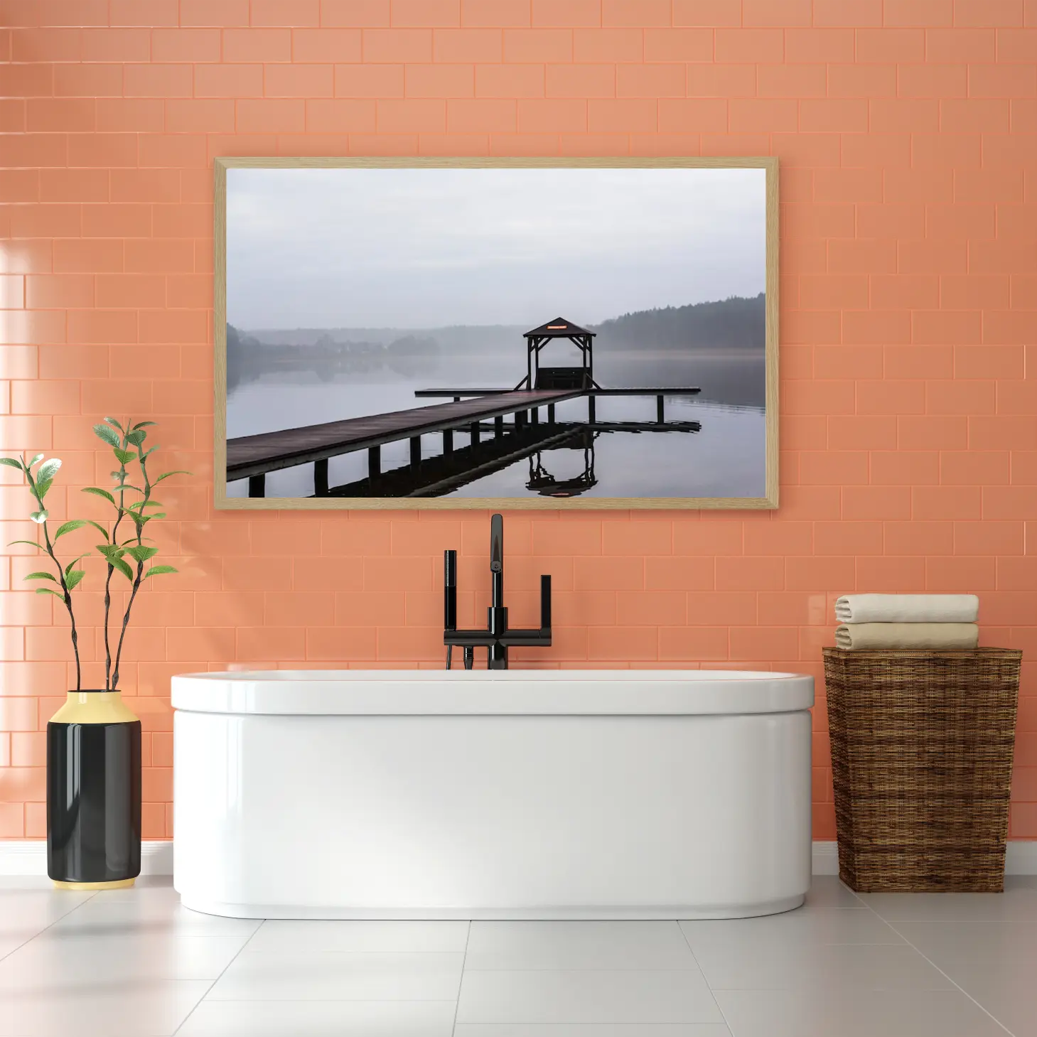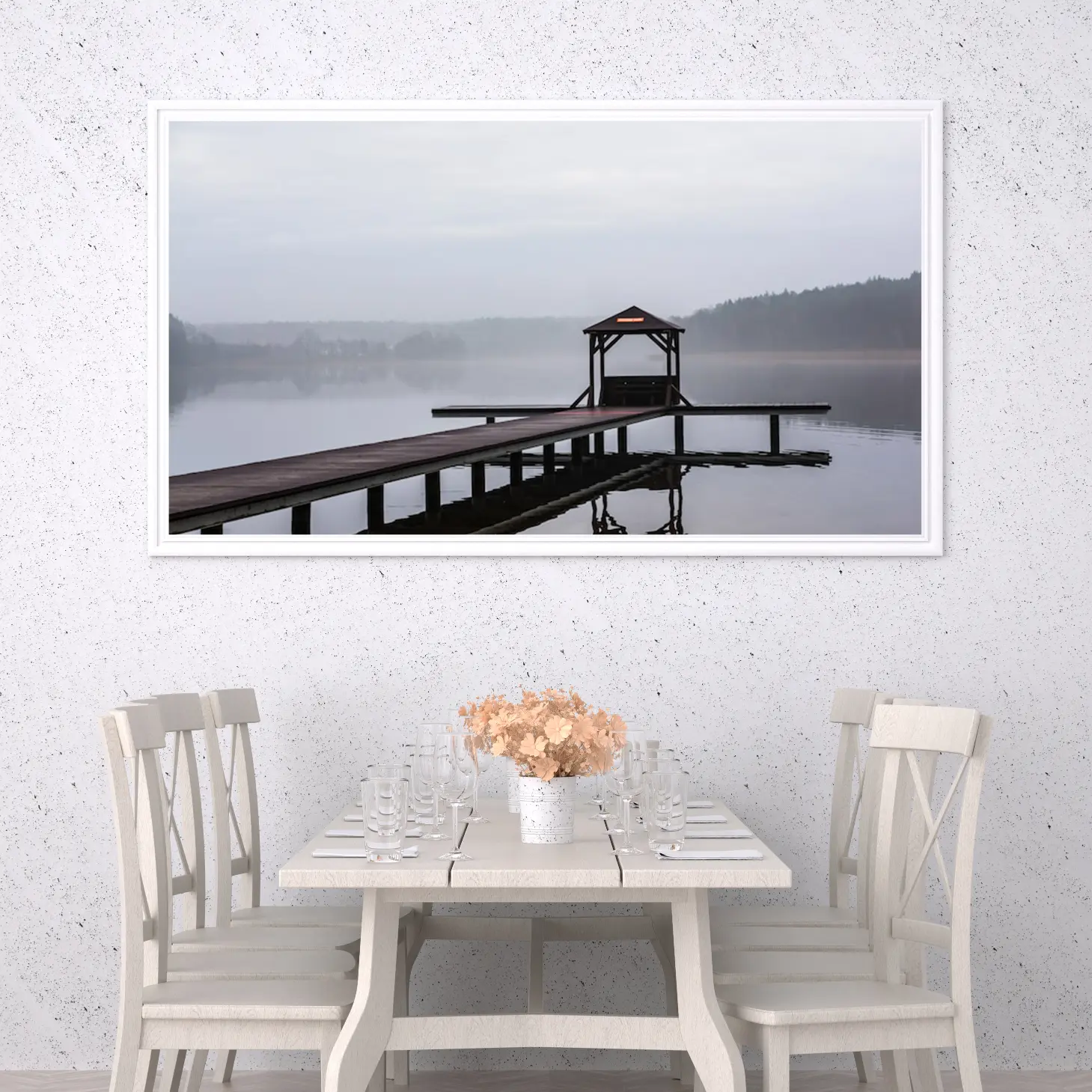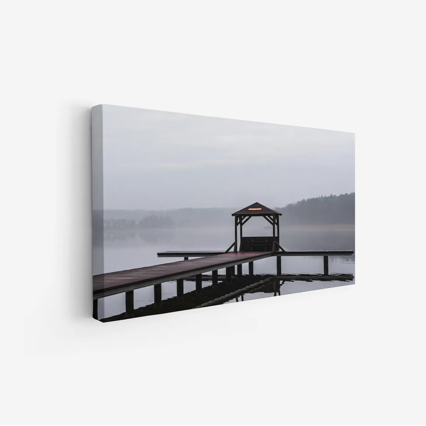 تجسد هذه اللوحة مشهدًا ساحرًا يعكس جمال الطبيعة في لحظة هادئة، حيث يلتقي الماء بالسماء في تناغم مثالي. يظهر الرصيف الخشبي الذي يمتد نحو الأفق، محاطًا بضباب خفيف يضفي على المكان هالة من الغموض والسكون. تعكس الألوان الهادئة والدرجات الرمادية شعورًا بالسكينة، مما يجعلها خيارًا مثاليًا لإضفاء جو من الهدوء والراحة على أي مساحة.