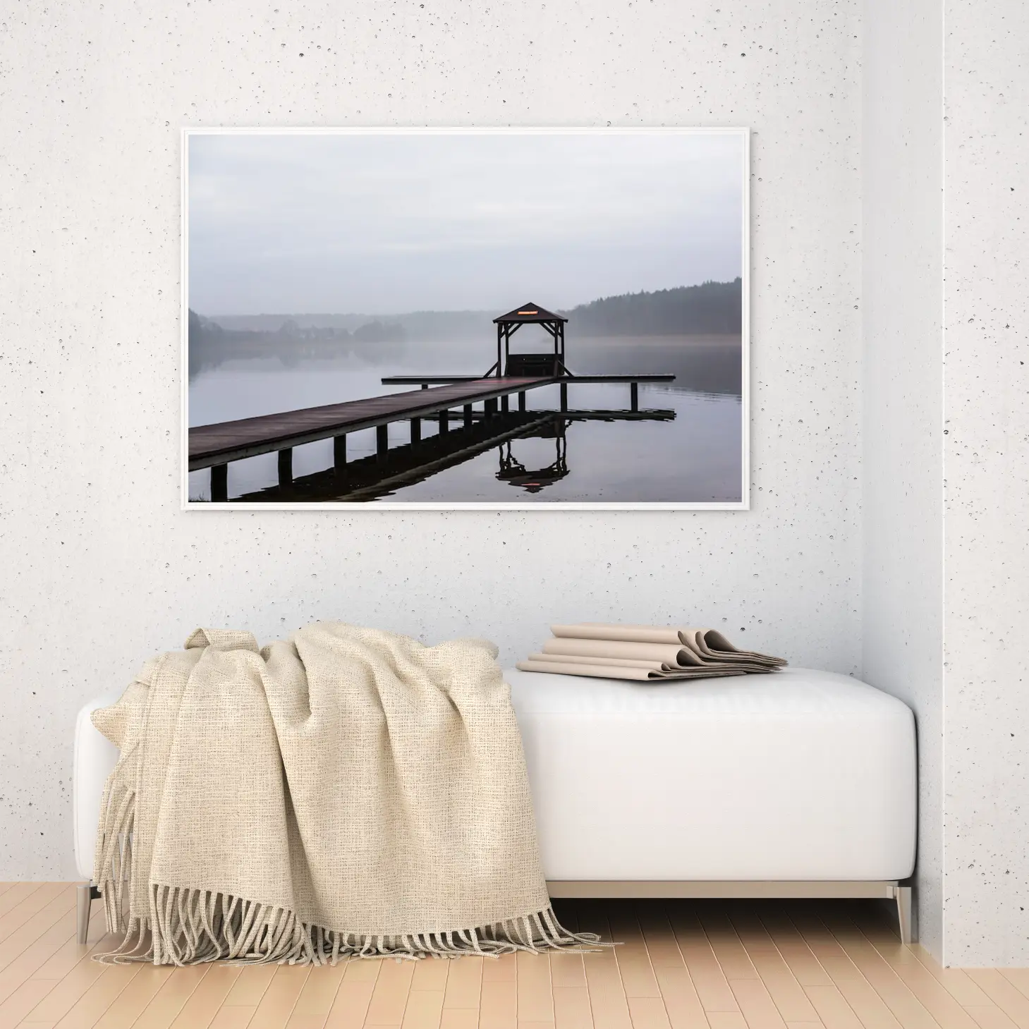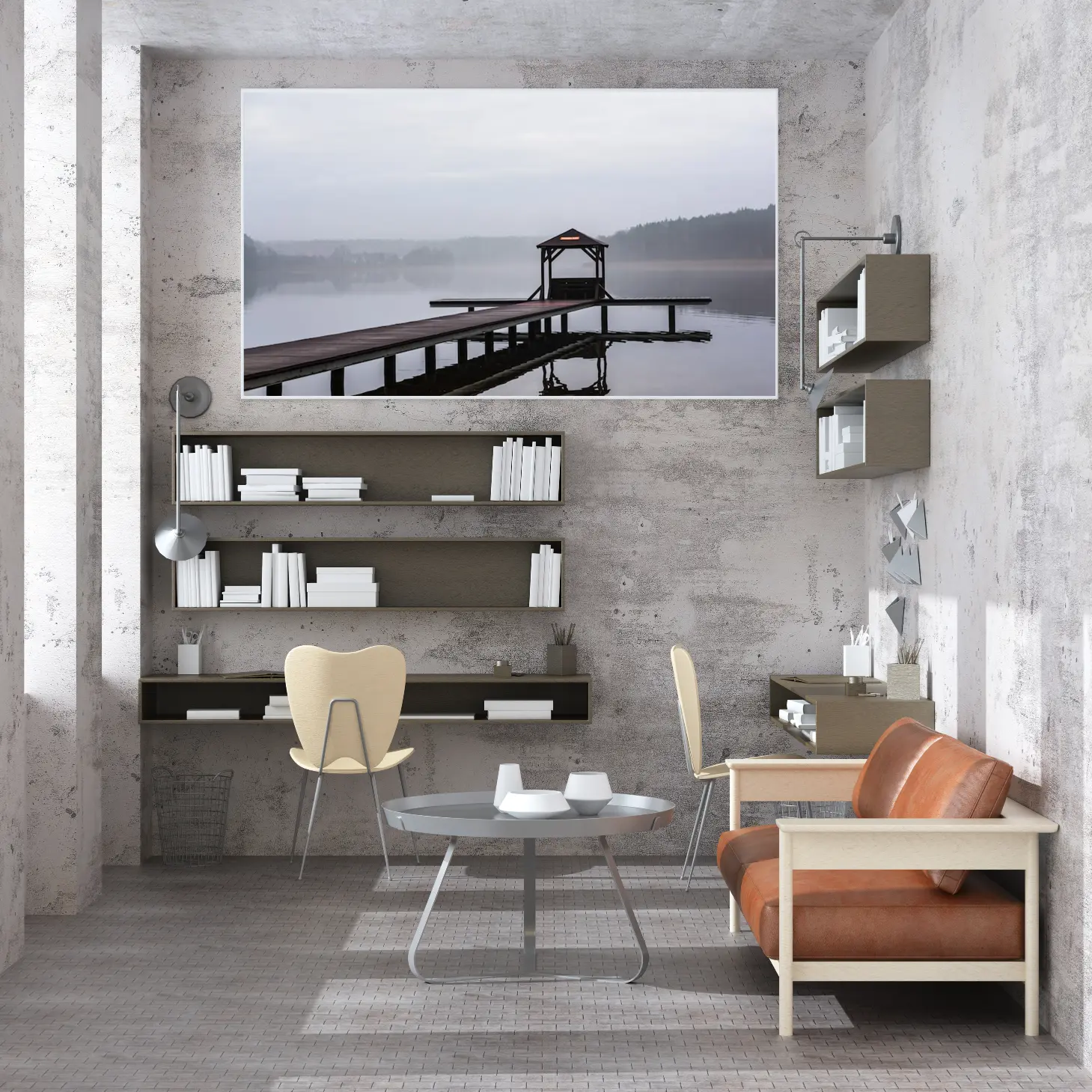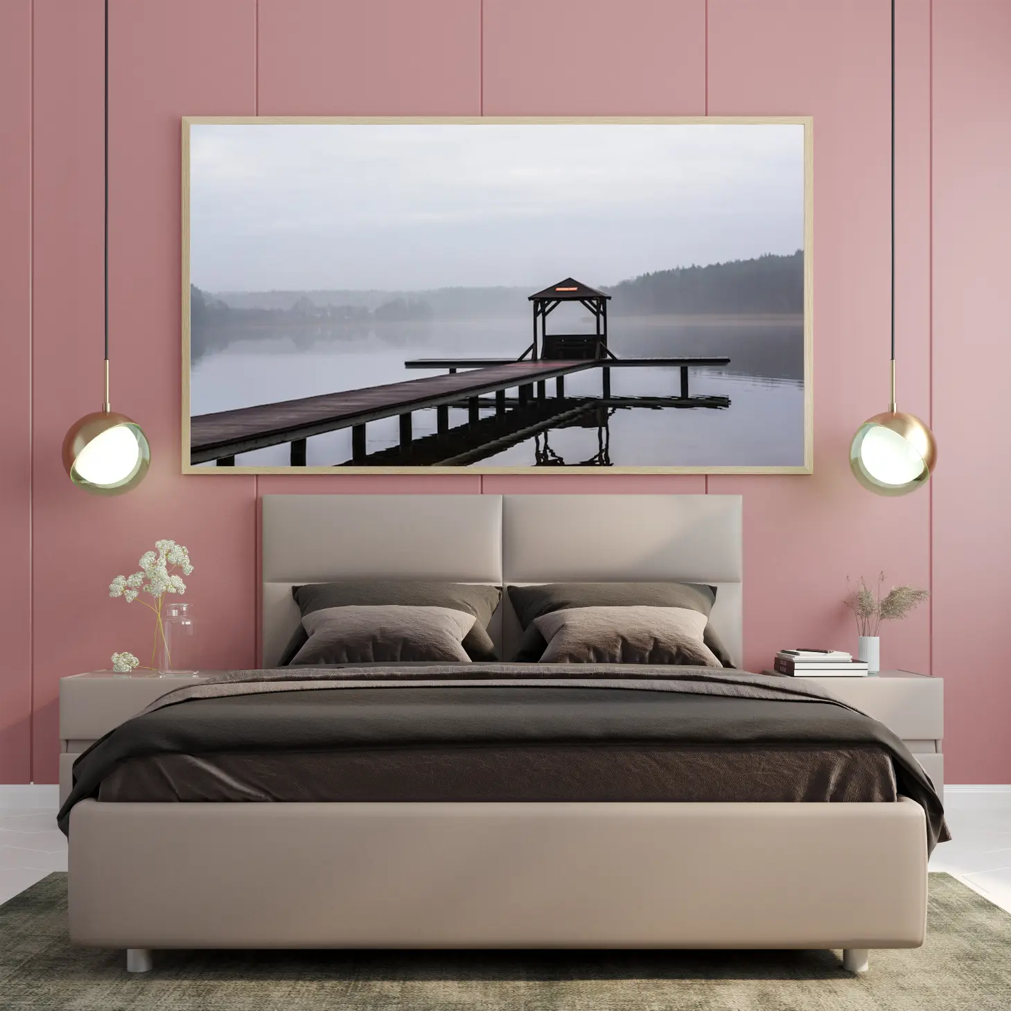 تجسد هذه اللوحة مشهدًا ساحرًا يعكس جمال الطبيعة في لحظة هادئة، حيث يلتقي الماء بالسماء في تناغم مثالي. يظهر الرصيف الخشبي الذي يمتد نحو الأفق، محاطًا بضباب خفيف يضفي على المكان هالة من الغموض والسكون. تعكس الألوان الهادئة والدرجات الرمادية شعورًا بالسكينة، مما يجعلها خيارًا مثاليًا لإضفاء جو من الهدوء والراحة على أي مساحة.