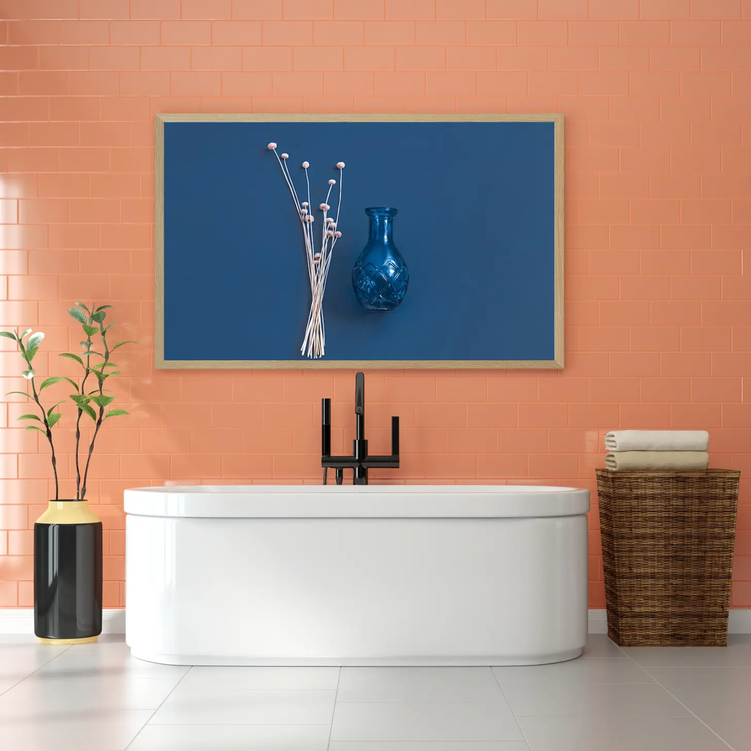 لوحة طبيعة هادئة – زهرات في مزهرية زجاجية – خلفية زرقاء – هادئ – لوحات فن عصري – لوحات كانفاس