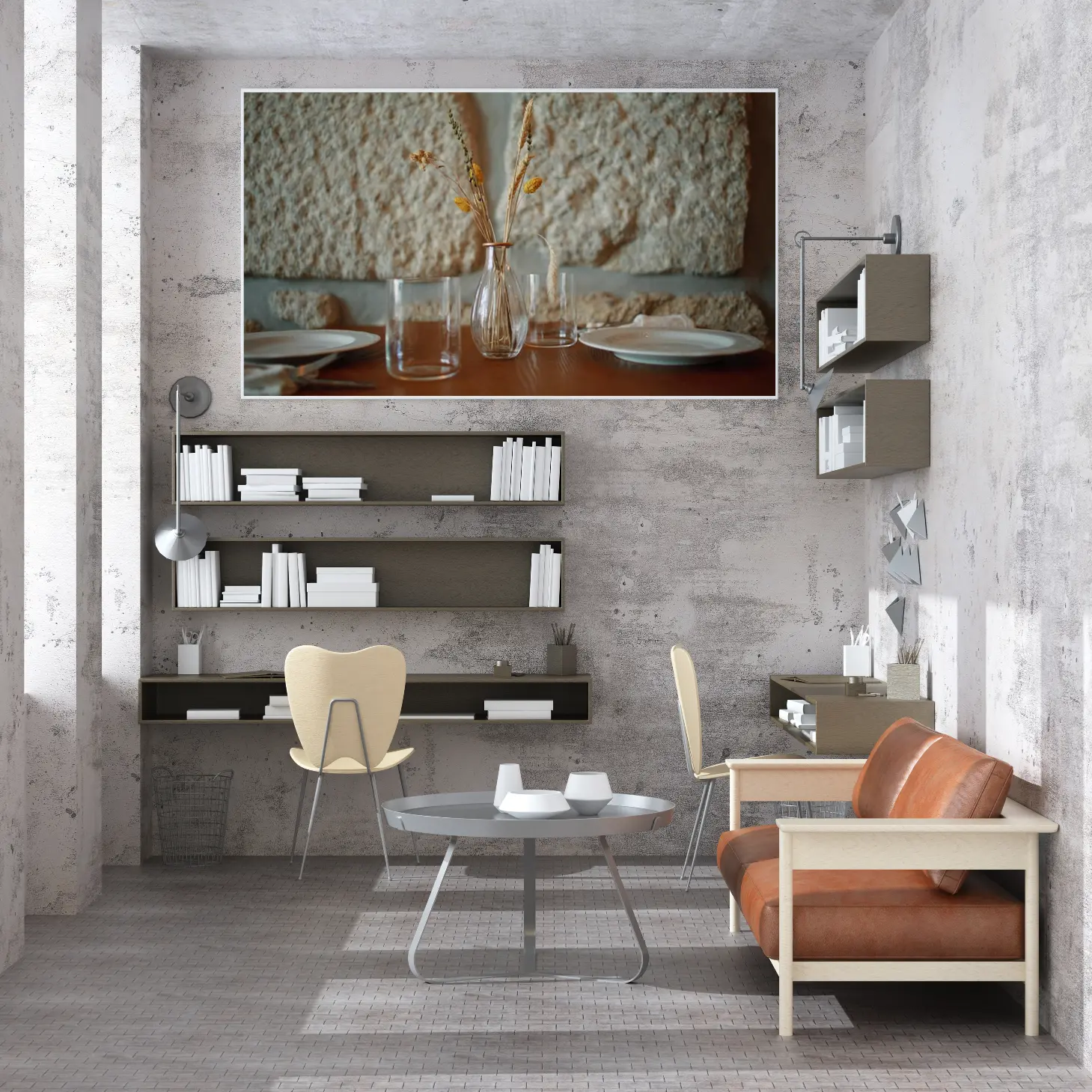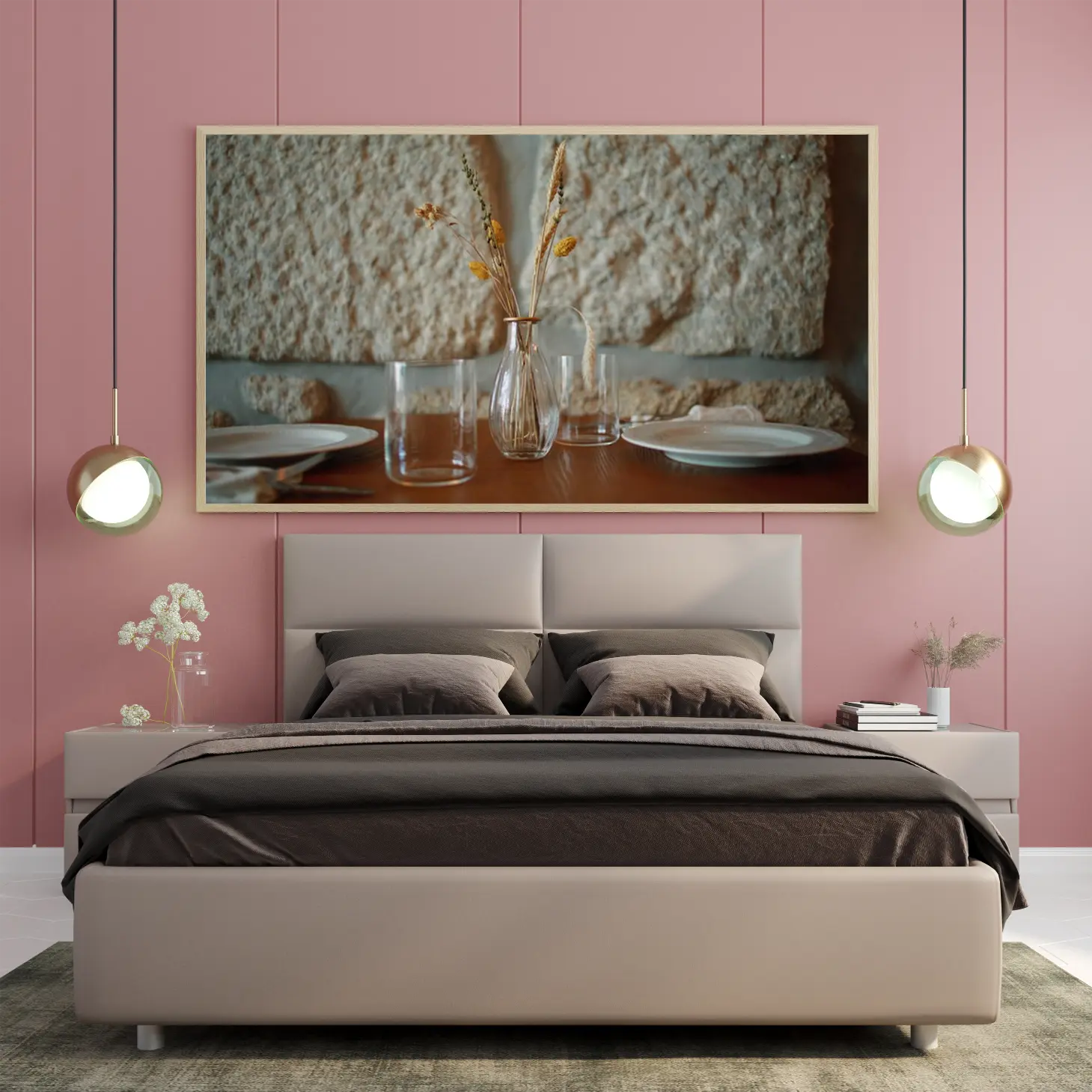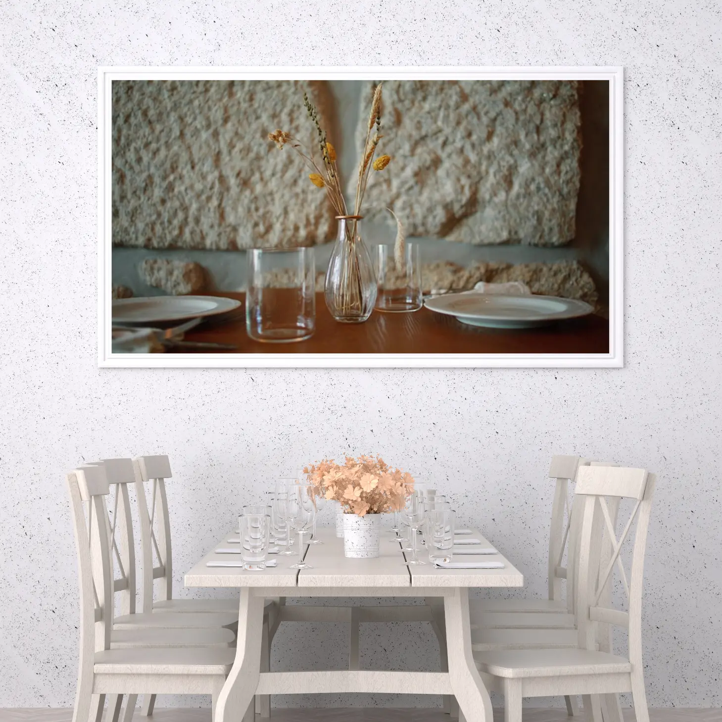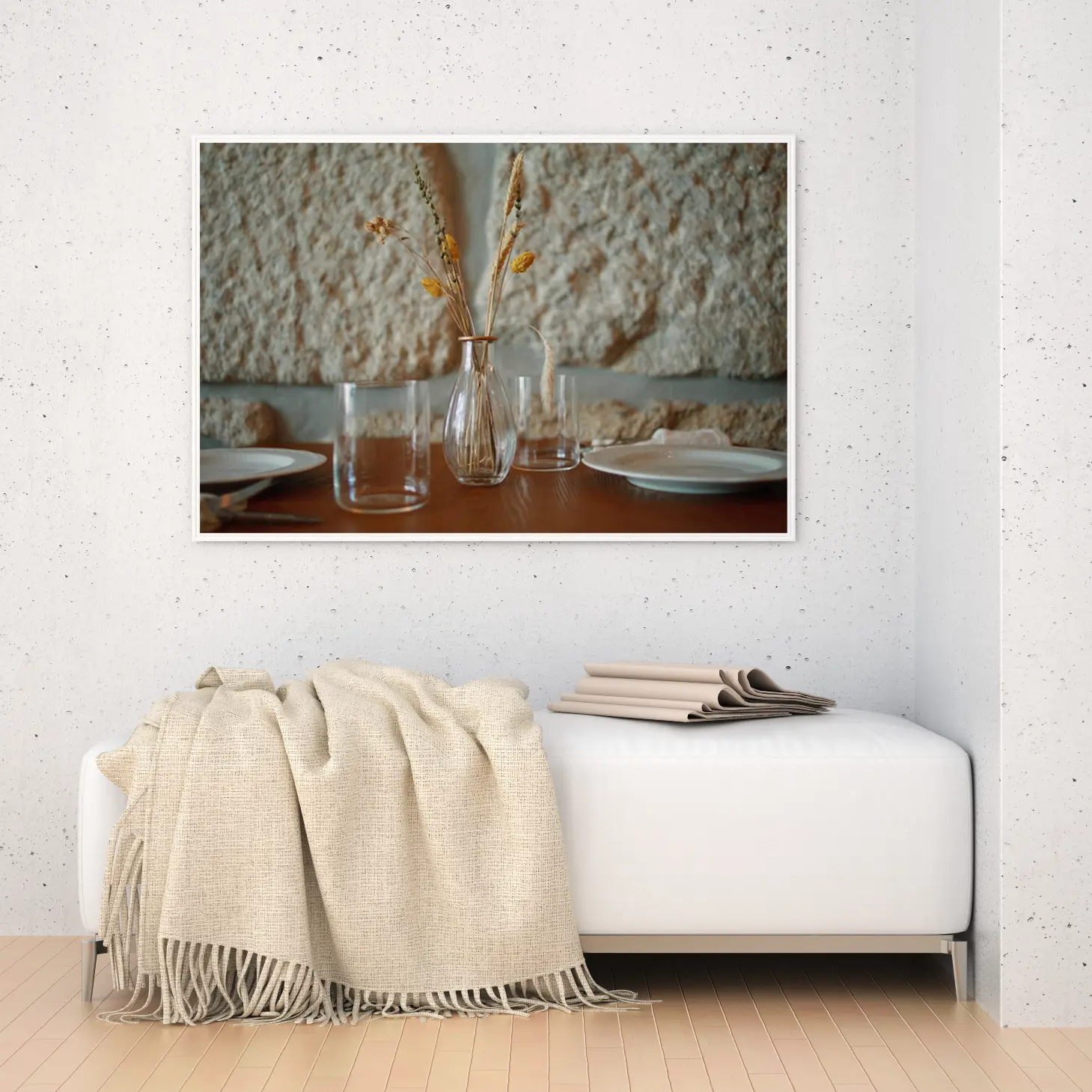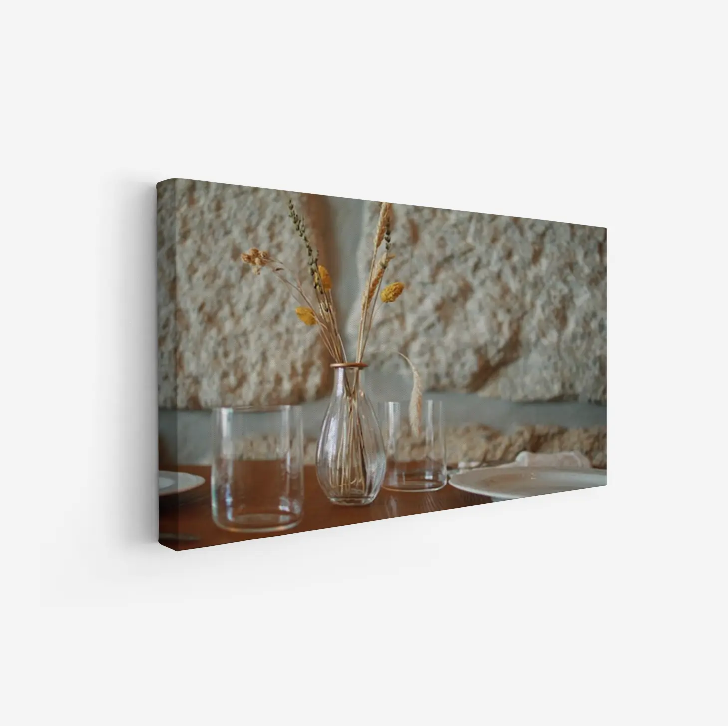 تتجلى في هذه اللوحة جمالية فريدة تعكس أجواء دافئة ومريحة، حيث تتوسطها مزهرية أنيقة تحمل باقة من الأزهار الجافة بألوان دافئة. تضفي الخلفية الحجرية الملمس الطبيعي لمسة من الأصالة، مما يجعل المشهد ينبض بالحياة ويعكس أسلوب حياة هادئ ومتناغم. إن هذه القطعة الفنية ليست مجرد ديكور جداري، بل هي استثمار جمالي يضيف لمسة من الأناقة إلى أي مساحة.