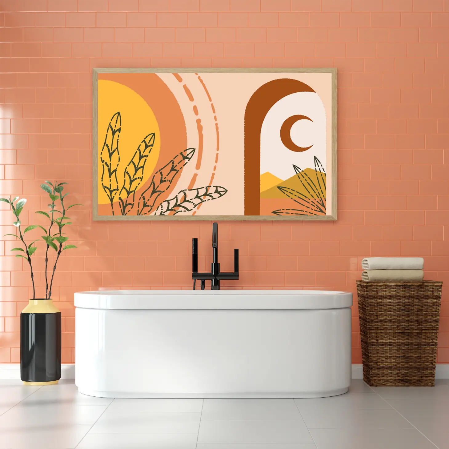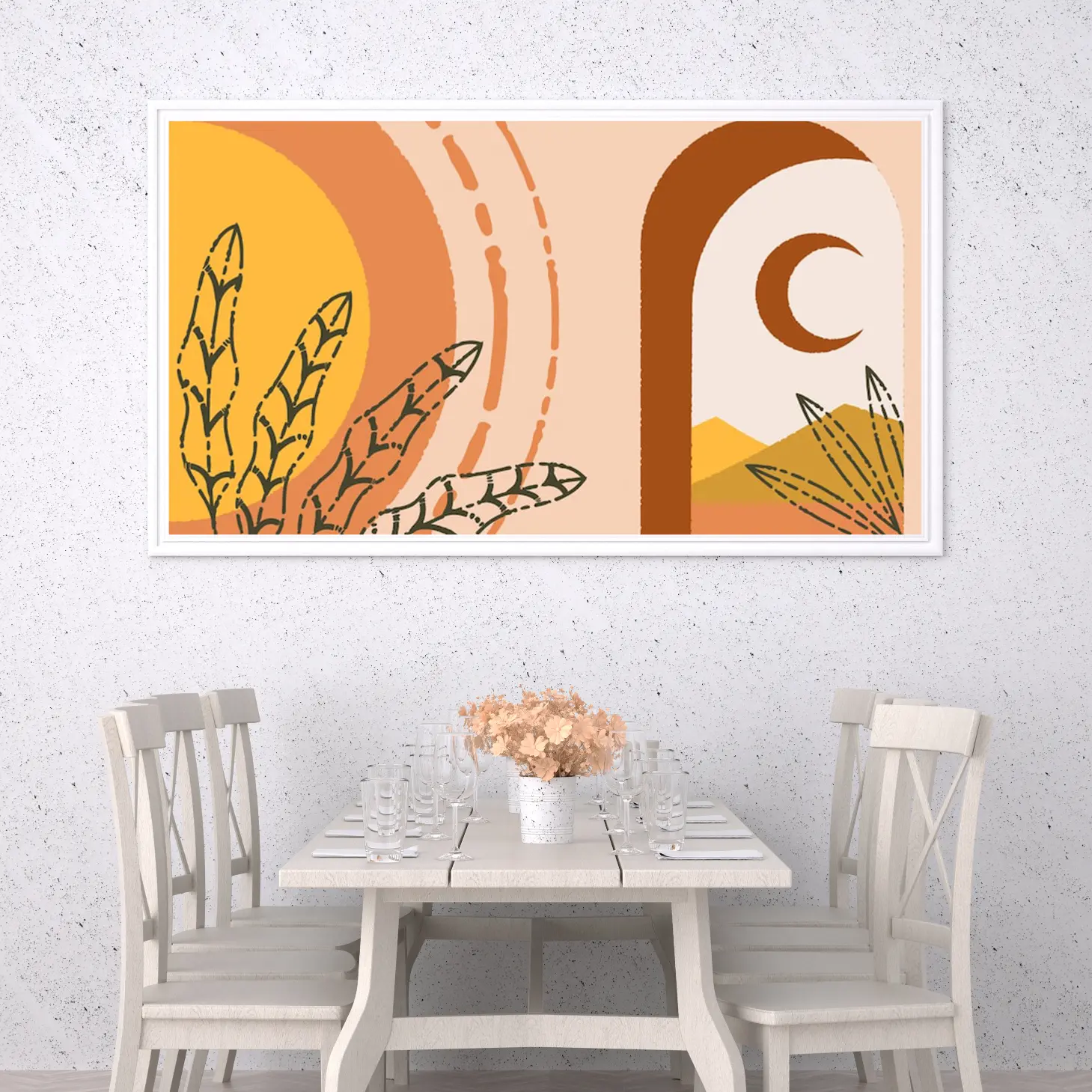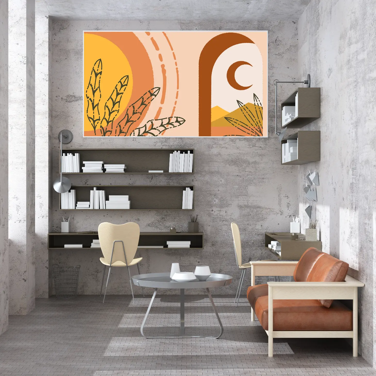 تتجلى في هذه اللوحة الفنية ألوان دافئة وتفاصيل دقيقة تجذب الأنظار، حيث تنسجم الأشكال الهندسية مع العناصر الطبيعية لتخلق توازنًا بصريًا مدهشًا. تعكس الألوان المستخدمة، مثل البرتقالي والذهبي، شعورًا بالدفء والراحة، مما يجعلها خيارًا مثاليًا لإضفاء لمسة من الأناقة على أي مساحة. تساهم هذه القطعة الفنية في تحويل الأجواء، مما يجعل المكان أكثر حيوية وجاذبية، وتعكس أسلوب حياة عصري يتسم بالذوق الرفيع.