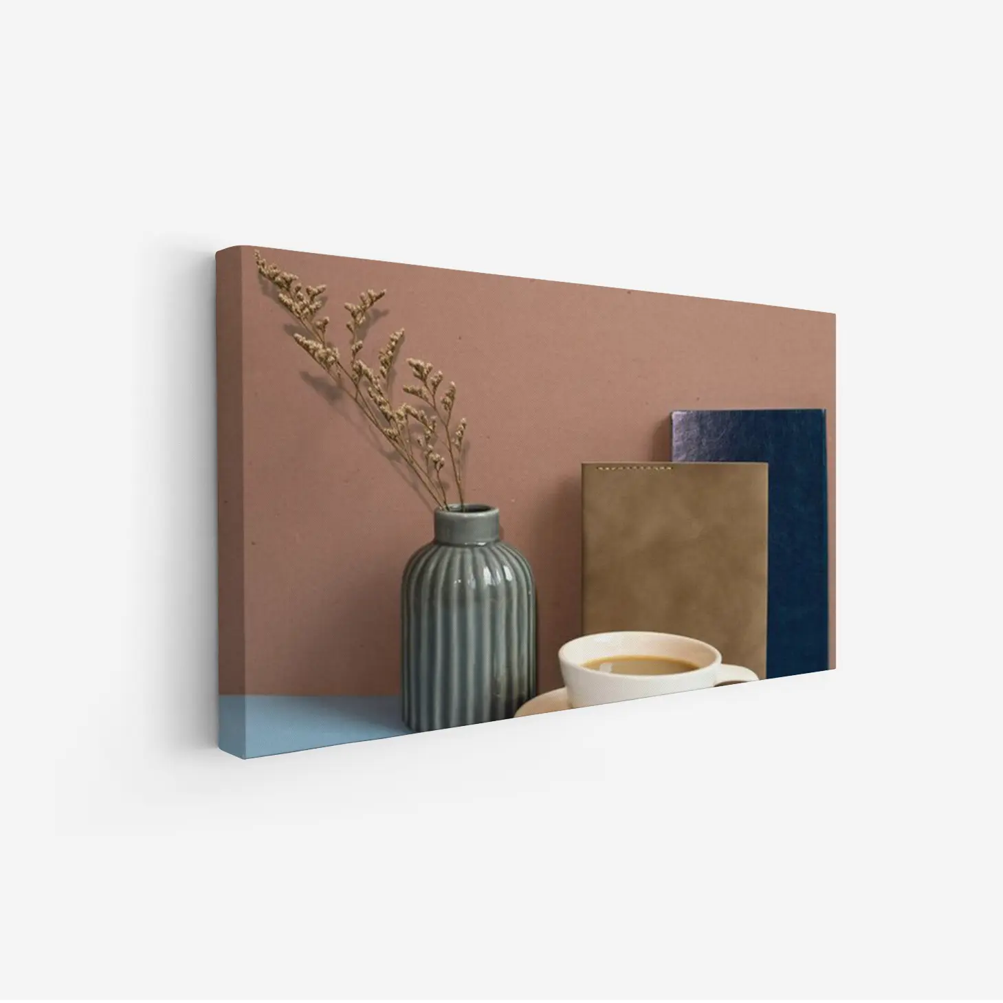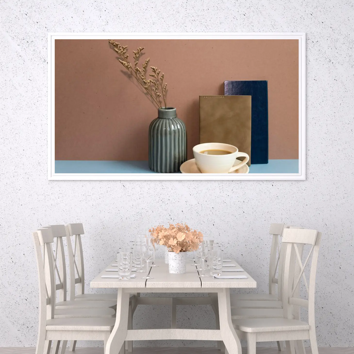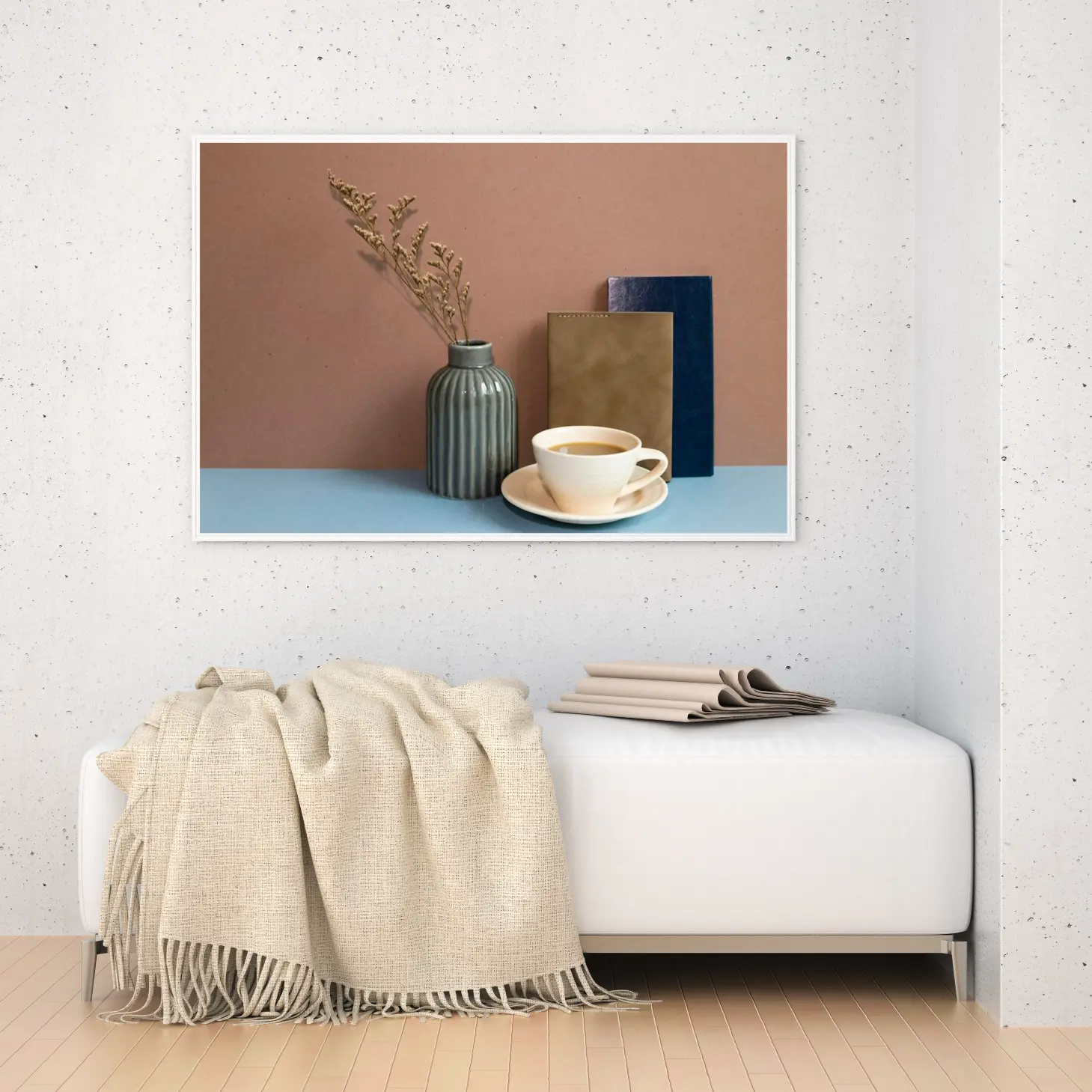 تتجلى في هذه اللوحة الفنية أجواء من الهدوء والسكينة، حيث تتناغم الألوان الدافئة مع العناصر البسيطة لتخلق مشهداً يبعث على الراحة. يبرز الفازة الزجاجية ذات اللون الرمادي، التي تحتضن غصنًا من الزهور الجافة، في تناغم مع خلفية بلون الطين الدافئ. تعكس هذه العناصر أسلوب حياة عصري يجمع بين البساطة والأناقة، مما يجعلها إضافة مثالية لأي مساحة.