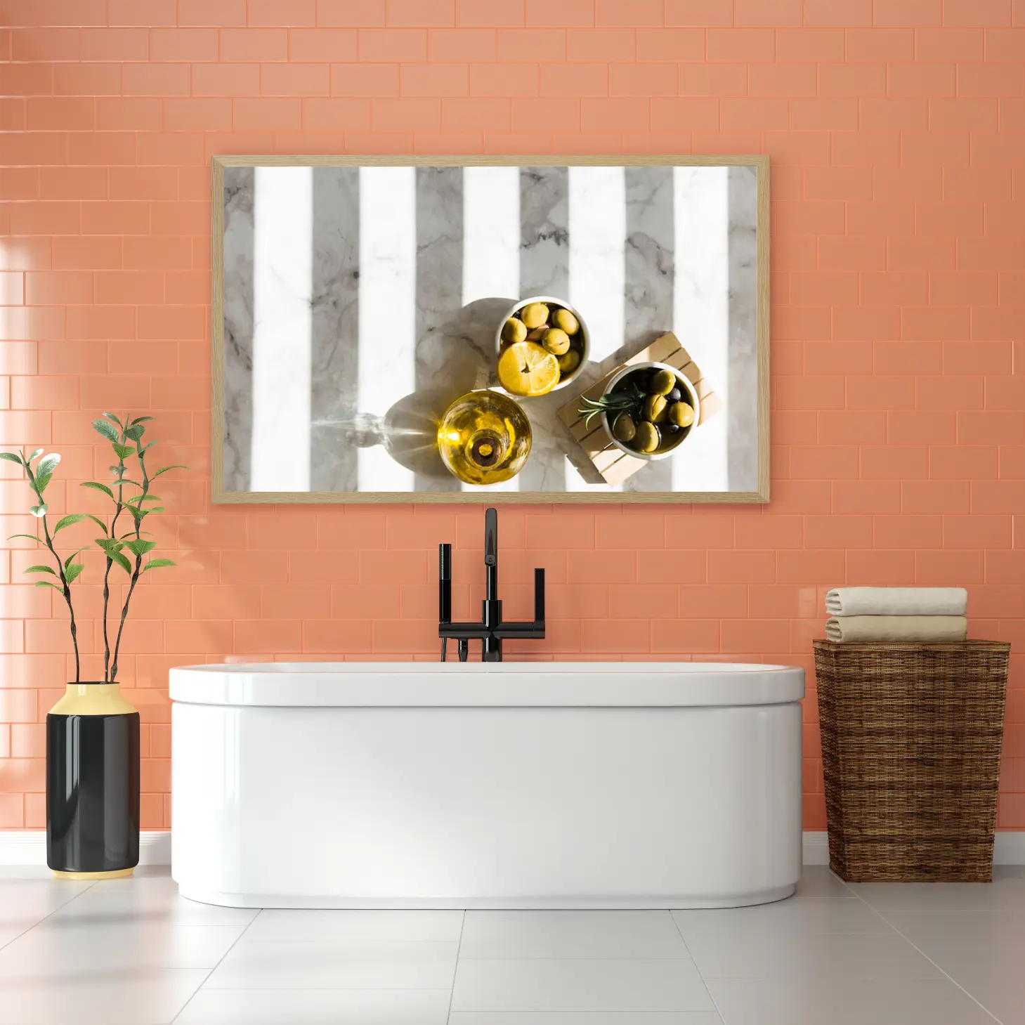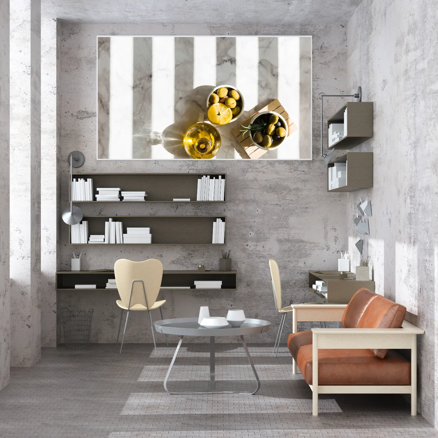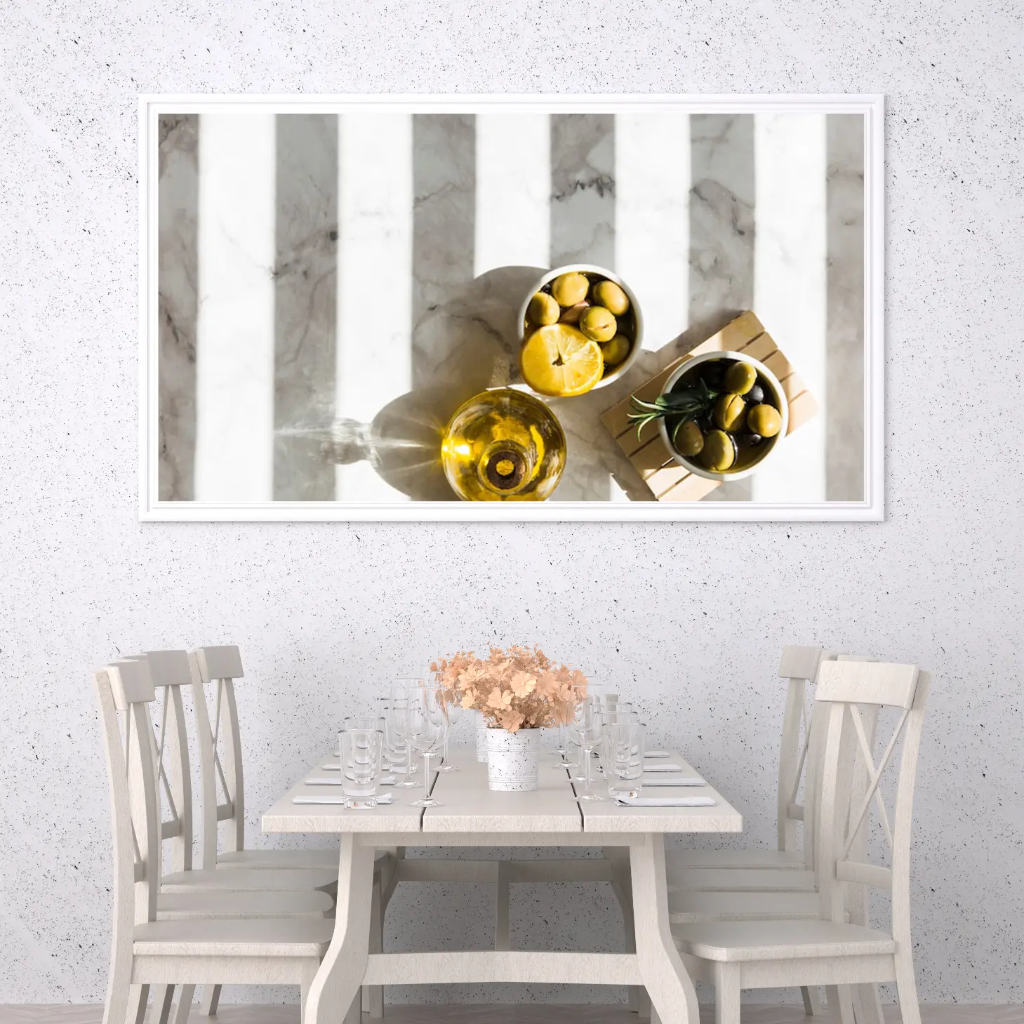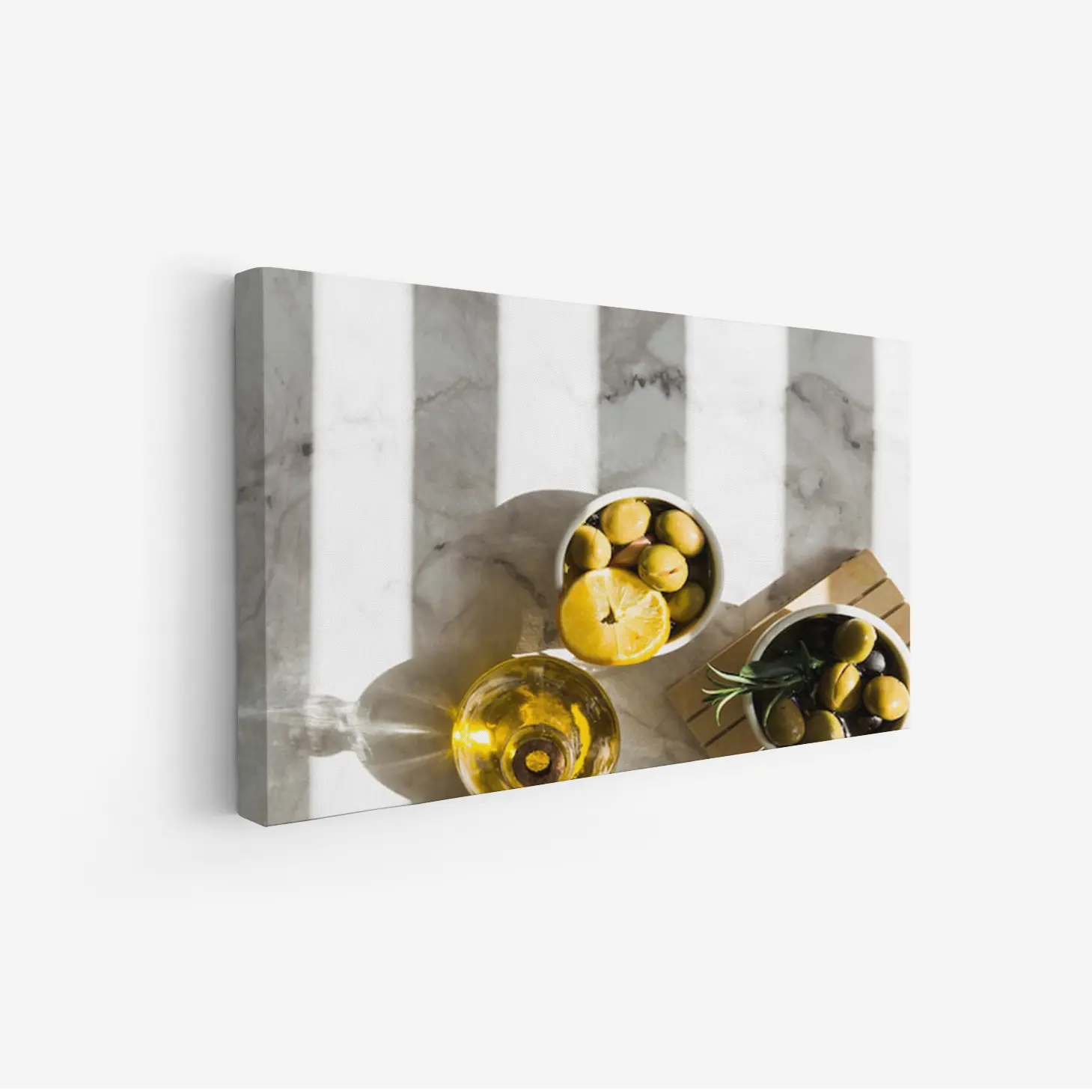 تتجلى في هذه اللوحة الفنية لمسة من الأناقة العصرية، حيث تتناغم الألوان الطبيعية مع الأشكال البسيطة لتخلق أجواءً دافئة ومريحة. تعكس الصورة مشهدًا ساحرًا يتضمن زجاجة زيت زيتون، ووعاءً مليئًا بالليمون، وآخر بالزيتون، مما يضفي شعورًا بالانتعاش والحيوية. إن هذا العمل الفني ليس مجرد ديكور جداري، بل هو استثمار جمالي يضيف لمسة من الفخامة إلى أي مساحة، مما يجعله خيارًا مثاليًا لمن يسعى إلى تحسين نمط حياته.