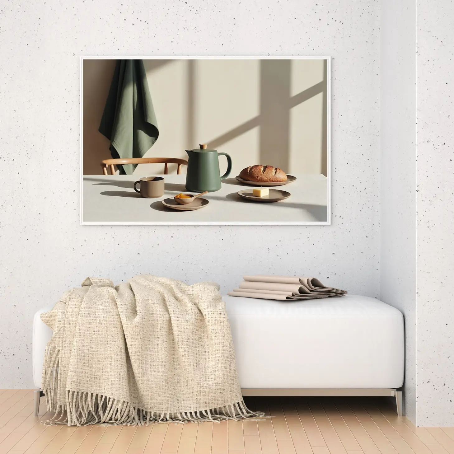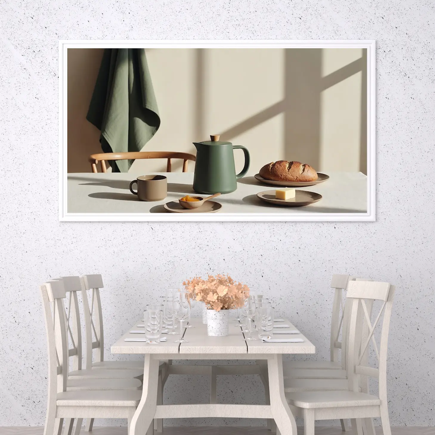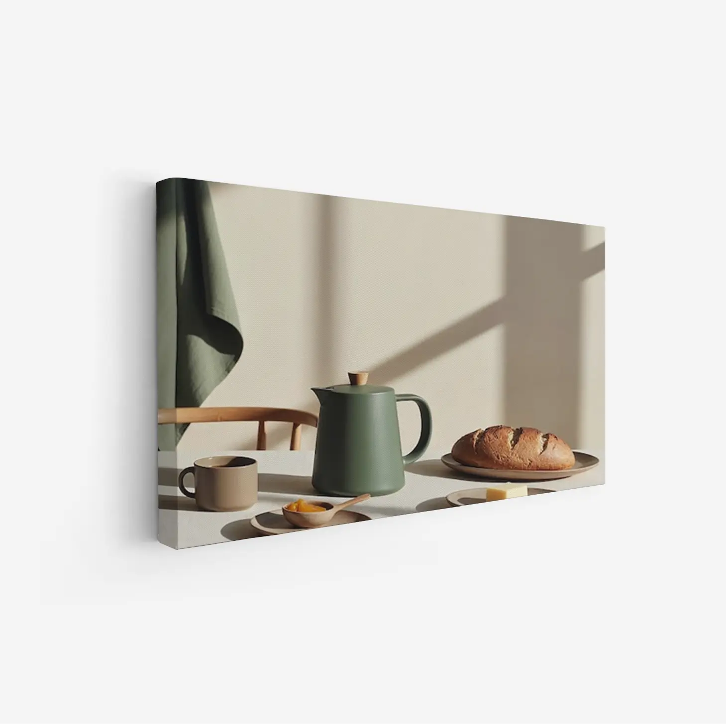 تجسد هذه اللوحة لحظة من الهدوء والجمال، حيث تتناغم الألوان الدافئة مع الضوء الطبيعي الذي يتسلل عبر النوافذ، مما يخلق أجواءً مريحة ومليئة بالسكينة. تتوسط المشهد مجموعة من الأواني الأنيقة، بما في ذلك إبريق شاي بلون أخضر عميق وكوب صغير بلون ترابي، مما يعكس أسلوب حياة عصري ومبسط. يضفي الخبز الطازج والمكونات الأخرى لمسة من الدفء، مما يجعل هذه اللوحة خيارًا مثاليًا لتزيين أي مساحة.