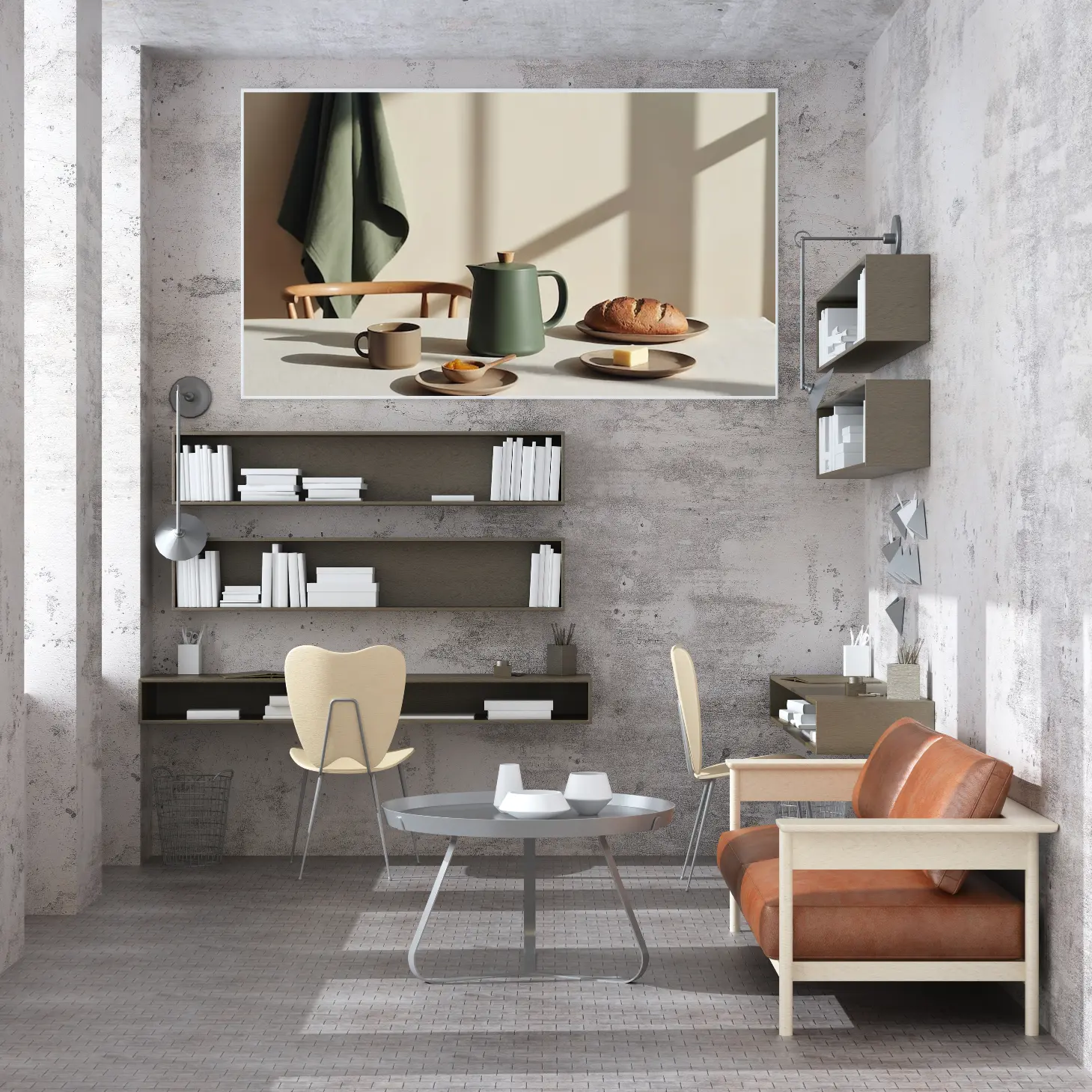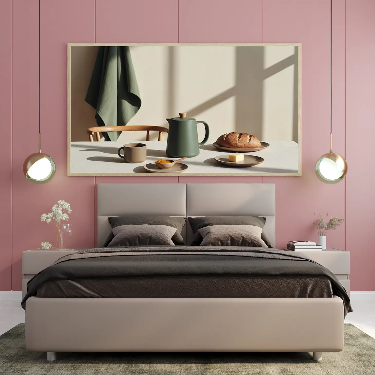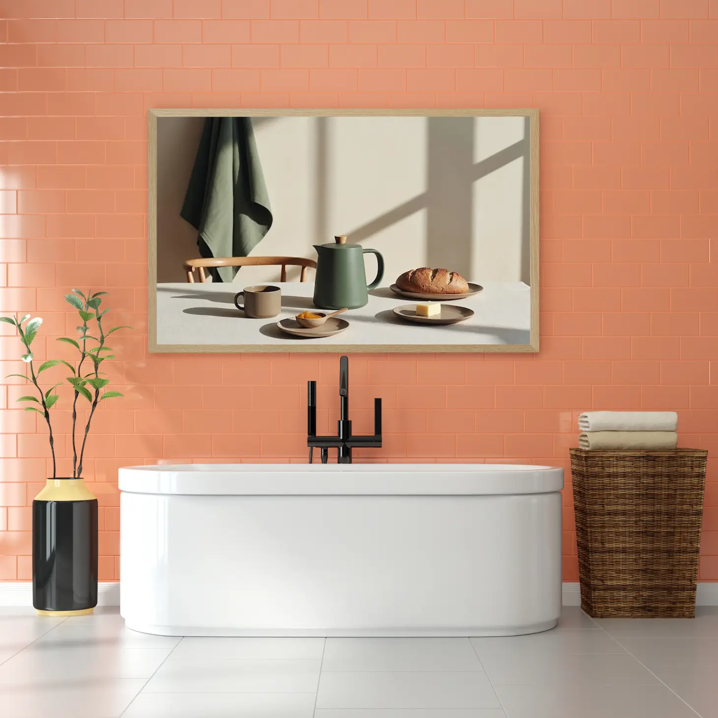 تجسد هذه اللوحة لحظة من الهدوء والجمال، حيث تتناغم الألوان الدافئة مع الضوء الطبيعي الذي يتسلل عبر النوافذ، مما يخلق أجواءً مريحة ومليئة بالسكينة. تتوسط المشهد مجموعة من الأواني الأنيقة، بما في ذلك إبريق شاي بلون أخضر عميق وكوب صغير بلون ترابي، مما يعكس أسلوب حياة عصري ومبسط. يضفي الخبز الطازج والمكونات الأخرى لمسة من الدفء، مما يجعل هذه اللوحة خيارًا مثاليًا لتزيين أي مساحة.