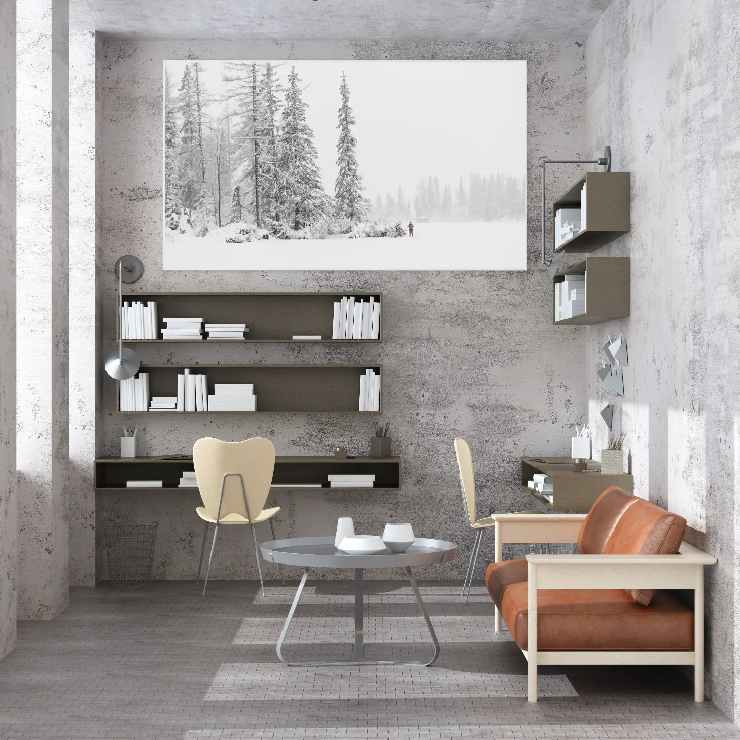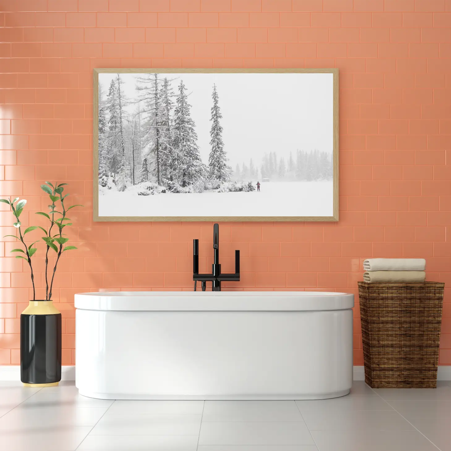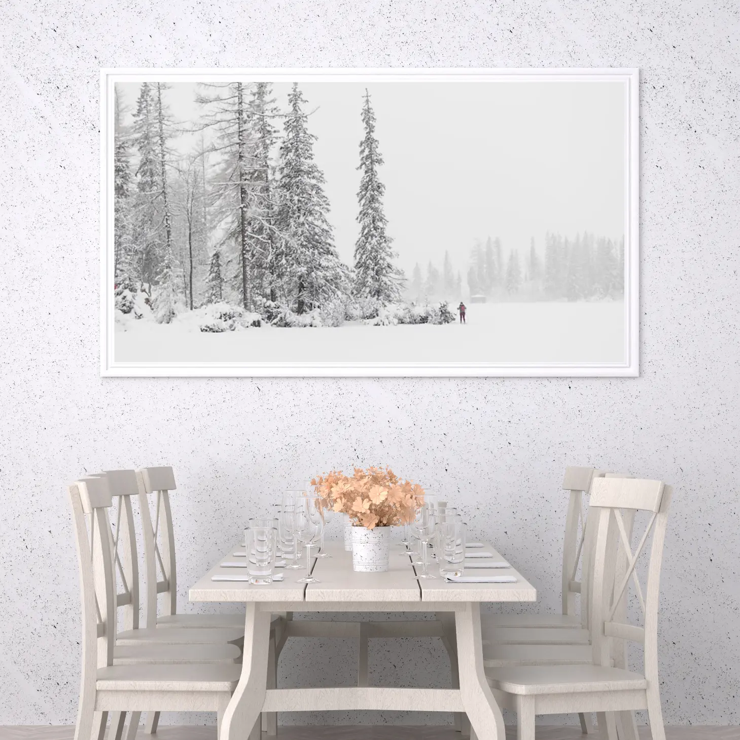 تجسد هذه اللوحة جمال الطبيعة في أبهى صوره، حيث تتناغم الألوان الهادئة مع المشهد الثلجي الساحر. تخلق الأجواء الهادئة إحساسًا بالسكينة والراحة، مما يجعلها إضافة مثالية لأي مساحة. تبرز التفاصيل الدقيقة للأشجار المغطاة بالثلوج، مما يضفي عمقًا وثراءً على المشهد، ويعكس نمط حياة متوازن يقدّر الجمال الطبيعي.