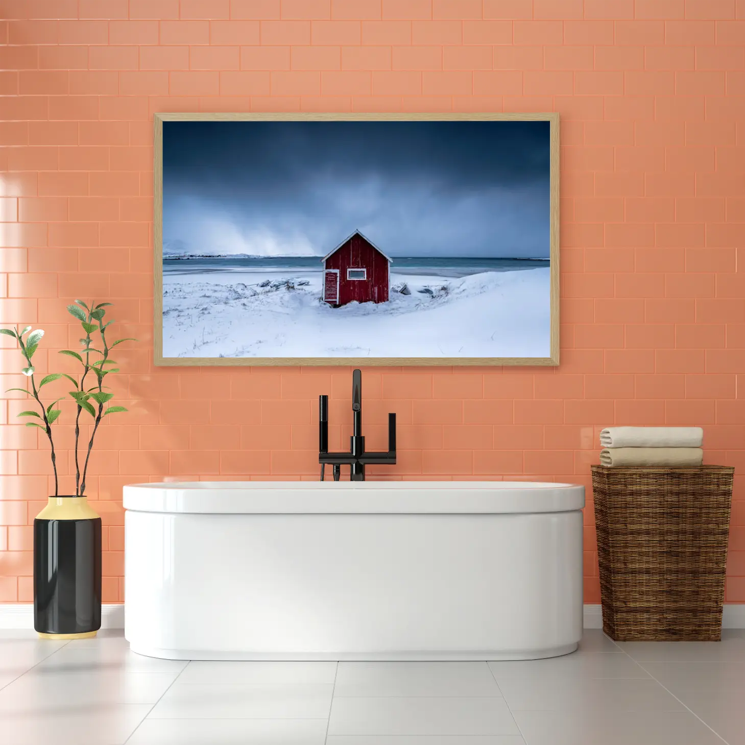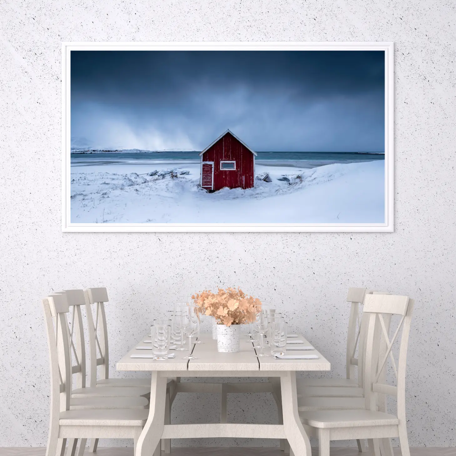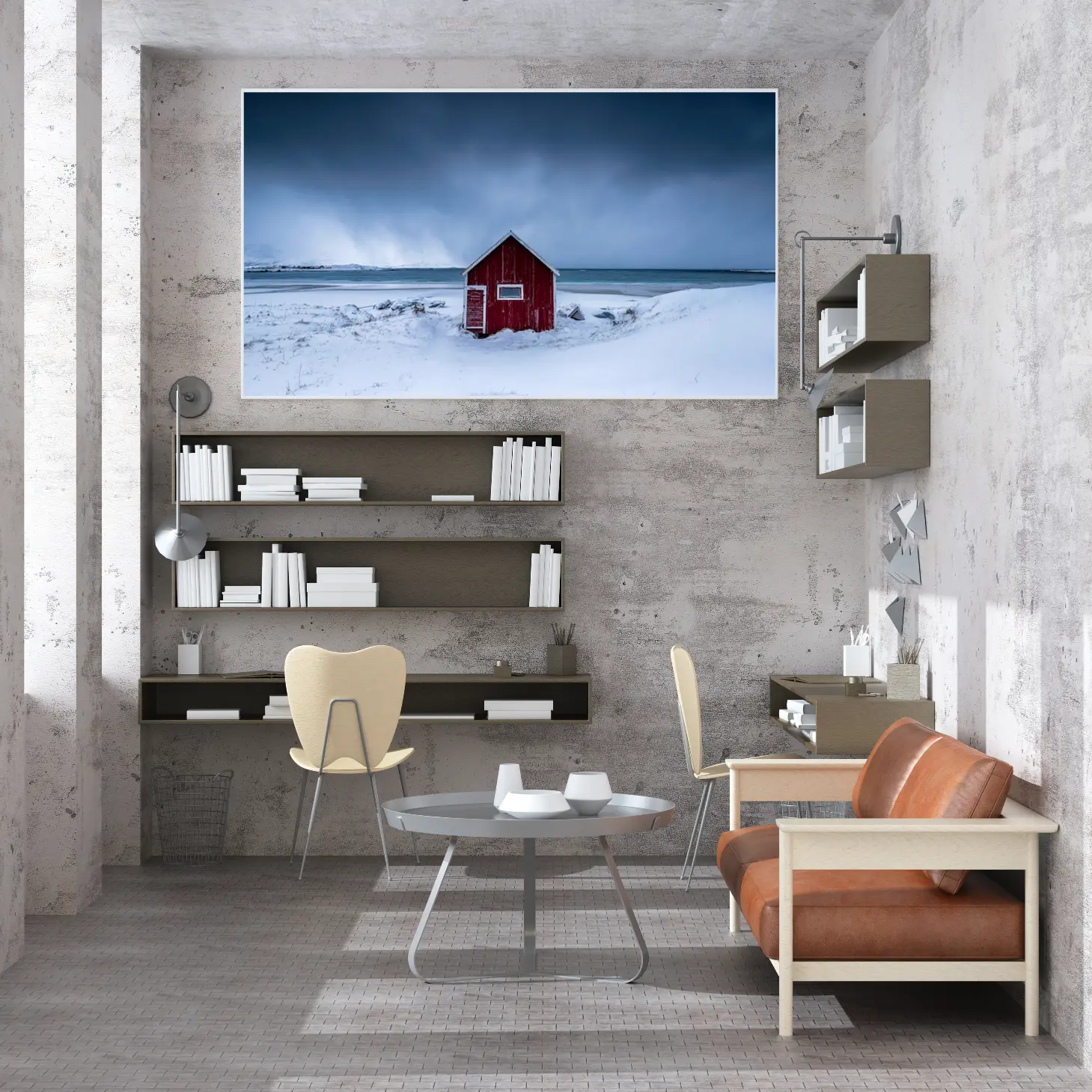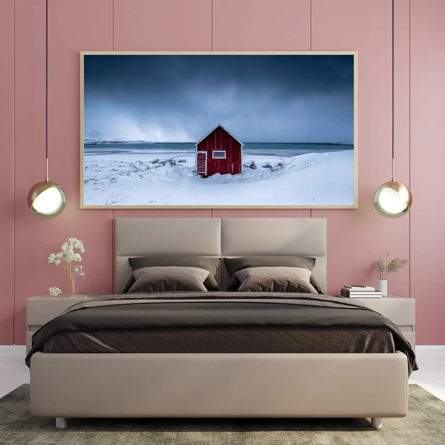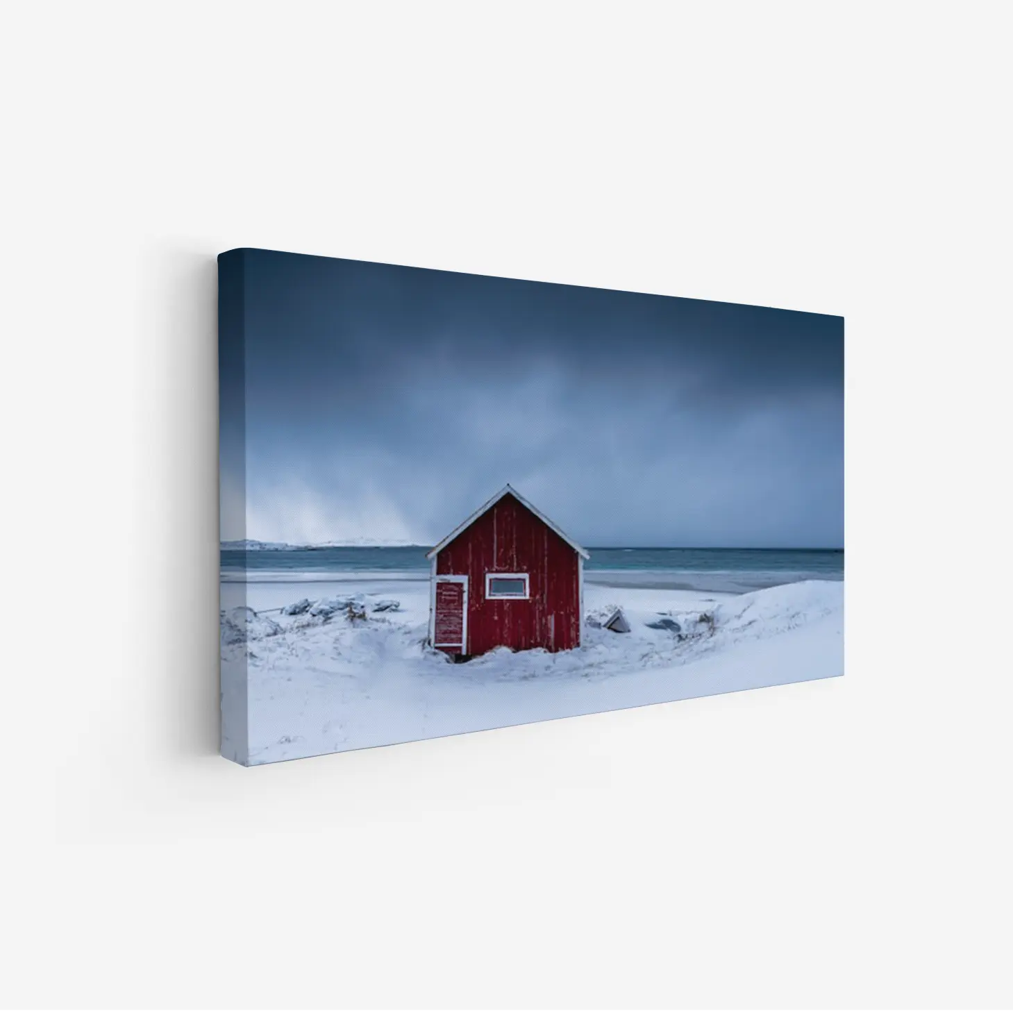 لوحة طبيعة هادئة مع كوخ أحمر وسط الثلوج والمياه الزرقاء تحت سماء غائمة، لوحات طبيعة، لوحات كانفاس.