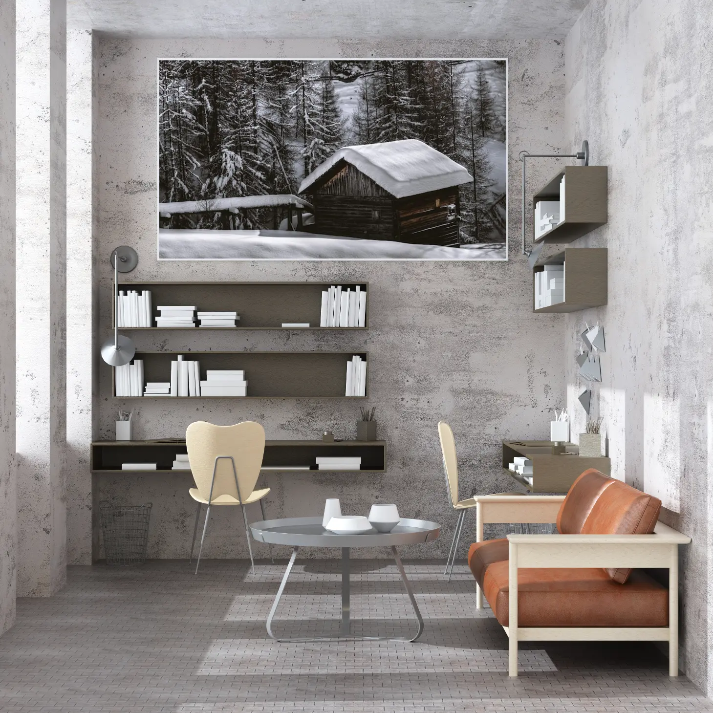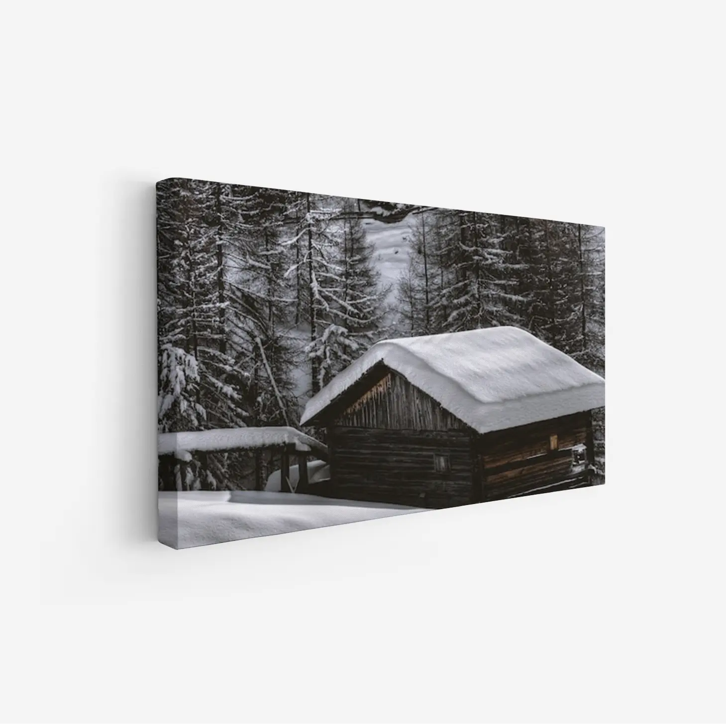 لوحة طبيعة هادئة مع كوخ خشبي محاط بأشجار مغطاة بالثلوج، أجواء هادئة وساحرة، لوحات طبيعة، لوحات كانفاس.